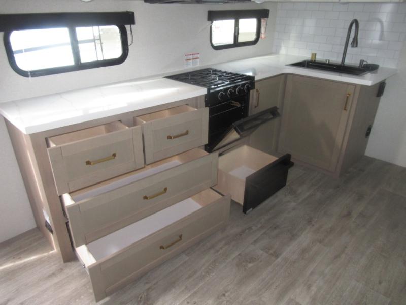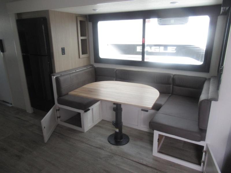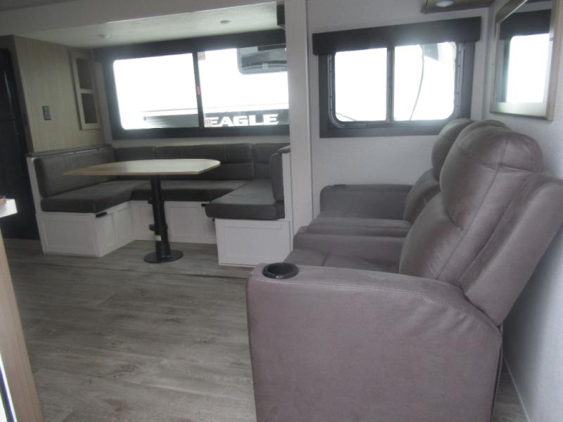 With any Eagle HT fifth wheel or travel trailer by Jayco you will enjoy a smooth drive thanks to the 4 Star Handling Package and MORryde CRE-3000 rubberized suspension. The Customer Value Package includes amenities that are sure to make camping easier than ever, like the 60K on-demand water heater, Keyed-Alike lock system, 15,000 BTU "Whisper Quiet" A/C, and more. Handcrafted door/drawer fronts will make your space feel more like home, along with residential vinyl flooring throughout, GE appliances, and blackout roller shades with reflective side throughout to keep the sun out when you want to sleep in. Each model also includes a NuVo H2O water treatment system with filters included, interior and exterior "Blue Sync" audio connect with MB Quart Sound for your TV and phone, and 100% no floor vents for added comfort and convenience!