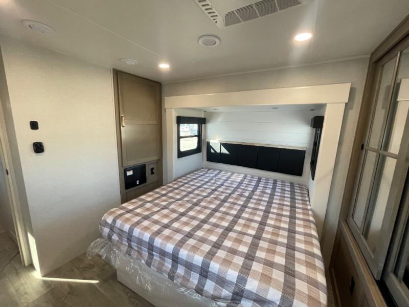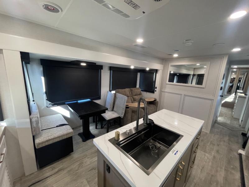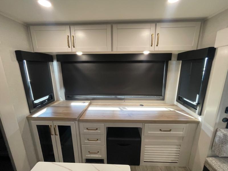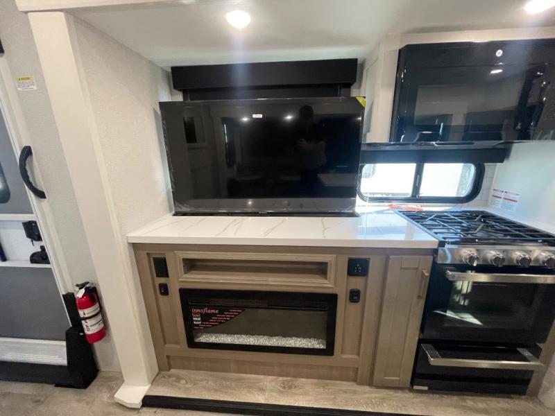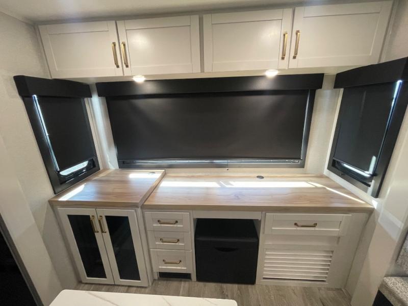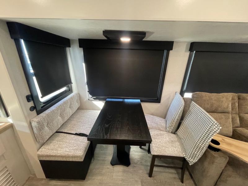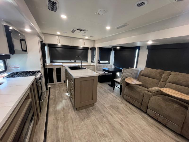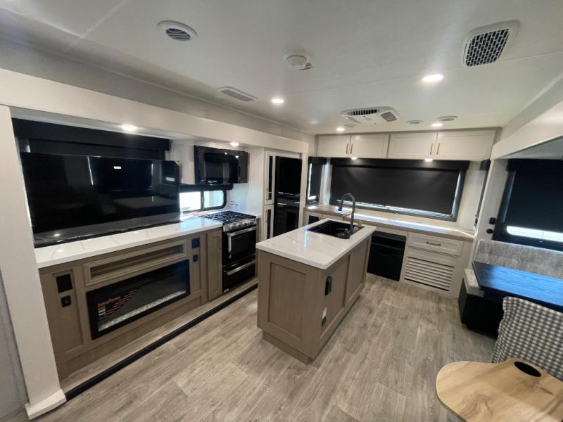 You will feel right at home camping in this travel trailer! It features a front private bedroom with an Olympic queen bed slide for more interior space, a dresser, a front wardrobe to hang your clothes, and a wardrobe with washer and dryer prep. Start each morning getting squeaky clean in the full bathroom with the shower, then head to the kitchen to fry up some eggs on the stainless steel range. The kitchen island provides more counter space to prep meals, and there are two pantries for dry goods and snacks. There is also a table and chairs with a bench seat plus a tri-fold sofa within the large slide out. And a desk with a bench seat lets you get some work done!