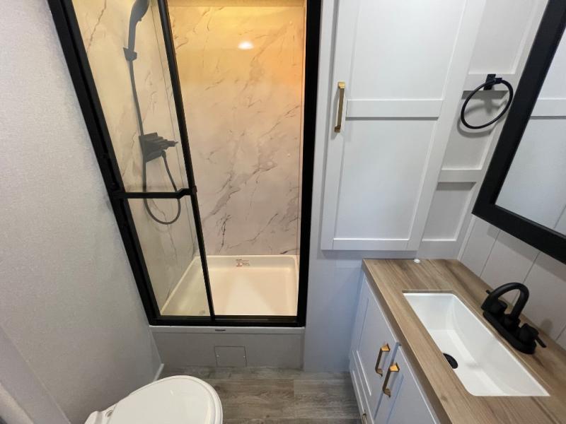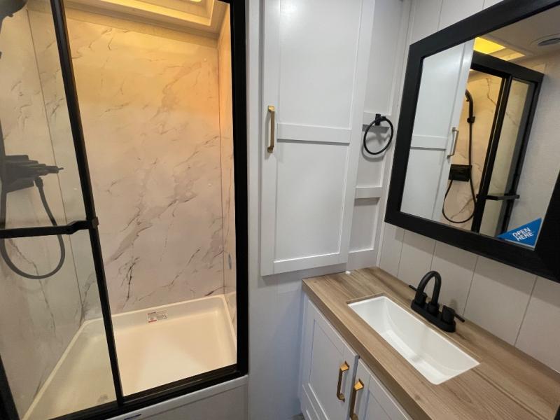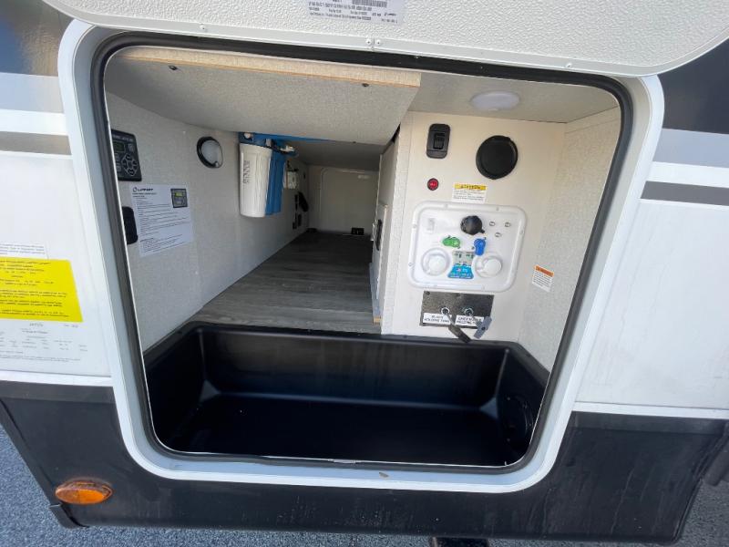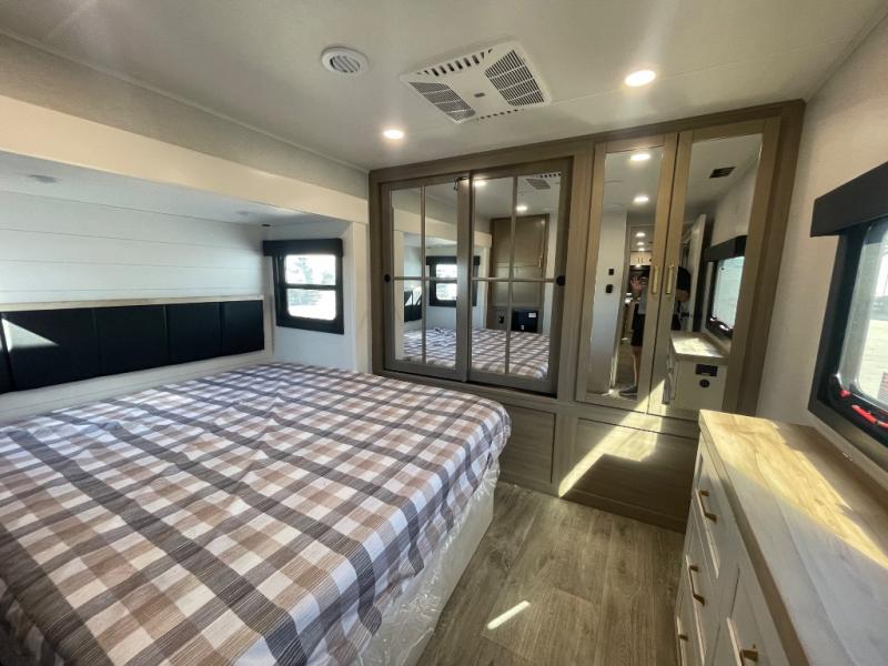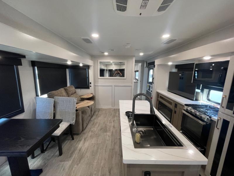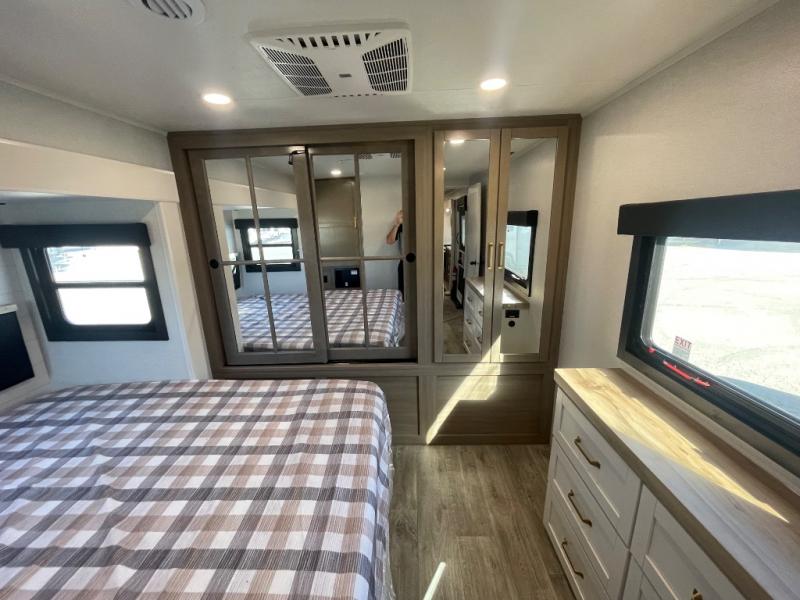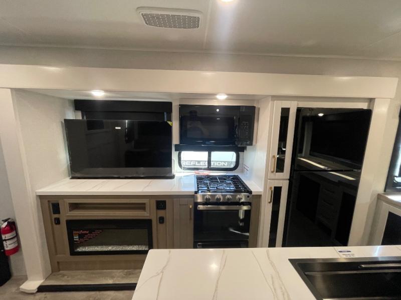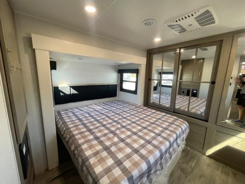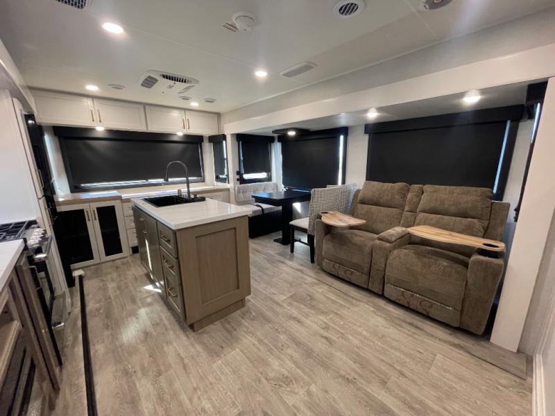 You will feel right at home camping in this travel trailer! It features a front private bedroom with an Olympic queen bed slide for more interior space, a dresser, a front wardrobe to hang your clothes, and a wardrobe with washer and dryer prep. Start each morning getting squeaky clean in the full bathroom with the shower, then head to the kitchen to fry up some eggs on the stainless steel range. The kitchen island provides more counter space to prep meals, and there are two pantries for dry goods and snacks. There is also a table and chairs with a bench seat plus a tri-fold sofa within the large slide out. And a desk with a bench seat lets you get some work done!