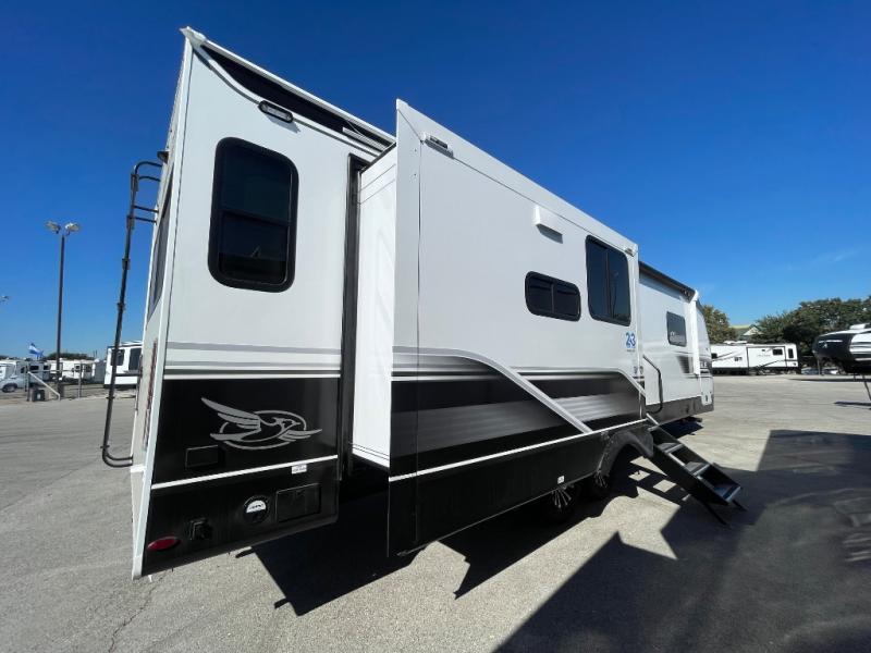With any Eagle HT fifth wheel or travel trailer by Jayco you will enjoy a smooth drive thanks to the 4 Star Handling Package and MORryde CRE-3000 rubberized suspension. The Customer Value Package includes amenities that are sure to make camping easier than ever, like the 60K on-demand water heater, Keyed-Alike lock system, 15,000 BTU "Whisper Quiet" A/C, and more. Handcrafted door/drawer fronts will make your space feel more like home, along with residential vinyl flooring throughout, GE appliances, and blackout roller shades with reflective side throughout to keep the sun out when you want to sleep in. Each model also includes a NuVo H2O water treatment system with filters included, interior and exterior "Blue Sync" audio connect with MB Quart Sound for your TV and phone, and 100% no floor vents for added comfort and convenience!