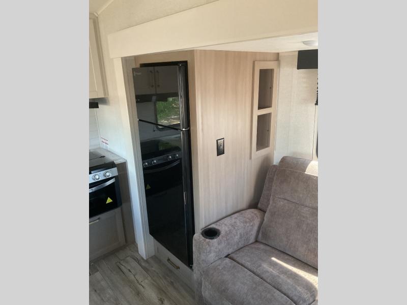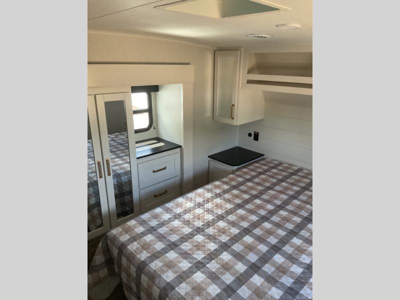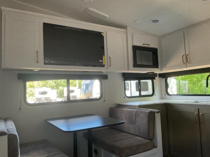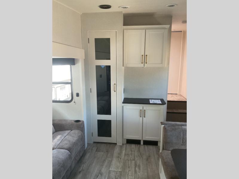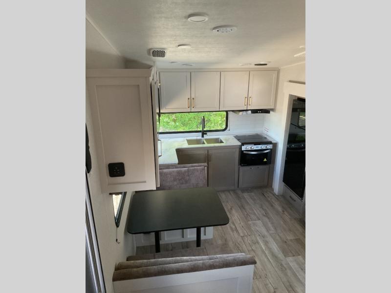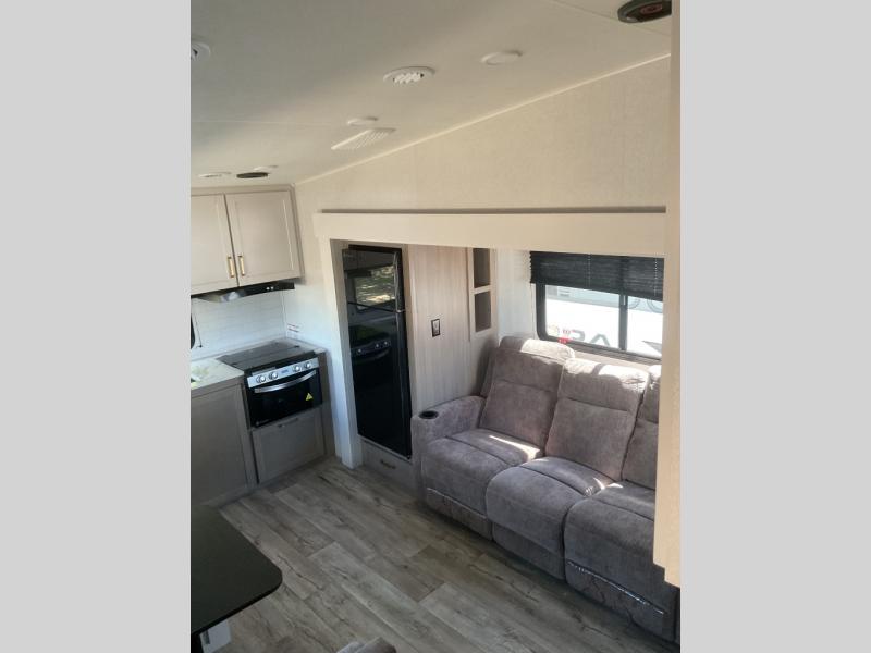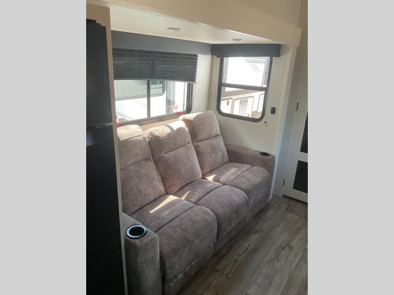 Camping just got a whole lot sweeter in this fifth wheel with double slides, a rear kitchen, and sleeping space for five to six. You'll love waking up each morning in the front private bedroom that includes a queen bed, dual nightstands and overhead cabinets, plus a wardrobe and dresser slide. Your guests who slept on the tri-fold sofa and booth dinette can convert these back to seating space in the morning, and breakfast can be made in the rear kitchen. Here, you'll find ample counter space, a microwave and range, plus a pantry and 12V refrigerator for food storage. Outside, gear can be stored in the pass-thru storage area, and you're sure to enjoy the 16' power awning with LED Lights!