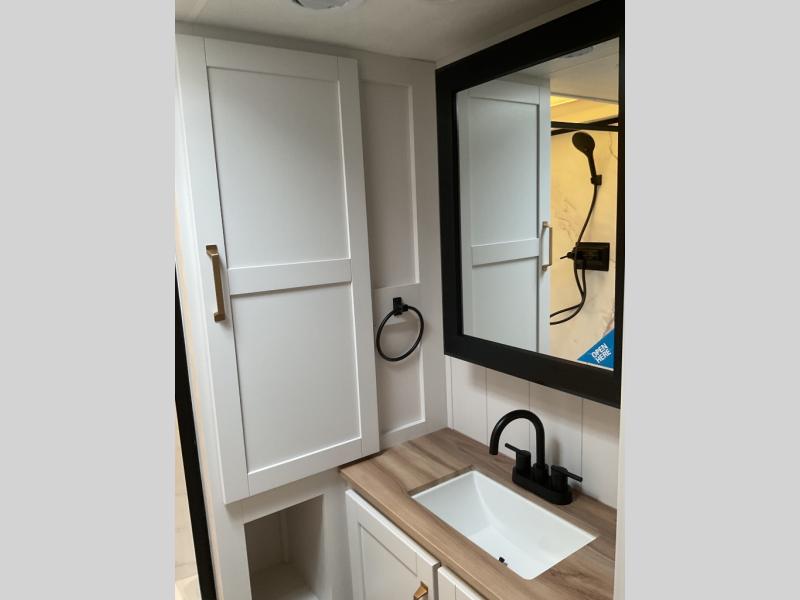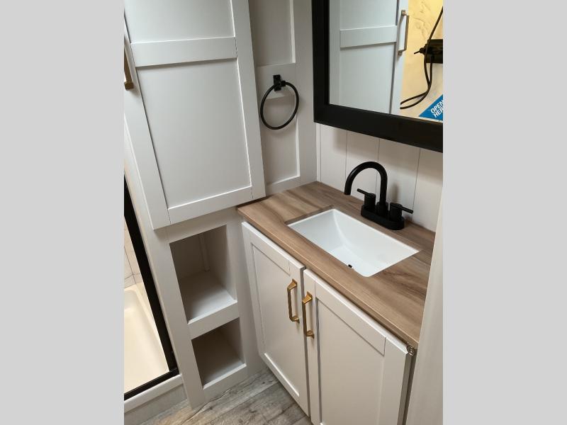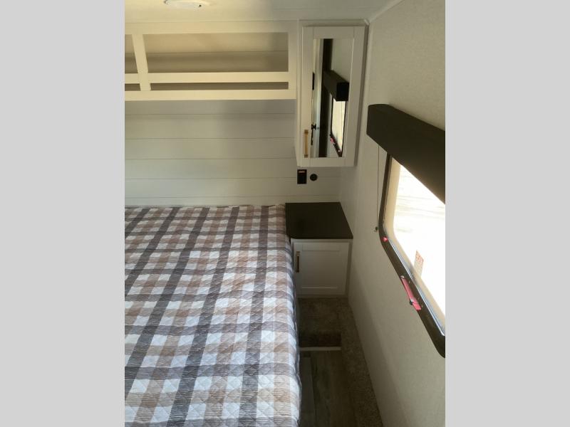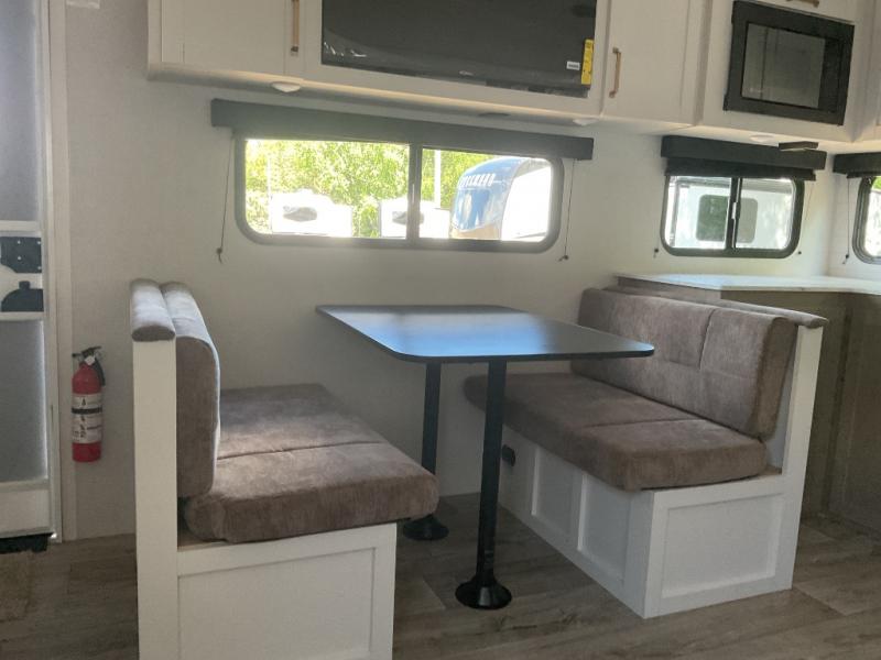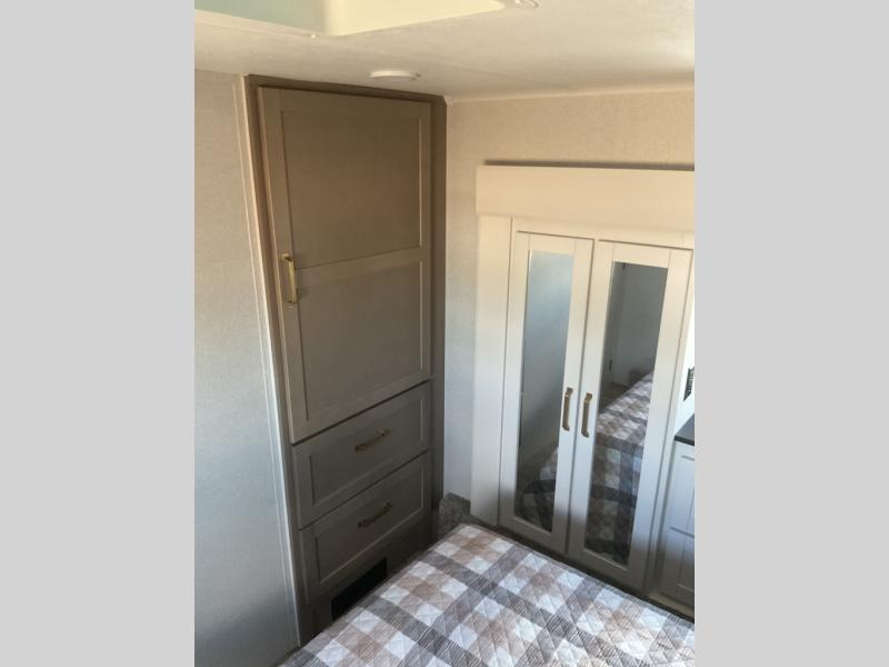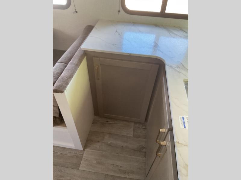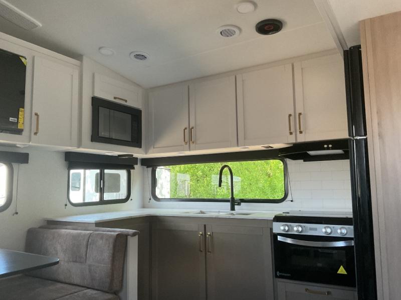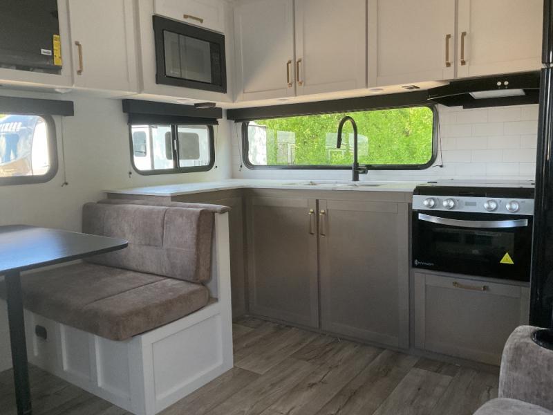 Camping just got a whole lot sweeter in this fifth wheel with double slides, a rear kitchen, and sleeping space for five to six. You'll love waking up each morning in the front private bedroom that includes a queen bed, dual nightstands and overhead cabinets, plus a wardrobe and dresser slide. Your guests who slept on the tri-fold sofa and booth dinette can convert these back to seating space in the morning, and breakfast can be made in the rear kitchen. Here, you'll find ample counter space, a microwave and range, plus a pantry and 12V refrigerator for food storage. Outside, gear can be stored in the pass-thru storage area, and you're sure to enjoy the 16' power awning with LED Lights!