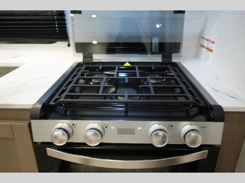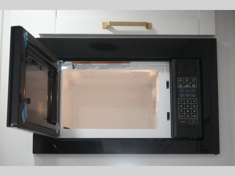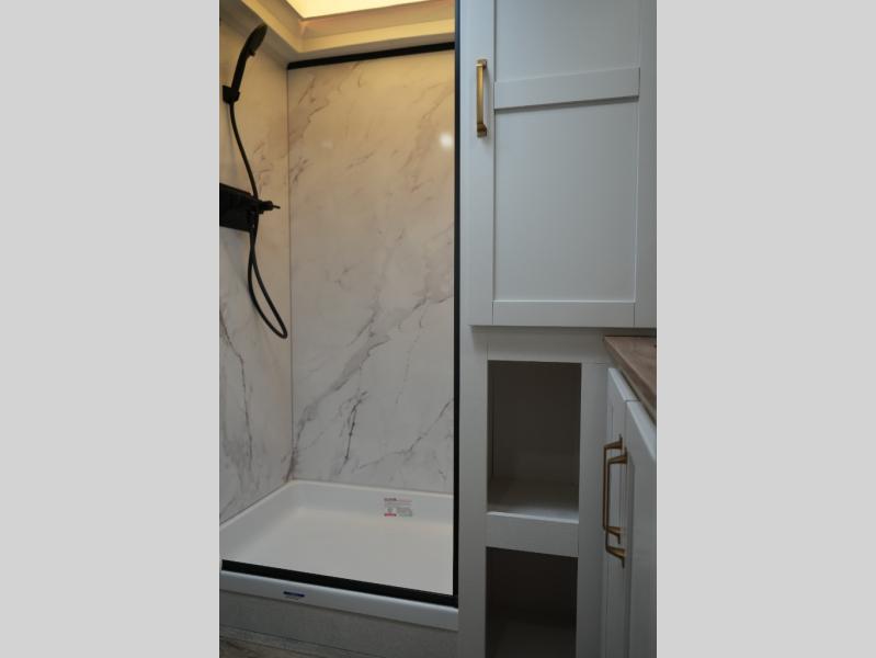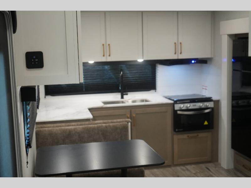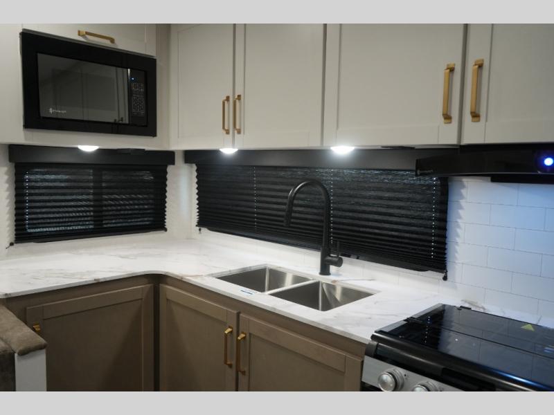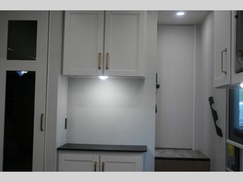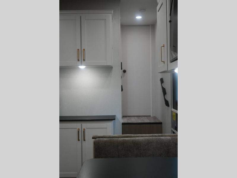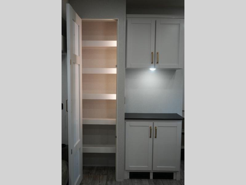 Rear Kitchen Design – Enjoy plenty of counter space, a 12V refrigerator, range, microwave, and a large pantry for all your cooking essentials.