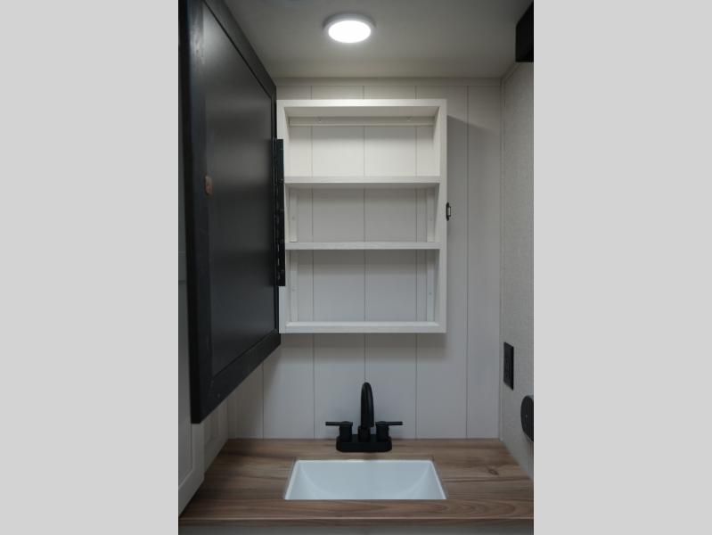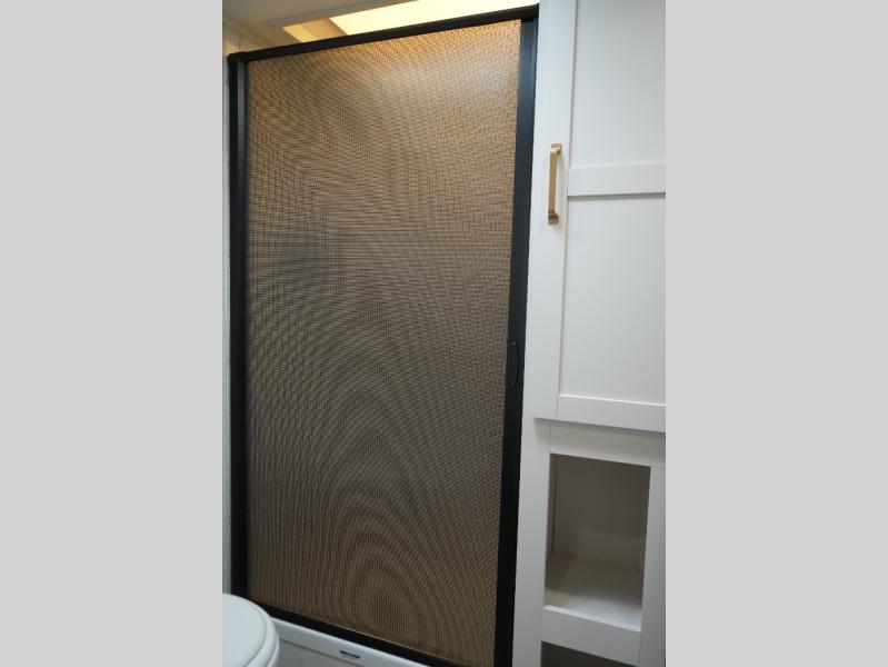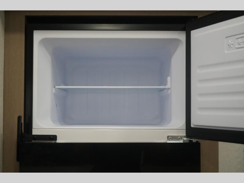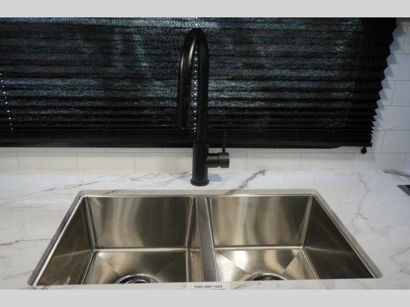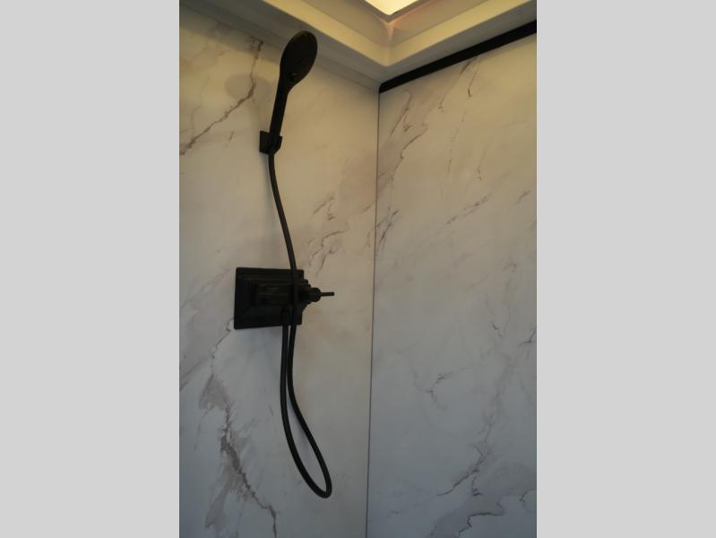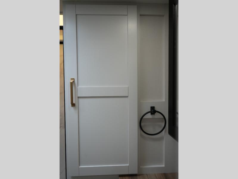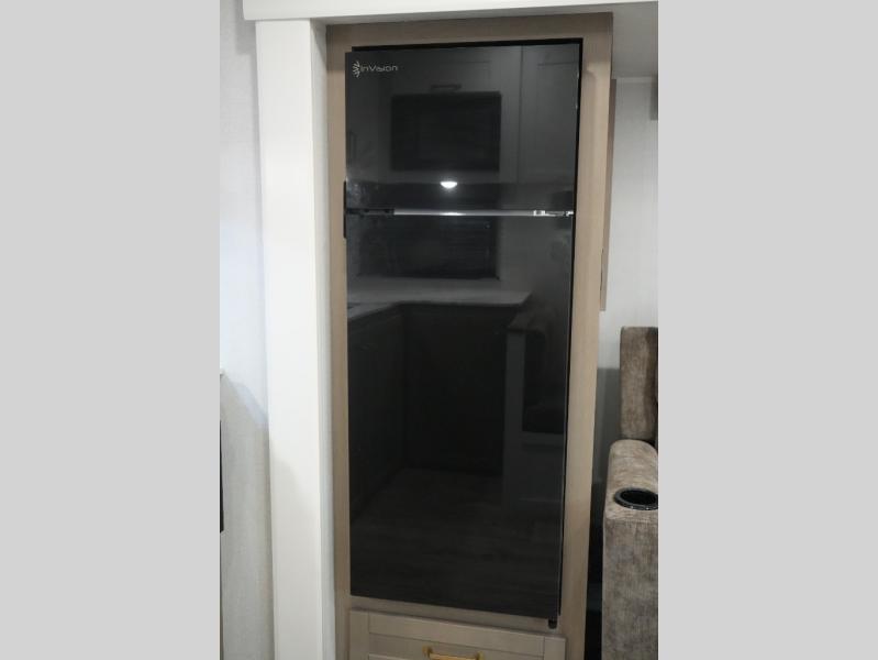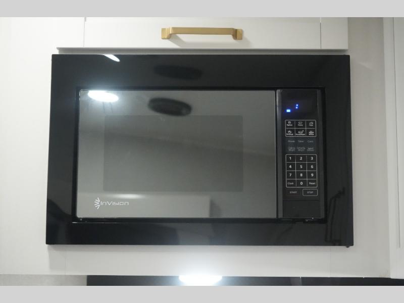 Rear Kitchen Design – Enjoy plenty of counter space, a 12V refrigerator, range, microwave, and a large pantry for all your cooking essentials.