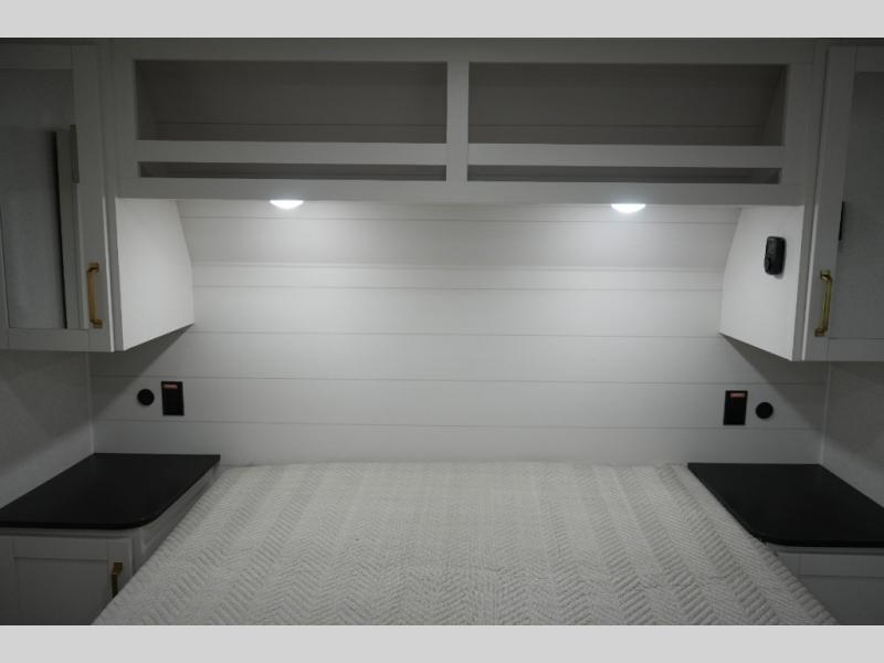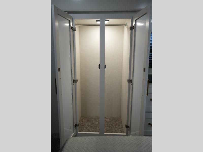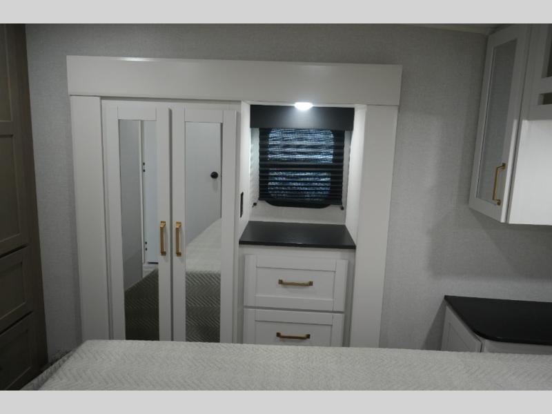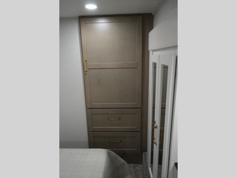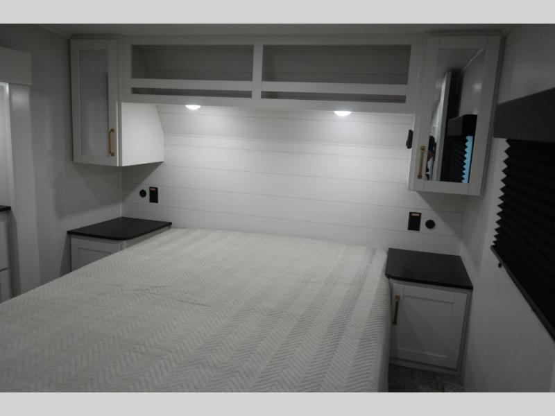 Spacious Private Bedroom – Features a queen bed, dual nightstands, overhead cabinets, and a slide-out with a wardrobe and dresser.