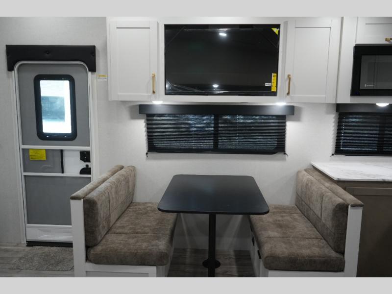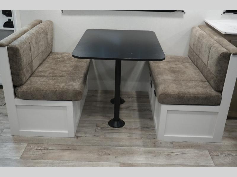 Convertible Living Area – The tri-fold sofa and booth dinette provide seating by day and sleeping for guests at night.