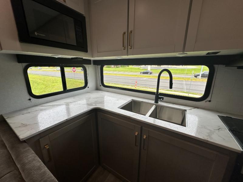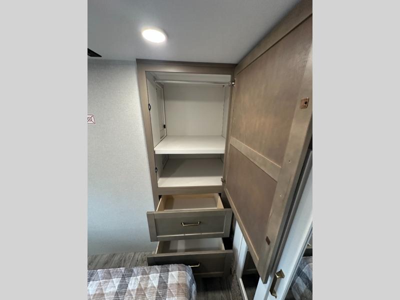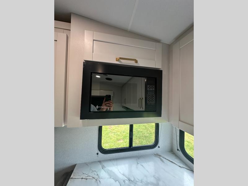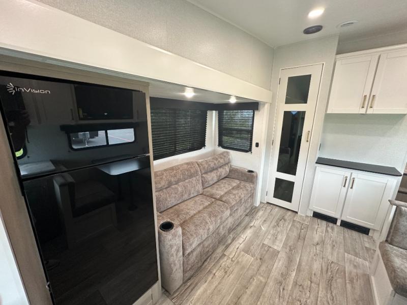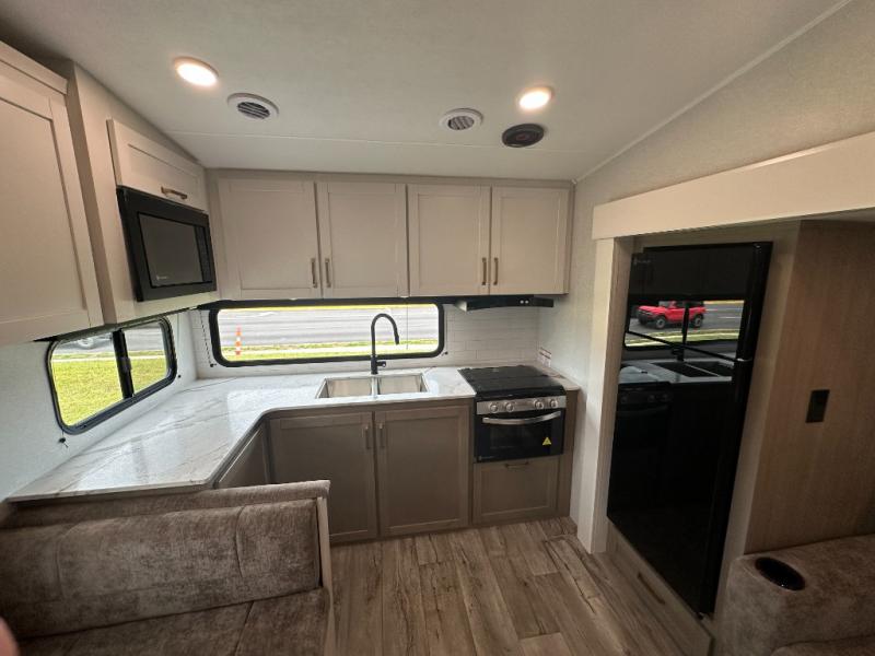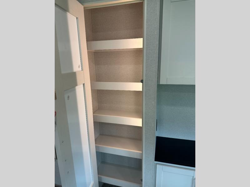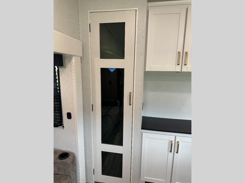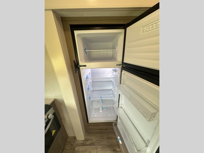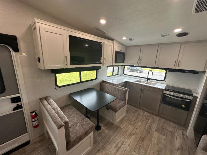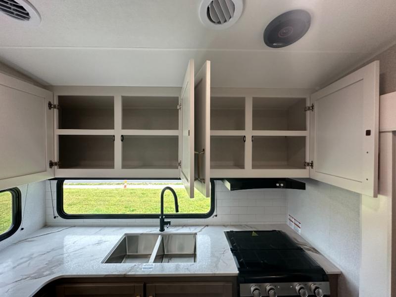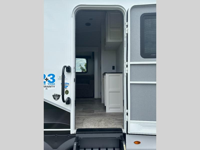 Camping just got a whole lot sweeter in this fifth wheel with double slides, a rear kitchen, and sleeping space for five to six. You'll love waking up each morning in the front private bedroom that includes a queen bed, dual nightstands and overhead cabinets, plus a wardrobe and dresser slide. Your guests who slept on the tri-fold sofa and booth dinette can convert these back to seating space in the morning, and breakfast can be made in the rear kitchen. Here, you'll find ample counter space, a microwave and range, plus a pantry and 12V refrigerator for food storage. Outside, gear can be stored in the pass-thru storage area, and you're sure to enjoy the 16' power awning with LED Lights!