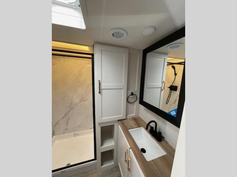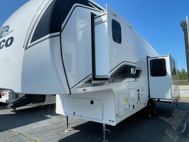 With any Eagle SLE fifth wheel by Jayco, you will enjoy a lighter tow weight, high-end finishes, and the same quality construction you've come to expect from Jayco! There is an Alpha Ply TPO roof membrane, a fully enclosed and heated underbelly, plus Stronghold VBL walls for added durability. There is also a rear 2" towing receiver outside, along with metal slam latch baggage doors, MORryde Step Above entry steps, and a Winegard Air 360 antenna with router prep if you want to stay connected as you camp. Once inside you'll enjoy the handcrafted and glazed door/drawer fronts, blackout pleated shades throughout, and residential vinyl flooring throughout with no carpet for an easier clean. The on-demand water heater, 30K BTU furnace, and 15K BTU "Whisper Quiet" A/C will ensure your comfort year around, and the optional Overland 1 Solar Package can be added if you need off-grid capabilities!