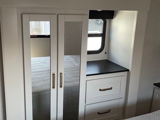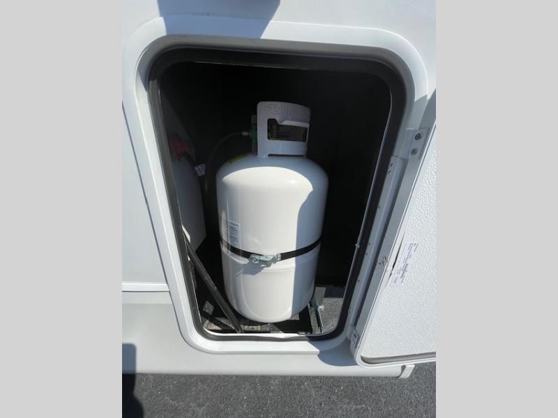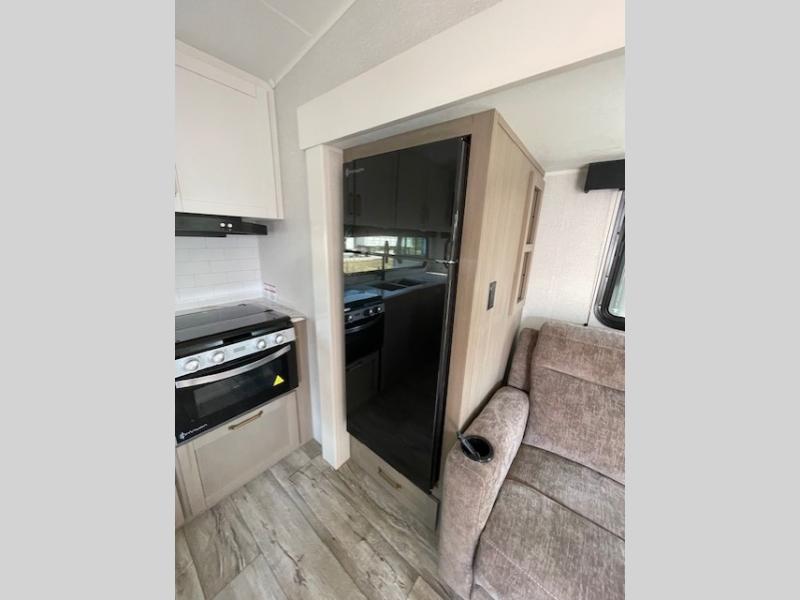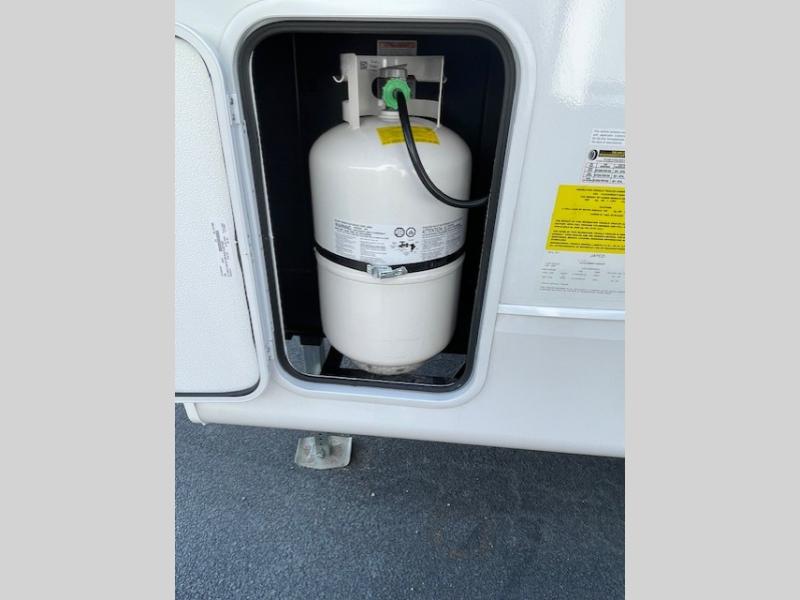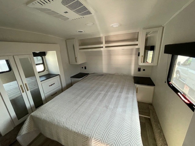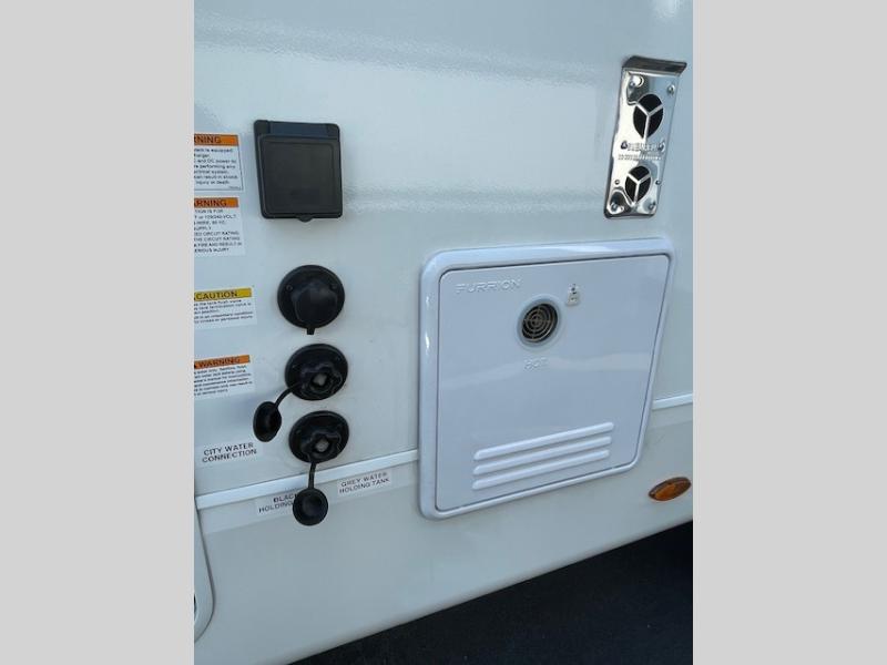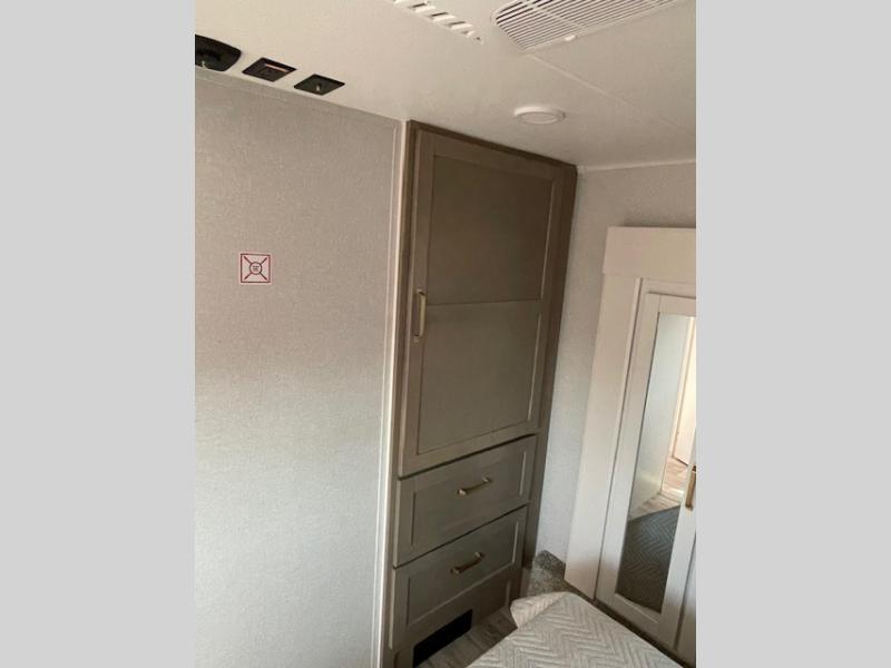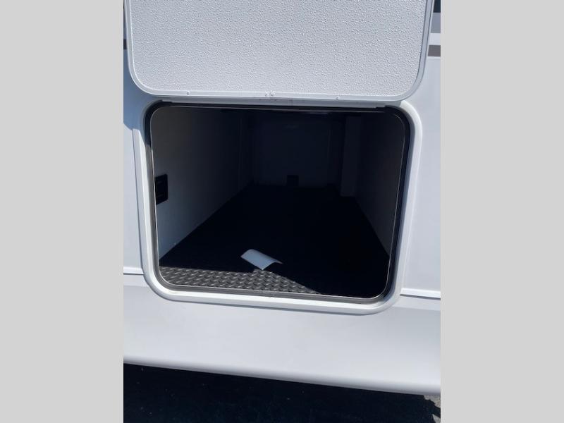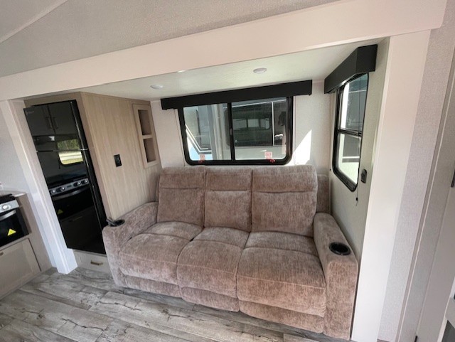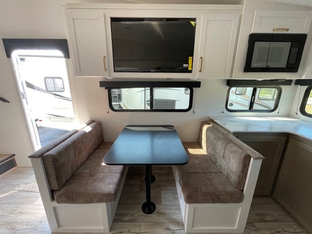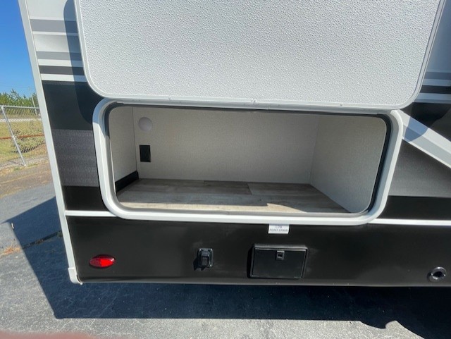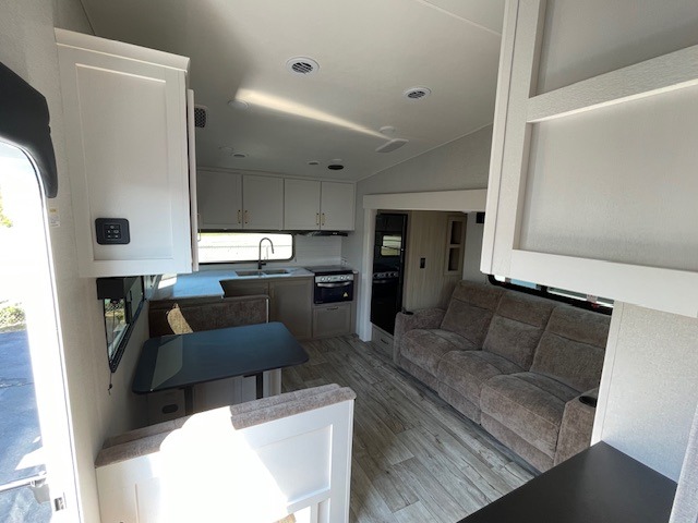 Camping just got a whole lot sweeter in this fifth wheel with double slides, a rear kitchen, and sleeping space for five to six. You'll love waking up each morning in the front private bedroom that includes a queen bed, dual nightstands and overhead cabinets, plus a wardrobe and dresser slide. Your guests who slept on the tri-fold sofa and booth dinette can convert these back to seating space in the morning, and breakfast can be made in the rear kitchen. Here, you'll find ample counter space, a microwave and range, plus a pantry and 12V refrigerator for food storage. Outside, gear can be stored in the pass-thru storage area, and you're sure to enjoy the 16' power awning with LED Lights!