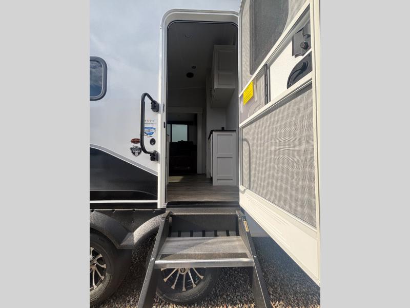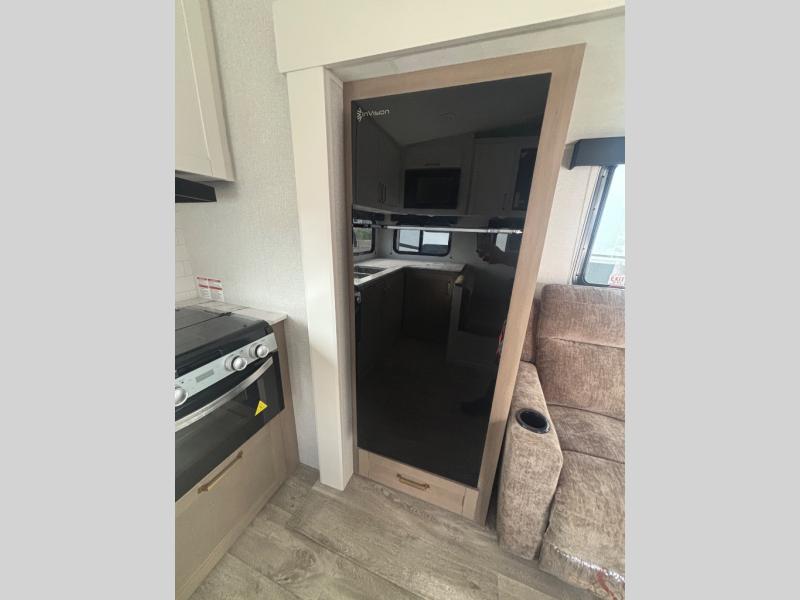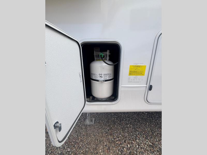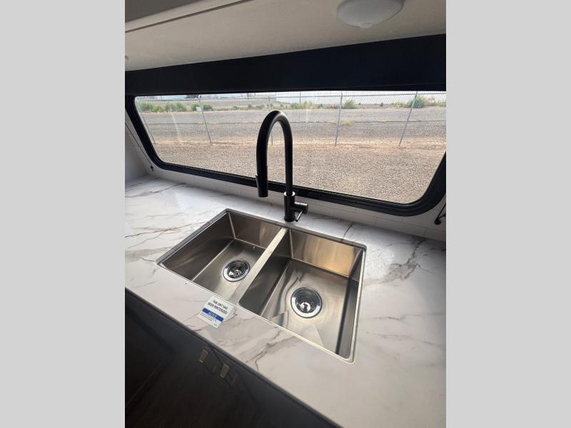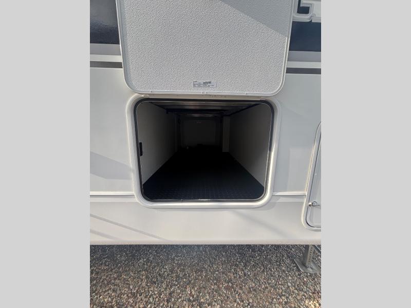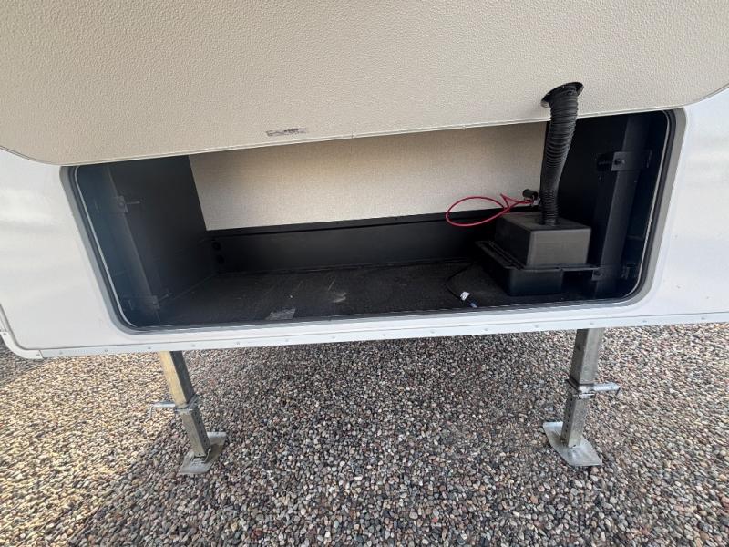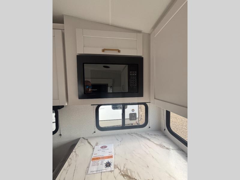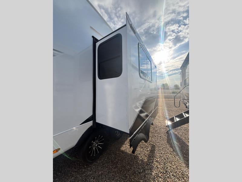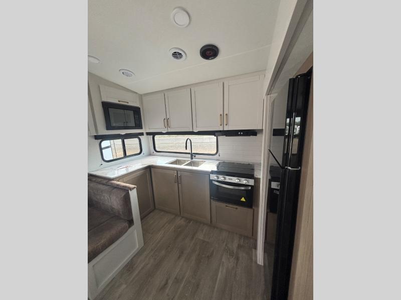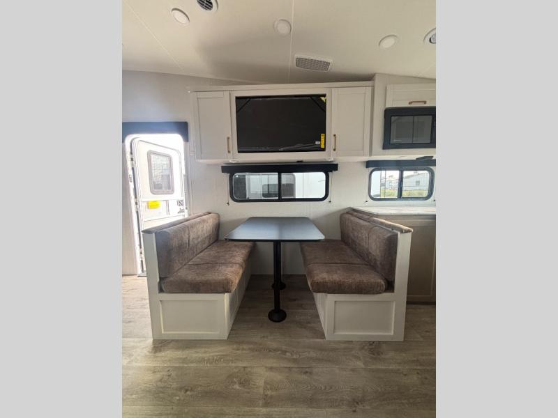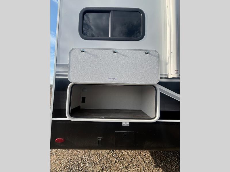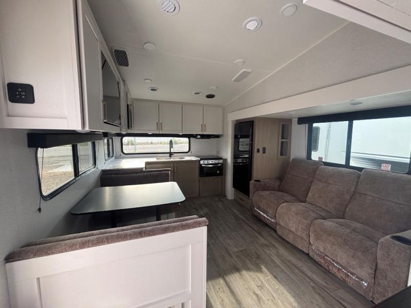 Camping just got a whole lot sweeter in this fifth wheel with double slides, a rear kitchen, and sleeping space for five to six. You'll love waking up each morning in the front private bedroom that includes a queen bed, dual nightstands and overhead cabinets, plus a wardrobe and dresser slide. Your guests who slept on the tri-fold sofa and booth dinette can convert these back to seating space in the morning, and breakfast can be made in the rear kitchen. Here, you'll find ample counter space, a microwave and range, plus a pantry and 12V refrigerator for food storage. Outside, gear can be stored in the pass-thru storage area, and you're sure to enjoy the 16' power awning with LED Lights!
