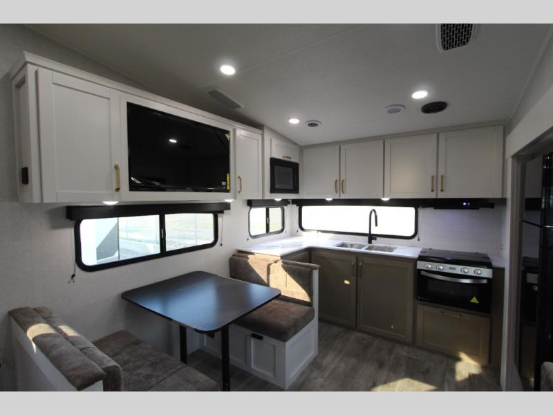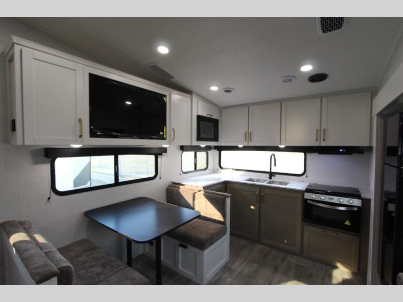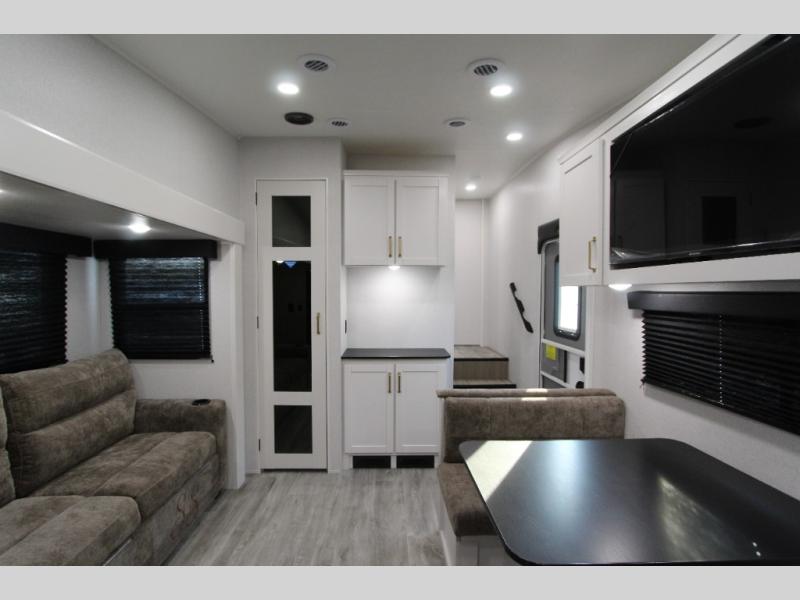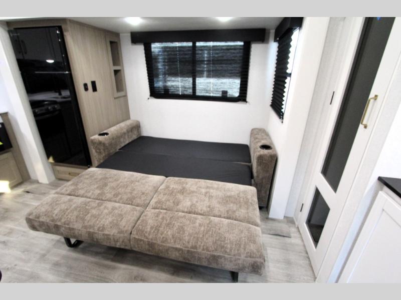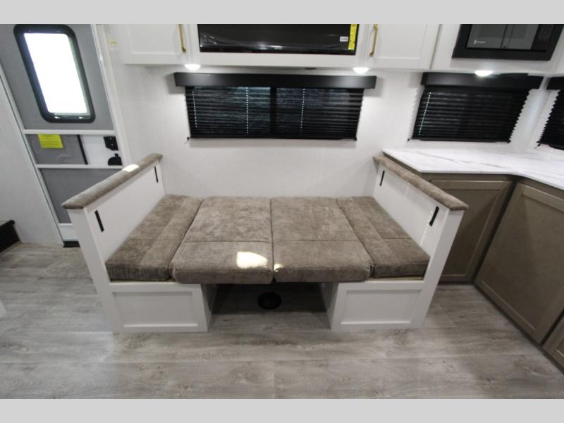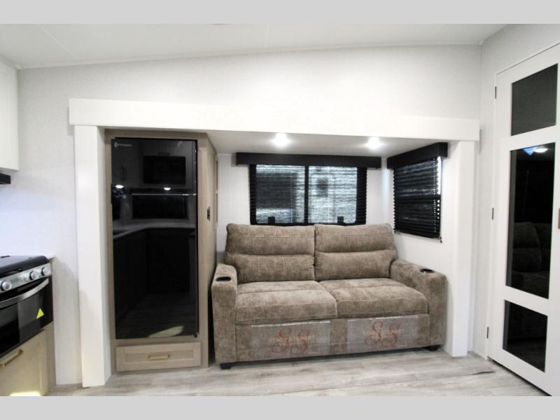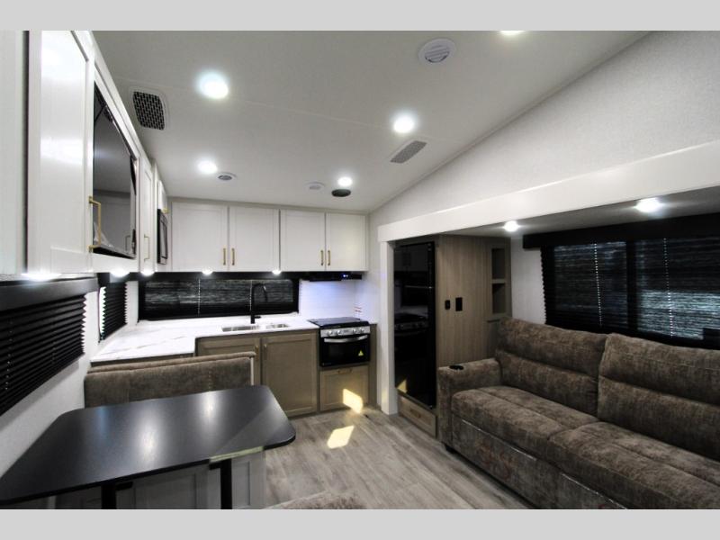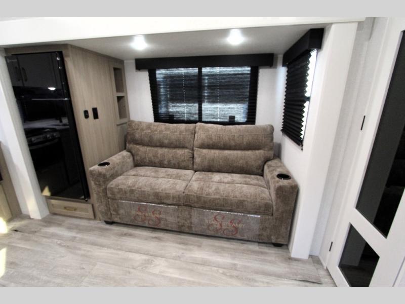 Camping just got a whole lot sweeter in this fifth wheel with double slides, a rear kitchen, and sleeping space for five to six. You'll love waking up each morning in the front private bedroom that includes a queen bed, dual nightstands and overhead cabinets, plus a wardrobe and dresser slide. Your guests who slept on the tri-fold sofa and booth dinette can convert these back to seating space in the morning, and breakfast can be made in the rear kitchen. Here, you'll find ample counter space, a microwave and range, plus a pantry and 12V refrigerator for food storage. Outside, gear can be stored in the pass-thru storage area, and you're sure to enjoy the 16' power awning with LED Lights!