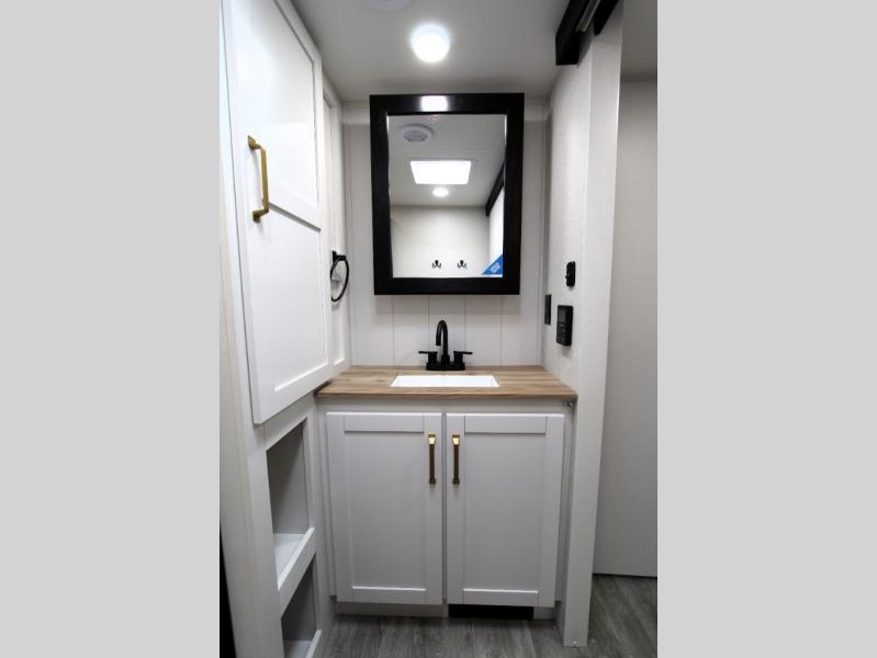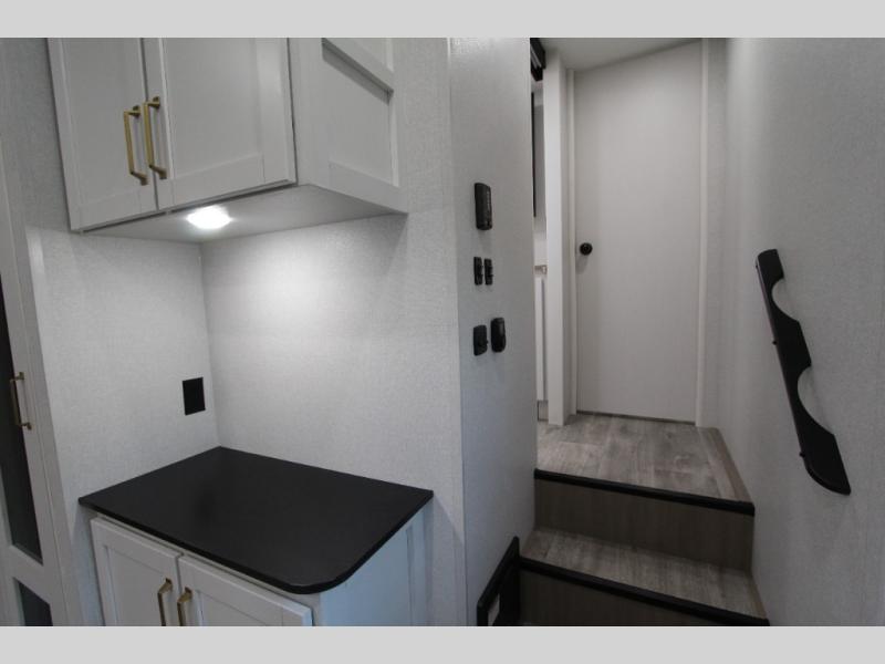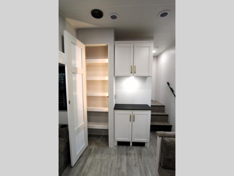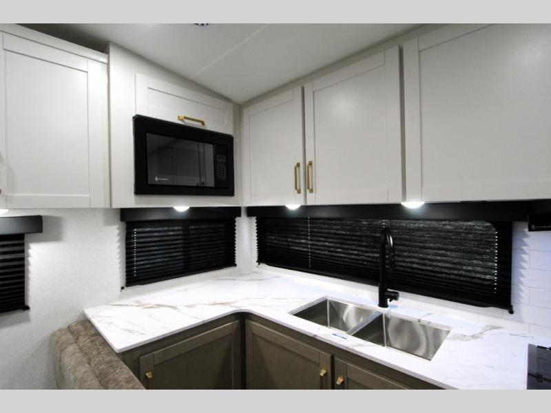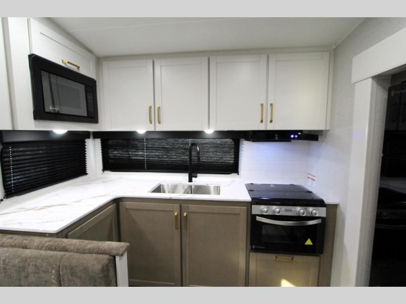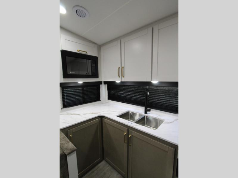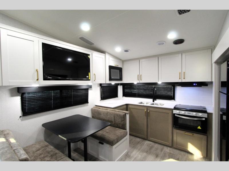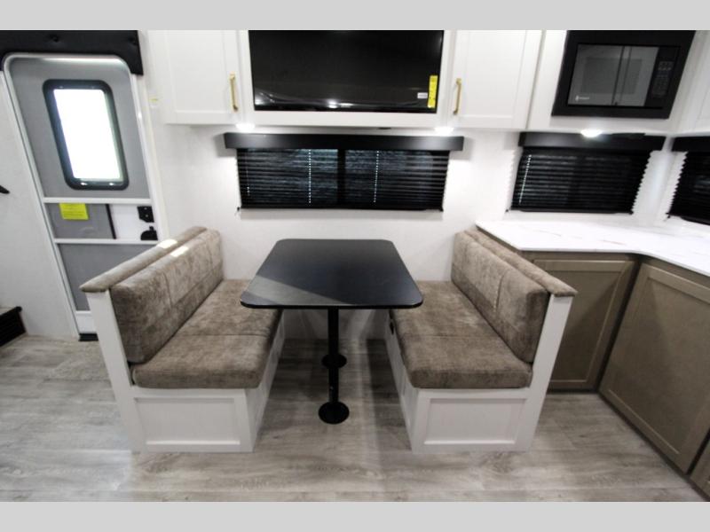 Camping just got a whole lot sweeter in this fifth wheel with double slides, a rear kitchen, and sleeping space for five to six. You'll love waking up each morning in the front private bedroom that includes a queen bed, dual nightstands and overhead cabinets, plus a wardrobe and dresser slide. Your guests who slept on the tri-fold sofa and booth dinette can convert these back to seating space in the morning, and breakfast can be made in the rear kitchen. Here, you'll find ample counter space, a microwave and range, plus a pantry and 12V refrigerator for food storage. Outside, gear can be stored in the pass-thru storage area, and you're sure to enjoy the 16' power awning with LED Lights!