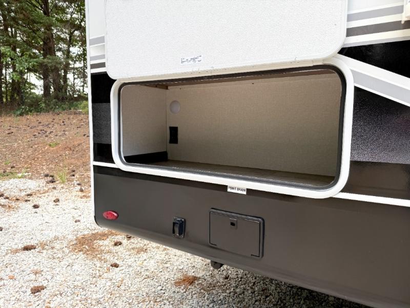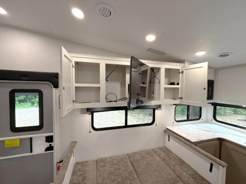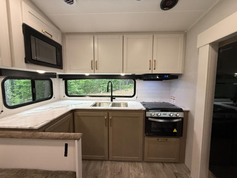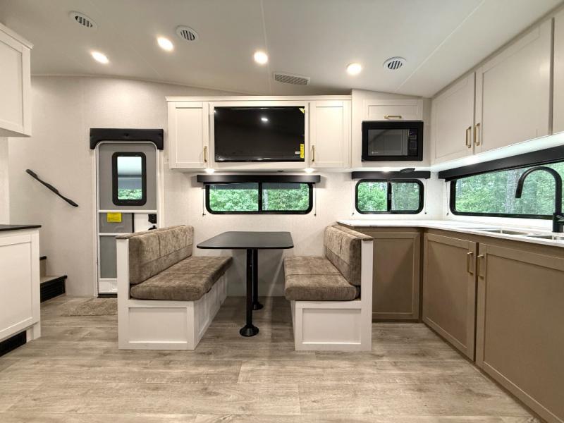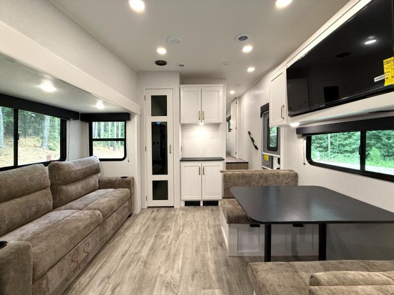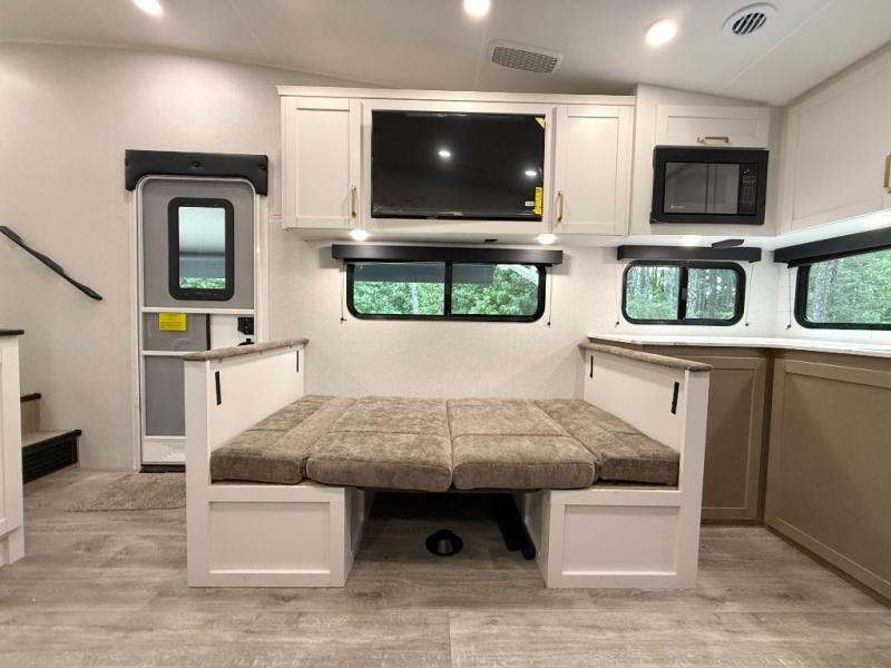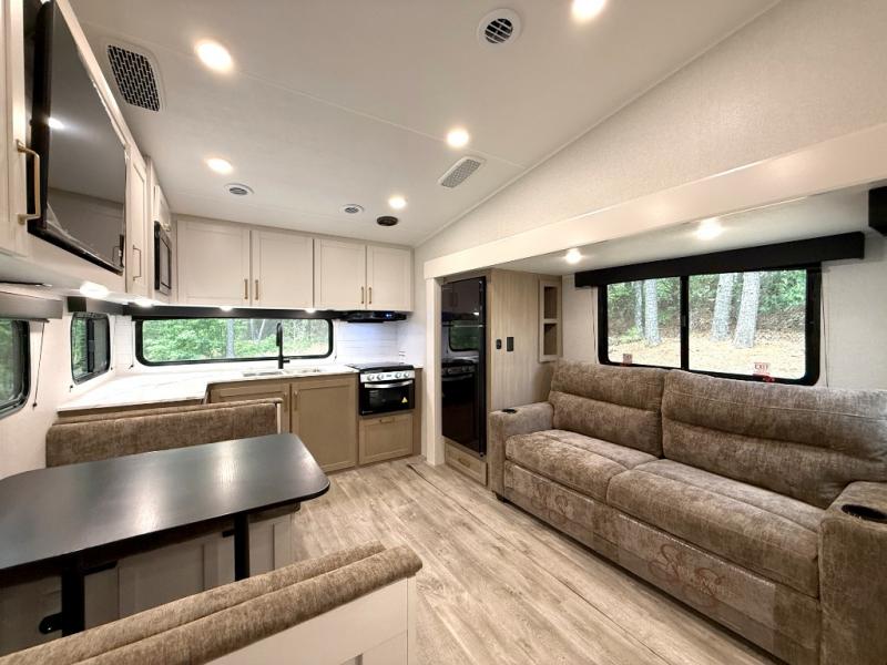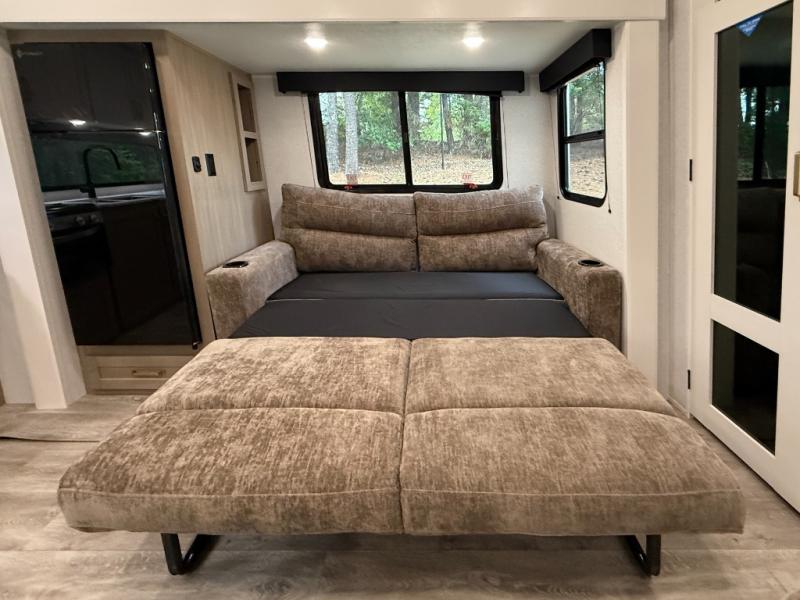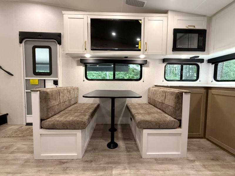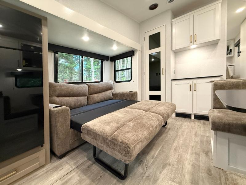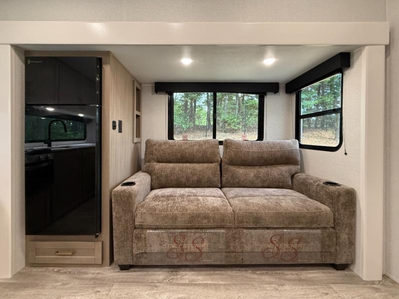 Camping just got a whole lot sweeter in this fifth wheel with double slides, a rear kitchen, and sleeping space for five to six. You'll love waking up each morning in the front private bedroom that includes a queen bed, dual nightstands and overhead cabinets, plus a wardrobe and dresser slide. Your guests who slept on the tri-fold sofa and booth dinette can convert these back to seating space in the morning, and breakfast can be made in the rear kitchen. Here, you'll find ample counter space, a microwave and range, plus a pantry and 12V refrigerator for food storage. Outside, gear can be stored in the pass-thru storage area, and you're sure to enjoy the 16' power awning with LED Lights!