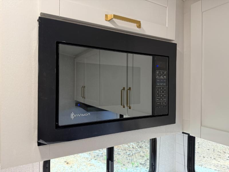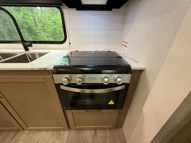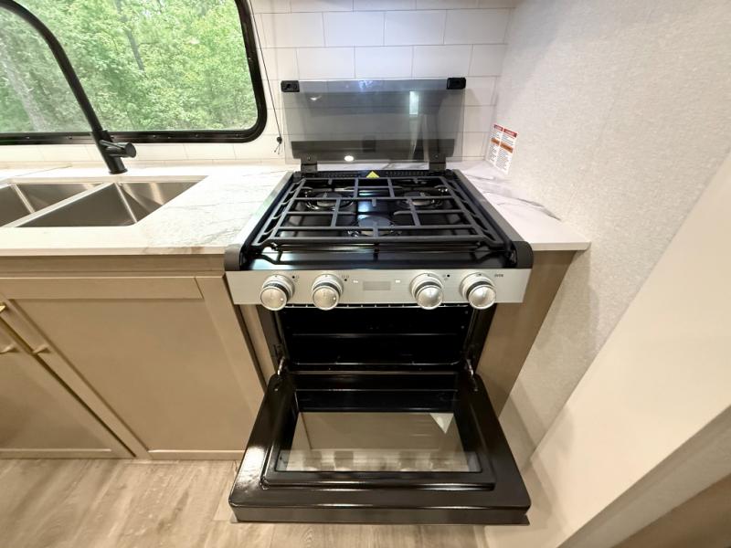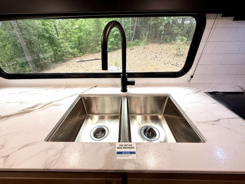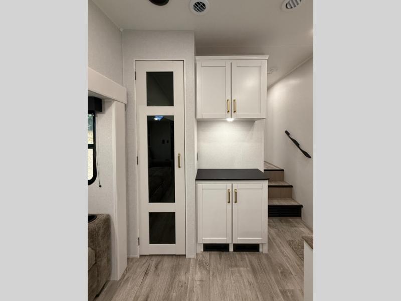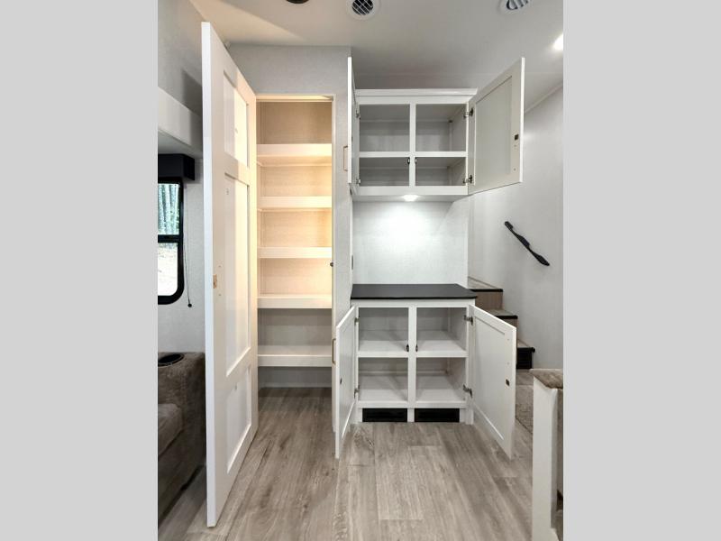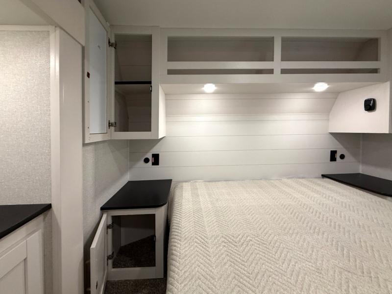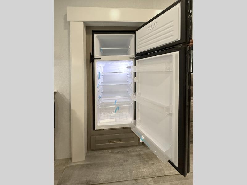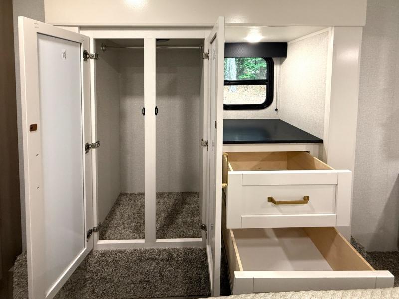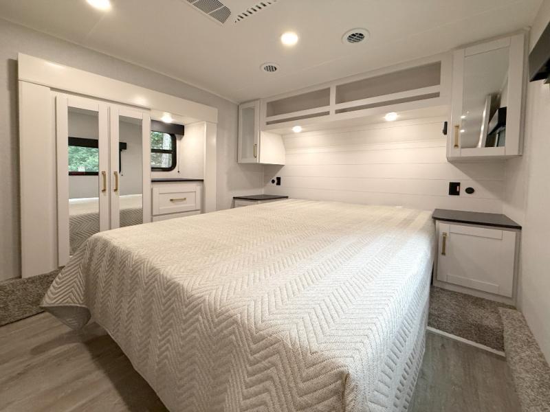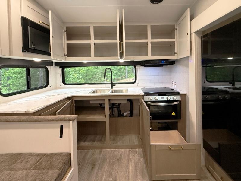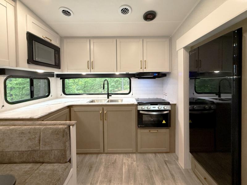 Camping just got a whole lot sweeter in this fifth wheel with double slides, a rear kitchen, and sleeping space for five to six. You'll love waking up each morning in the front private bedroom that includes a queen bed, dual nightstands and overhead cabinets, plus a wardrobe and dresser slide. Your guests who slept on the tri-fold sofa and booth dinette can convert these back to seating space in the morning, and breakfast can be made in the rear kitchen. Here, you'll find ample counter space, a microwave and range, plus a pantry and 12V refrigerator for food storage. Outside, gear can be stored in the pass-thru storage area, and you're sure to enjoy the 16' power awning with LED Lights!