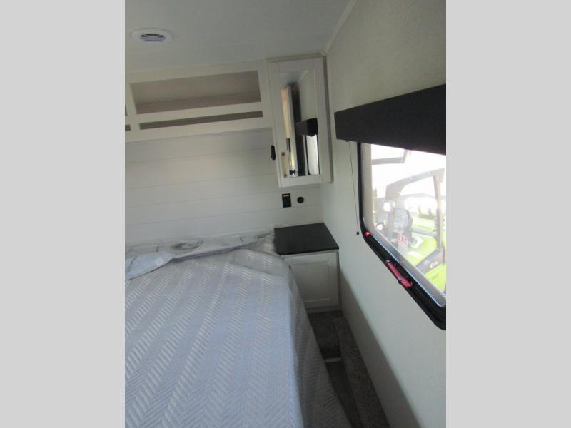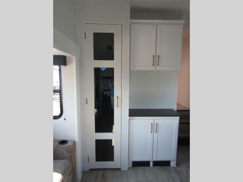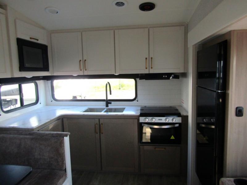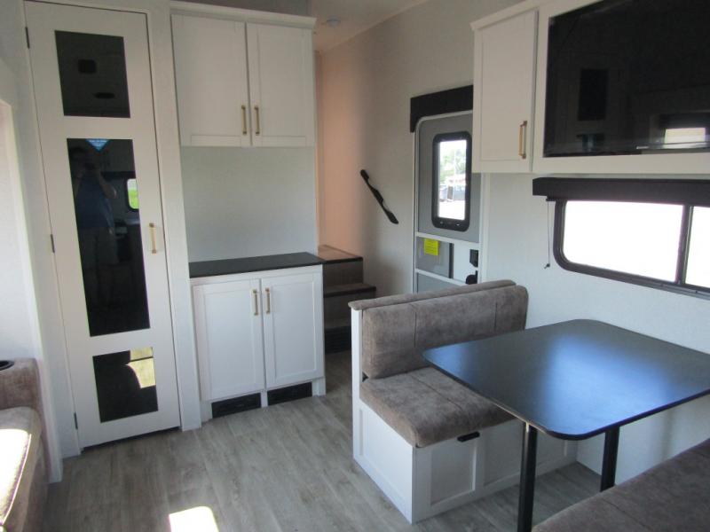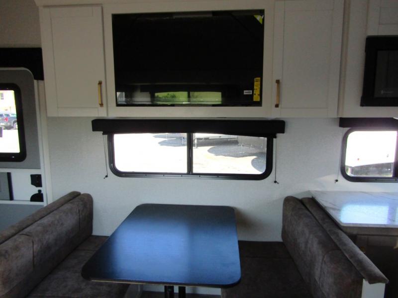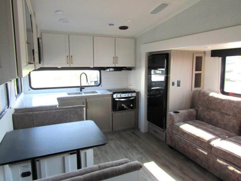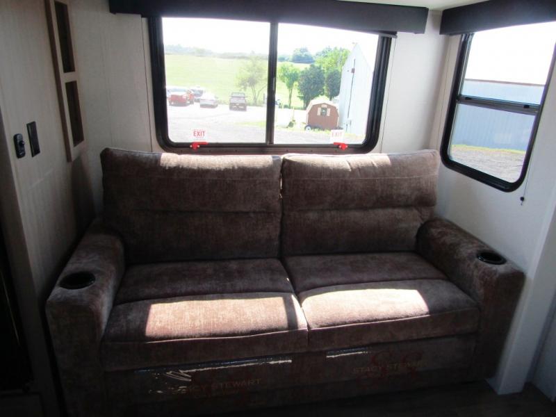 Camping just got a whole lot sweeter in this fifth wheel with double slides, a rear kitchen, and sleeping space for five to six. You'll love waking up each morning in the front private bedroom that includes a queen bed, dual nightstands and overhead cabinets, plus a wardrobe and dresser slide. Your guests who slept on the tri-fold sofa and booth dinette can convert these back to seating space in the morning, and breakfast can be made in the rear kitchen. Here, you'll find ample counter space, a microwave and range, plus a pantry and 12V refrigerator for food storage. Outside, gear can be stored in the pass-thru storage area, and you're sure to enjoy the 16' power awning with LED Lights!