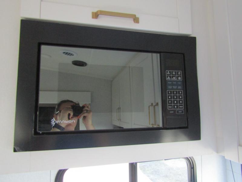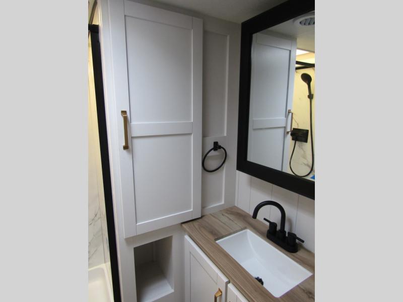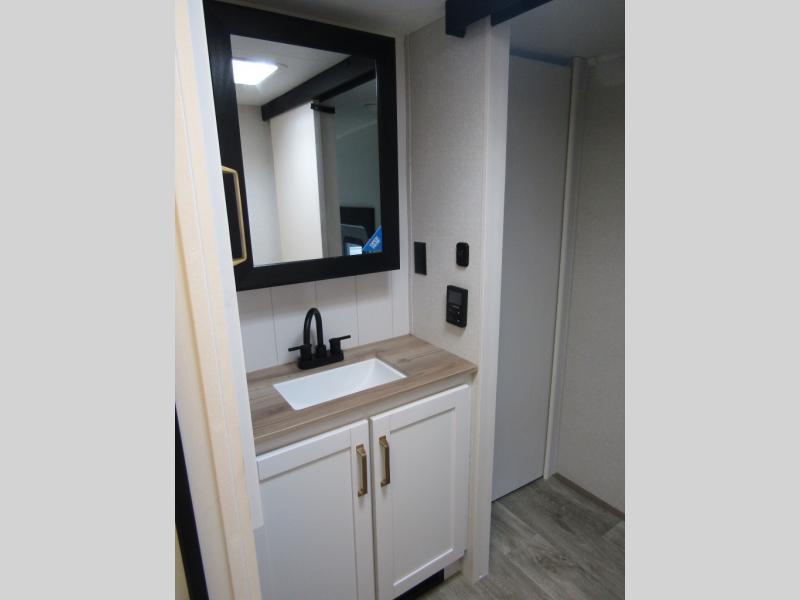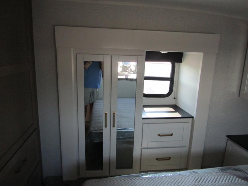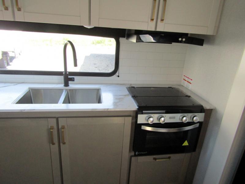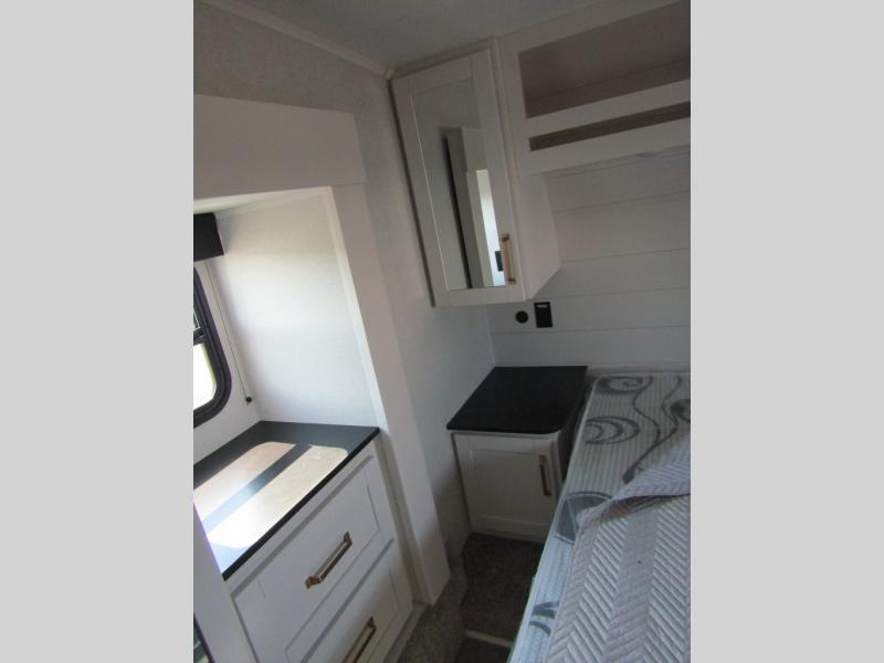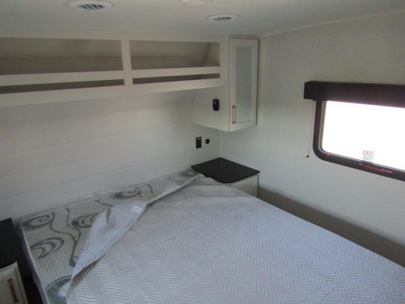 Camping just got a whole lot sweeter in this fifth wheel with double slides, a rear kitchen, and sleeping space for five to six. You'll love waking up each morning in the front private bedroom that includes a queen bed, dual nightstands and overhead cabinets, plus a wardrobe and dresser slide. Your guests who slept on the tri-fold sofa and booth dinette can convert these back to seating space in the morning, and breakfast can be made in the rear kitchen. Here, you'll find ample counter space, a microwave and range, plus a pantry and 12V refrigerator for food storage. Outside, gear can be stored in the pass-thru storage area, and you're sure to enjoy the 16' power awning with LED Lights!