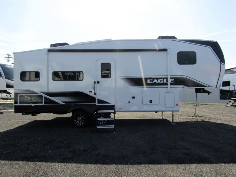 With any Eagle SLE fifth wheel by Jayco, you will enjoy a lighter tow weight, high-end finishes, and the same quality construction you've come to expect from Jayco! There is an Alpha Ply TPO roof membrane, a fully enclosed and heated underbelly, plus Stronghold VBL walls for added durability. There is also a rear 2" towing receiver outside, along with metal slam latch baggage doors, MORryde Step Above entry steps, and a Winegard Air 360 antenna with router prep if you want to stay connected as you camp. Once inside you'll enjoy the handcrafted and glazed door/drawer fronts, blackout pleated shades throughout, and residential vinyl flooring throughout with no carpet for an easier clean. The on-demand water heater, 30K BTU furnace, and 15K BTU "Whisper Quiet" A/C will ensure your comfort year around, and the optional Overland 1 Solar Package can be added if you need off-grid capabilities!