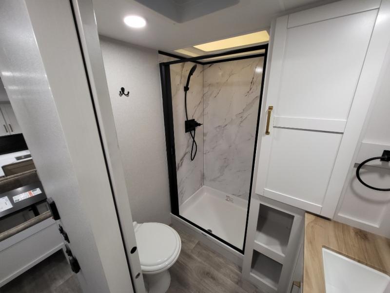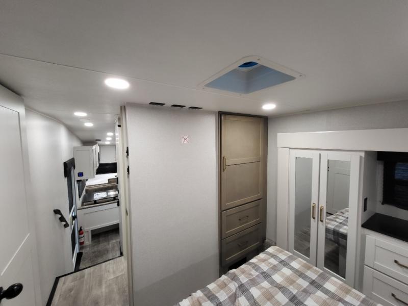 With any Eagle SLE fifth wheel by Jayco, you will enjoy a lighter tow weight, high-end finishes, and the same quality construction you've come to expect from Jayco! There is an Alpha Ply TPO roof membrane, a fully enclosed and heated underbelly, plus Stronghold VBL walls for added durability. There is also a rear 2" towing receiver outside, along with metal slam latch baggage doors, MORryde Step Above entry steps, and a Winegard Air 360 antenna with router prep if you want to stay connected as you camp. Once inside you'll enjoy the handcrafted and glazed door/drawer fronts, blackout pleated shades throughout, and residential vinyl flooring throughout with no carpet for an easier clean. The on-demand water heater, 30K BTU furnace, and 15K BTU "Whisper Quiet" A/C will ensure your comfort year around, and the optional Overland 1 Solar Package can be added if you need off-grid capabilities!