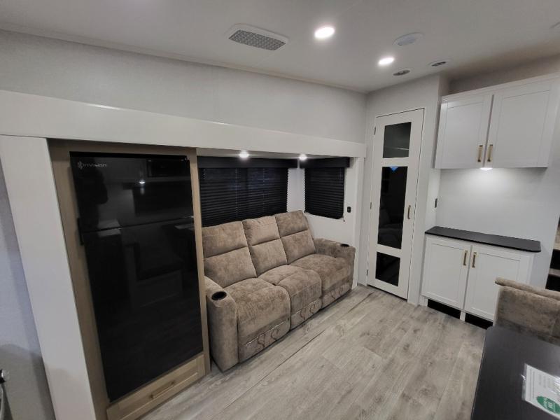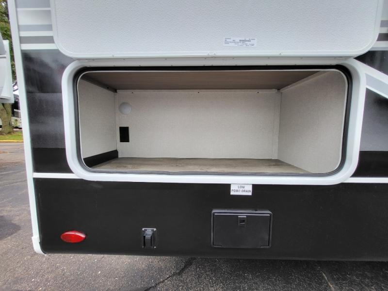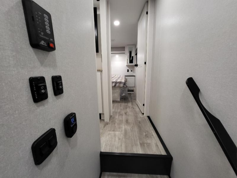 Camping just got a whole lot sweeter in this fifth wheel with double slides, a rear kitchen, and sleeping space for five to six. You'll love waking up each morning in the front private bedroom that includes a queen bed, dual nightstands and overhead cabinets, plus a wardrobe and dresser slide. Your guests who slept on the tri-fold sofa and booth dinette can convert these back to seating space in the morning, and breakfast can be made in the rear kitchen. Here, you'll find ample counter space, a microwave and range, plus a pantry and 12V refrigerator for food storage. Outside, gear can be stored in the pass-thru storage area, and you're sure to enjoy the 16' power awning with LED Lights!