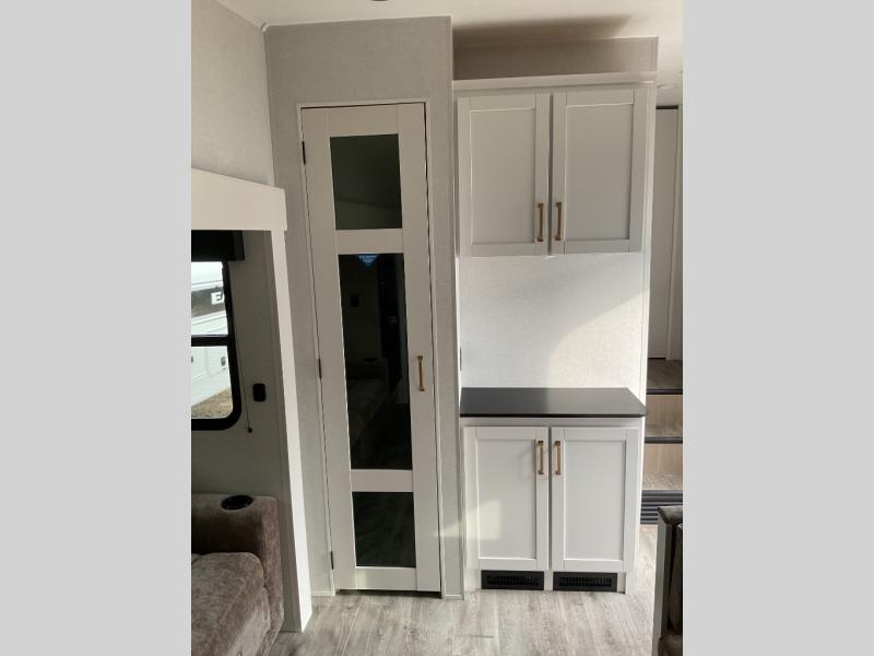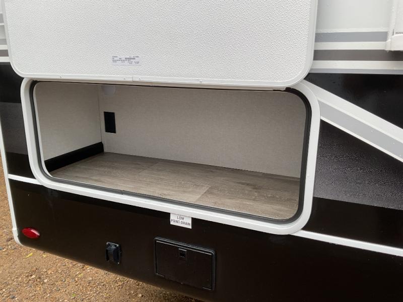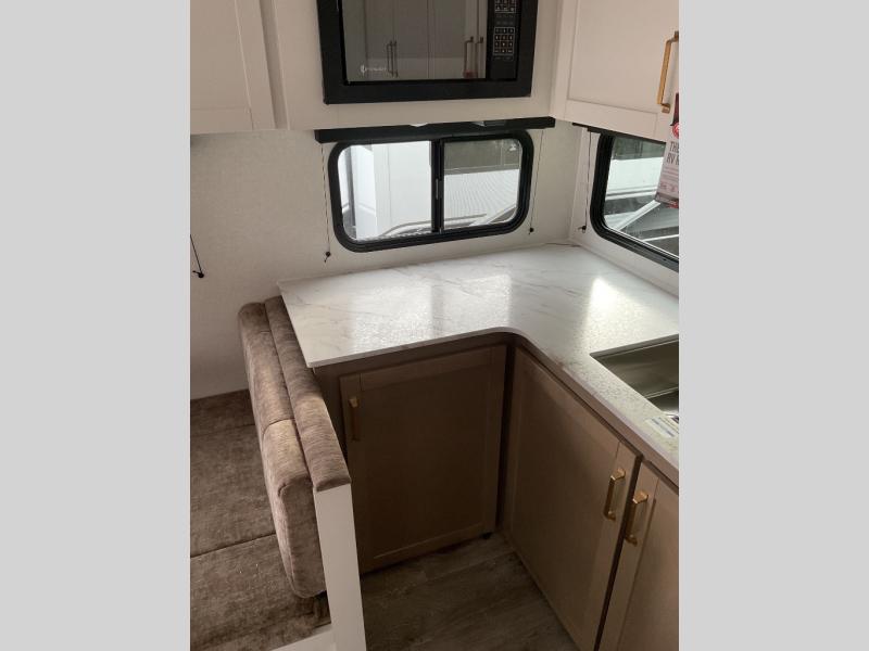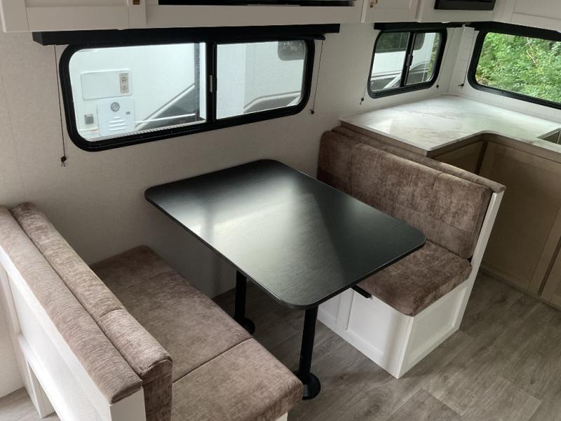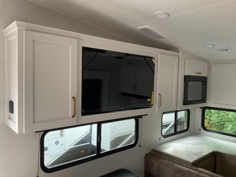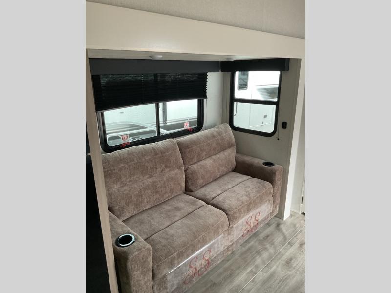 Camping just got a whole lot sweeter in this fifth wheel with double slides, a rear kitchen, and sleeping space for five to six. You'll love waking up each morning in the front private bedroom that includes a queen bed, dual nightstands and overhead cabinets, plus a wardrobe and dresser slide. Your guests who slept on the tri-fold sofa and booth dinette can convert these back to seating space in the morning, and breakfast can be made in the rear kitchen. Here, you'll find ample counter space, a microwave and range, plus a pantry and 12V refrigerator for food storage. Outside, gear can be stored in the pass-thru storage area, and you're sure to enjoy the 16' power awning with LED Lights!
