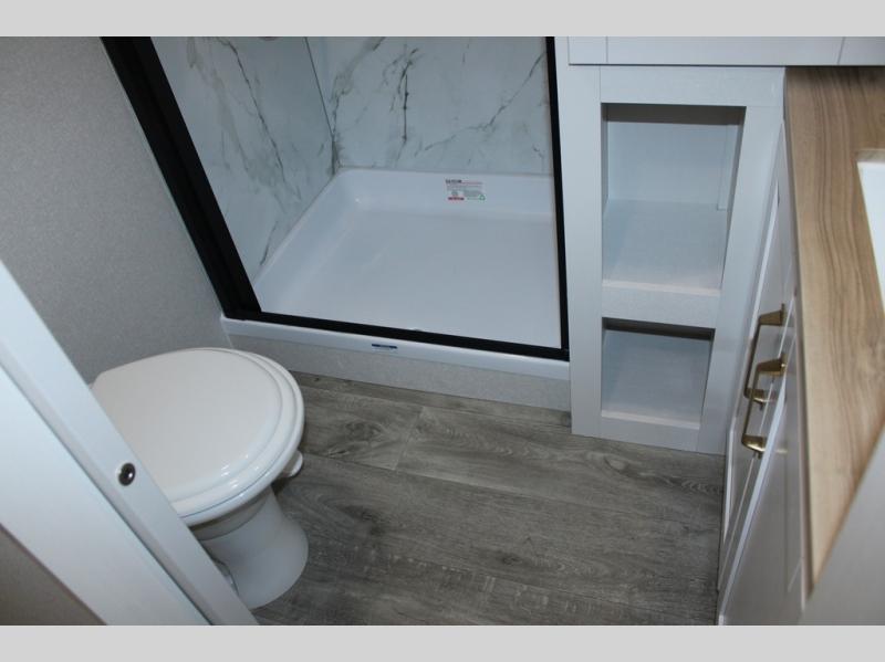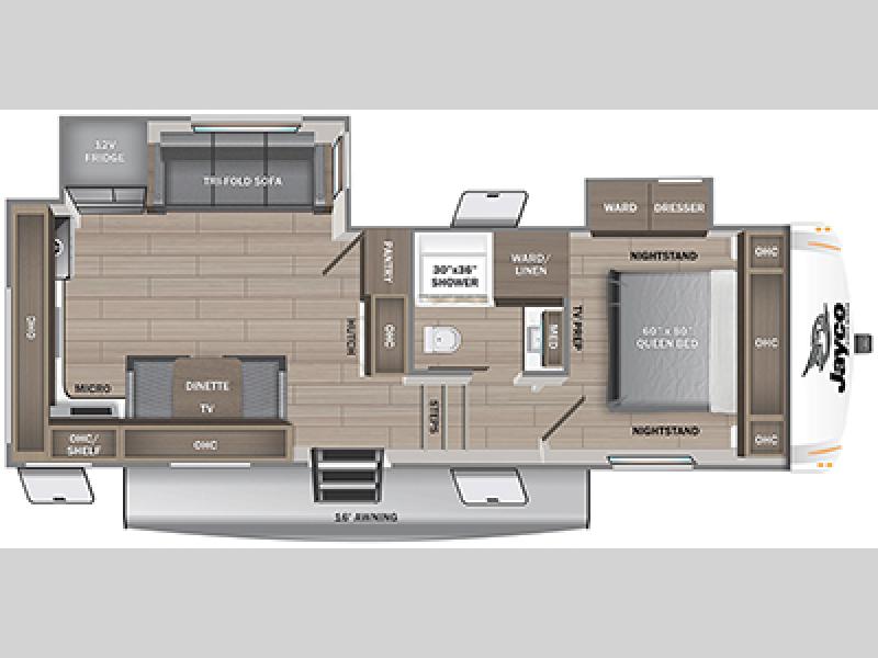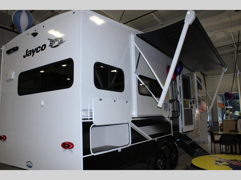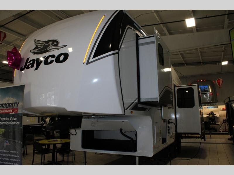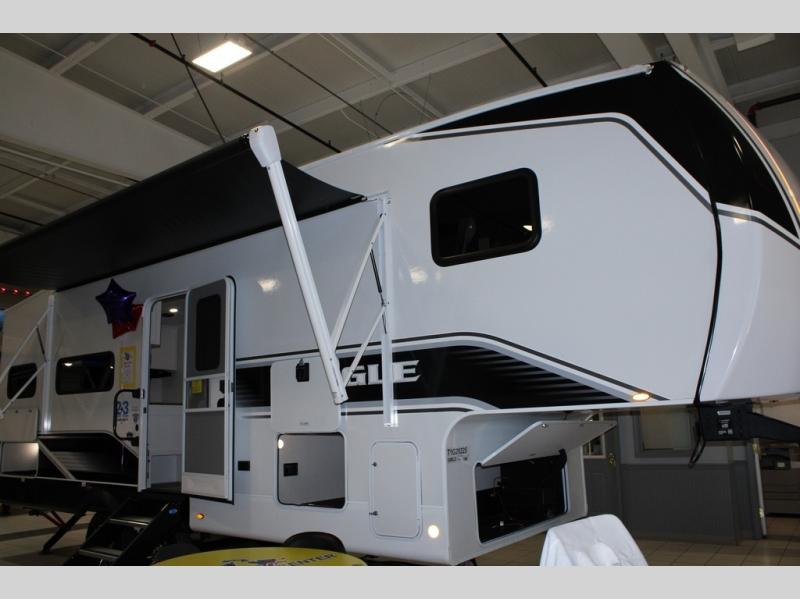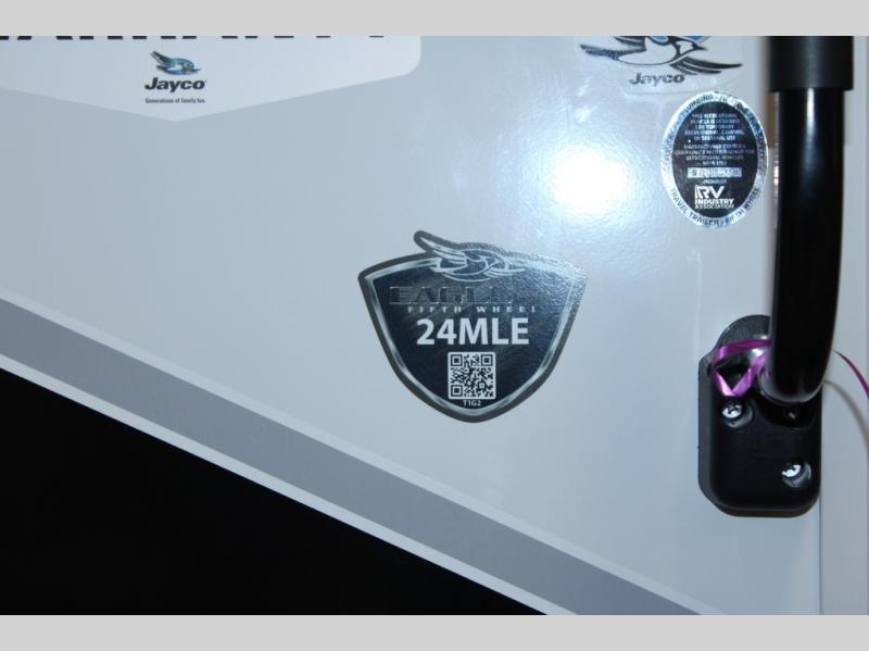 With any Eagle SLE fifth wheel by Jayco, you will enjoy a lighter tow weight, high-end finishes, and the same quality construction you've come to expect from Jayco! There is an Alpha Ply TPO roof membrane, a fully enclosed and heated underbelly, plus Stronghold VBL walls for added durability. There is also a rear 2" towing receiver outside, along with metal slam latch baggage doors, MORryde Step Above entry steps, and a Winegard Air 360 antenna with router prep if you want to stay connected as you camp. Once inside you'll enjoy the handcrafted and glazed door/drawer fronts, blackout pleated shades throughout, and residential vinyl flooring throughout with no carpet for an easier clean. The on-demand water heater, 30K BTU furnace, and 15K BTU "Whisper Quiet" A/C will ensure your comfort year around, and the optional Overland 1 Solar Package can be added if you need off-grid capabilities!