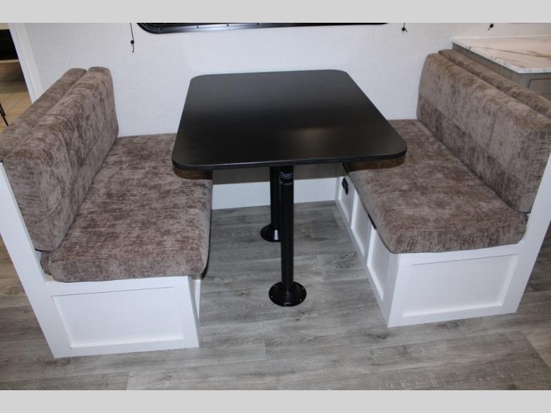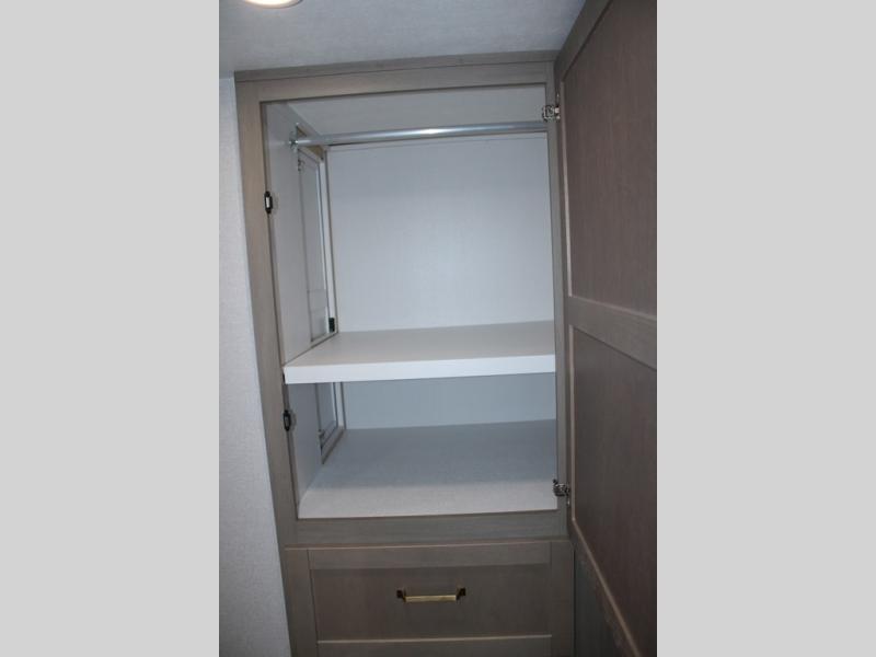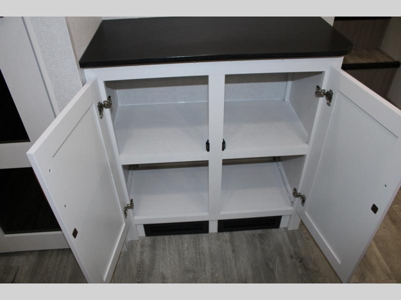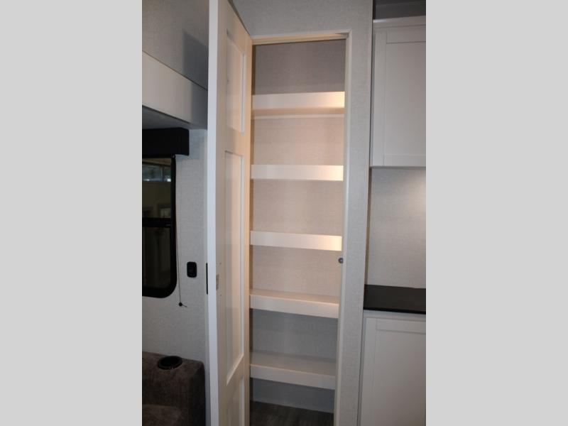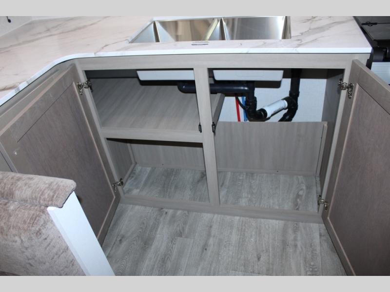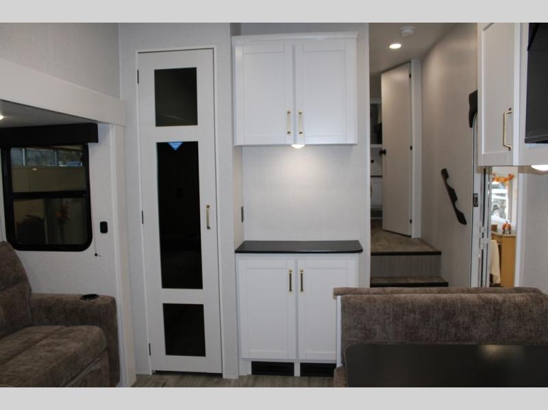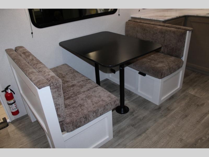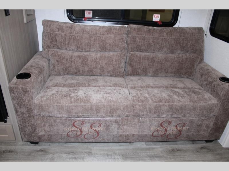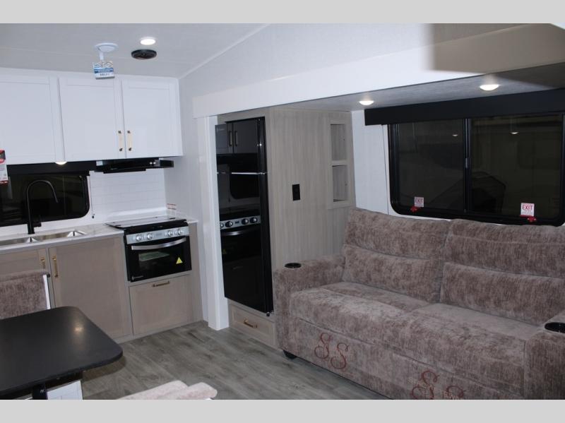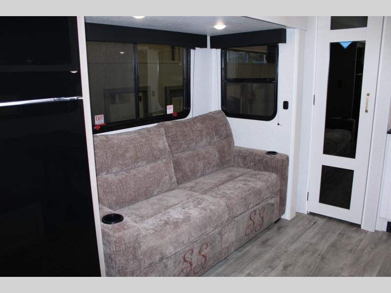 Camping just got a whole lot sweeter in this fifth wheel with double slides, a rear kitchen, and sleeping space for five to six. You'll love waking up each morning in the front private bedroom that includes a queen bed, dual nightstands and overhead cabinets, plus a wardrobe and dresser slide. Your guests who slept on the tri-fold sofa and booth dinette can convert these back to seating space in the morning, and breakfast can be made in the rear kitchen. Here, you'll find ample counter space, a microwave and range, plus a pantry and 12V refrigerator for food storage. Outside, gear can be stored in the pass-thru storage area, and you're sure to enjoy the 16' power awning with LED Lights!