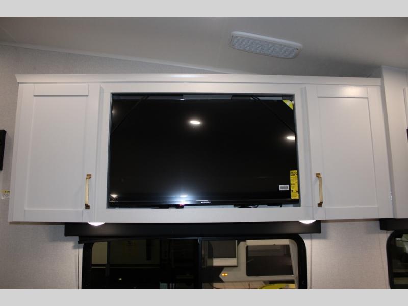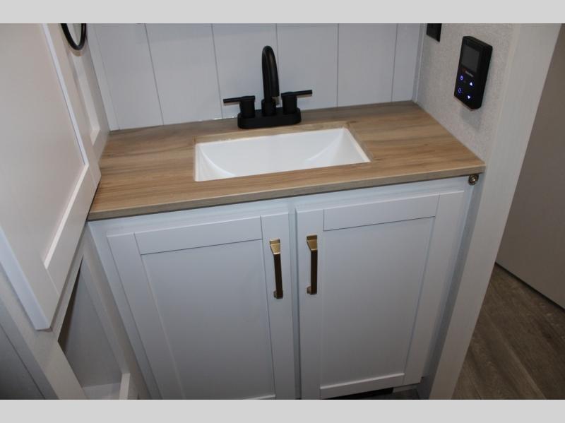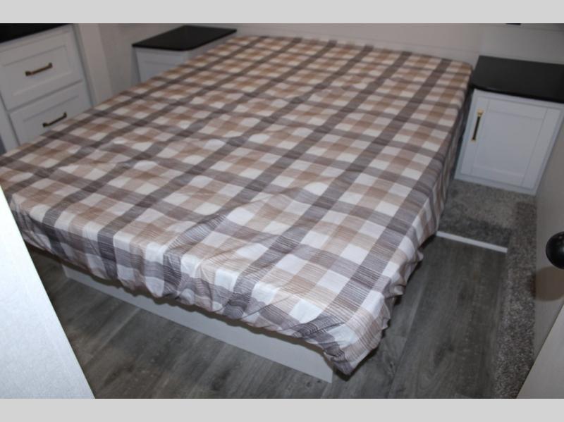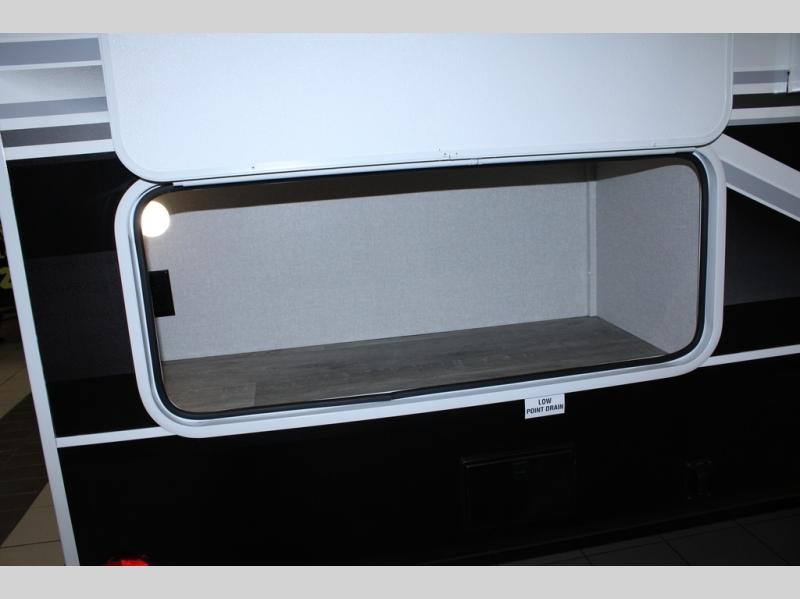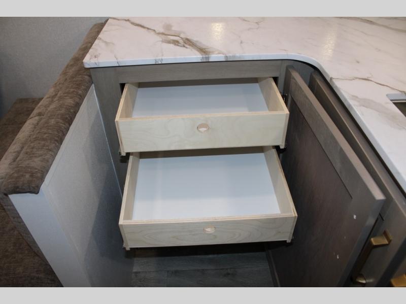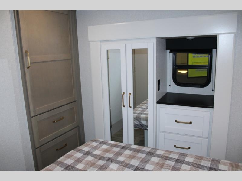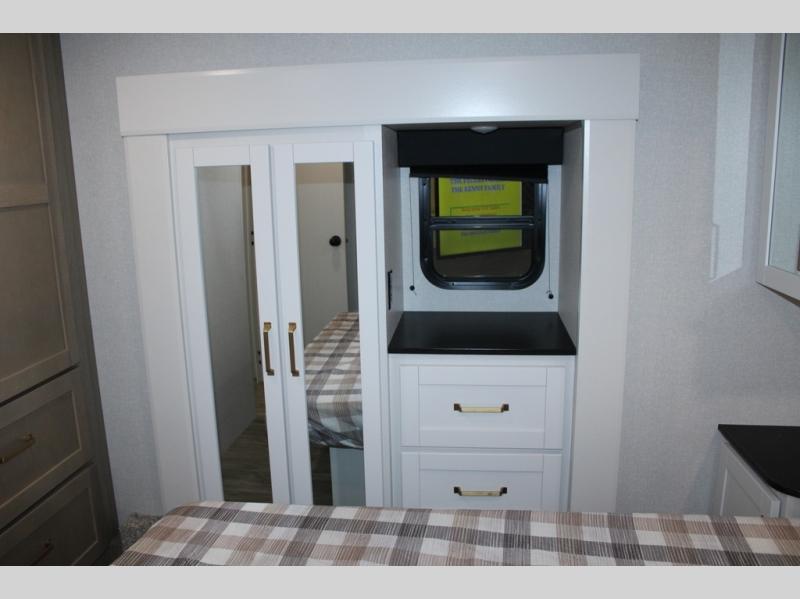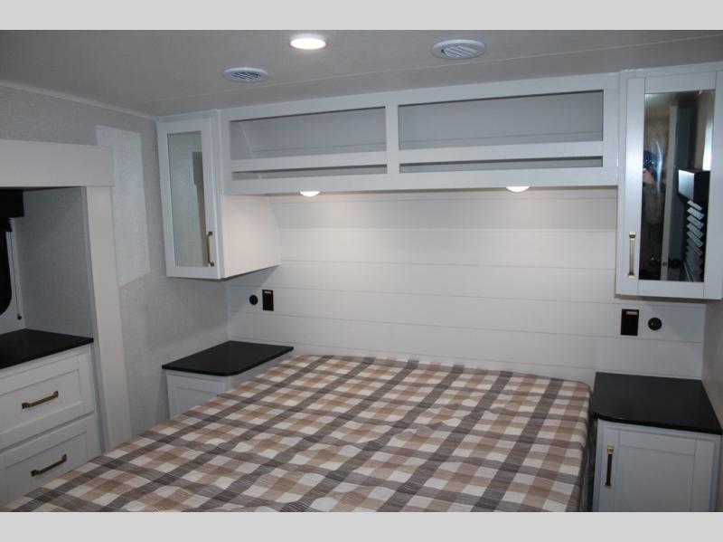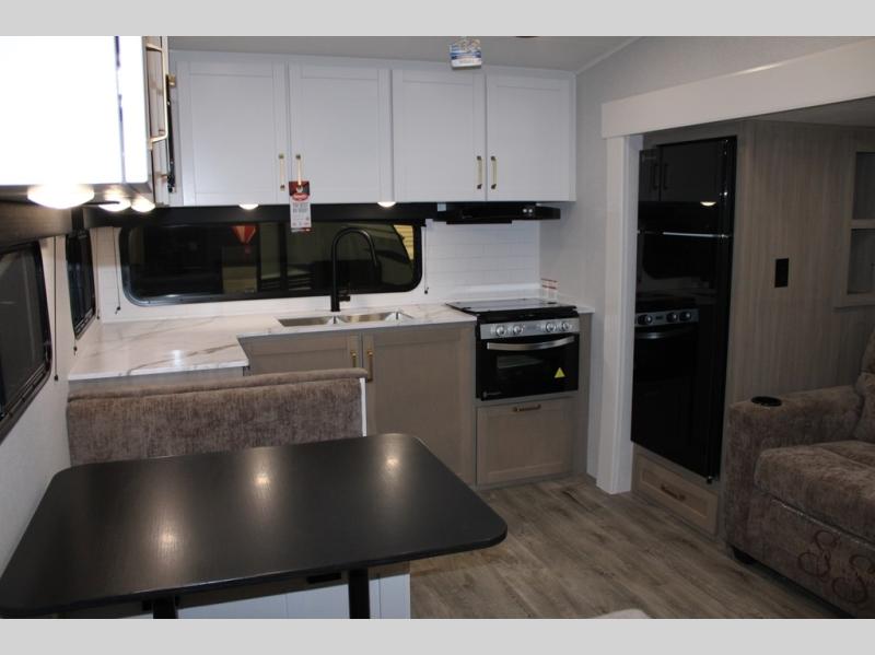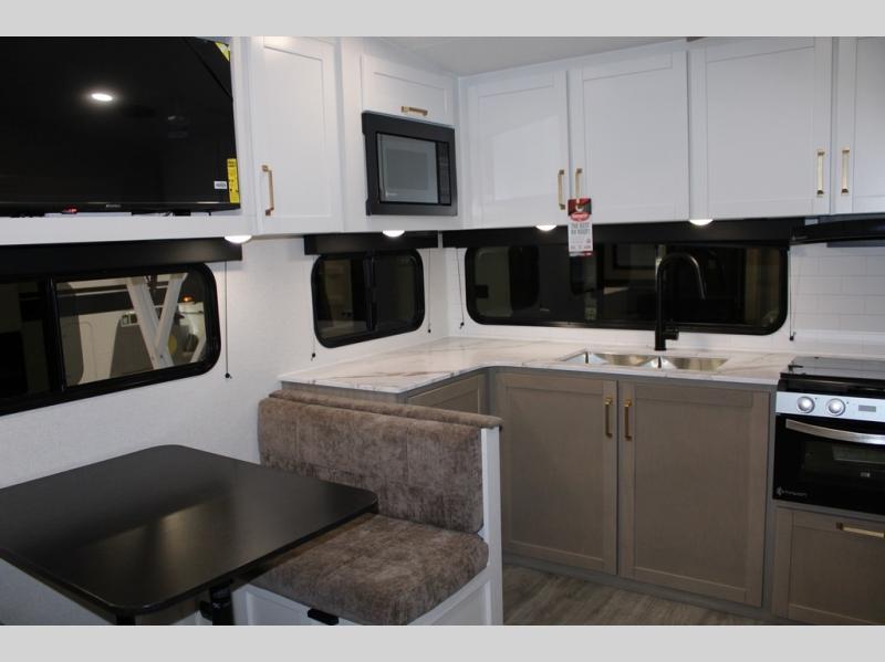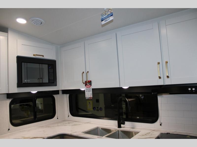 Camping just got a whole lot sweeter in this fifth wheel with double slides, a rear kitchen, and sleeping space for five to six. You'll love waking up each morning in the front private bedroom that includes a queen bed, dual nightstands and overhead cabinets, plus a wardrobe and dresser slide. Your guests who slept on the tri-fold sofa and booth dinette can convert these back to seating space in the morning, and breakfast can be made in the rear kitchen. Here, you'll find ample counter space, a microwave and range, plus a pantry and 12V refrigerator for food storage. Outside, gear can be stored in the pass-thru storage area, and you're sure to enjoy the 16' power awning with LED Lights!