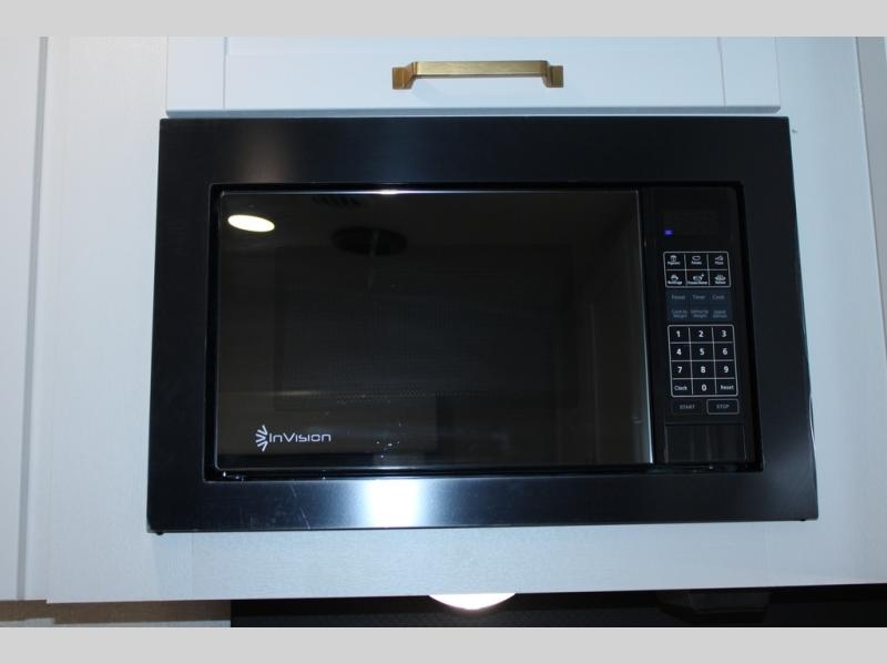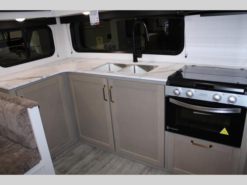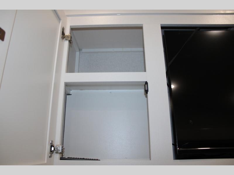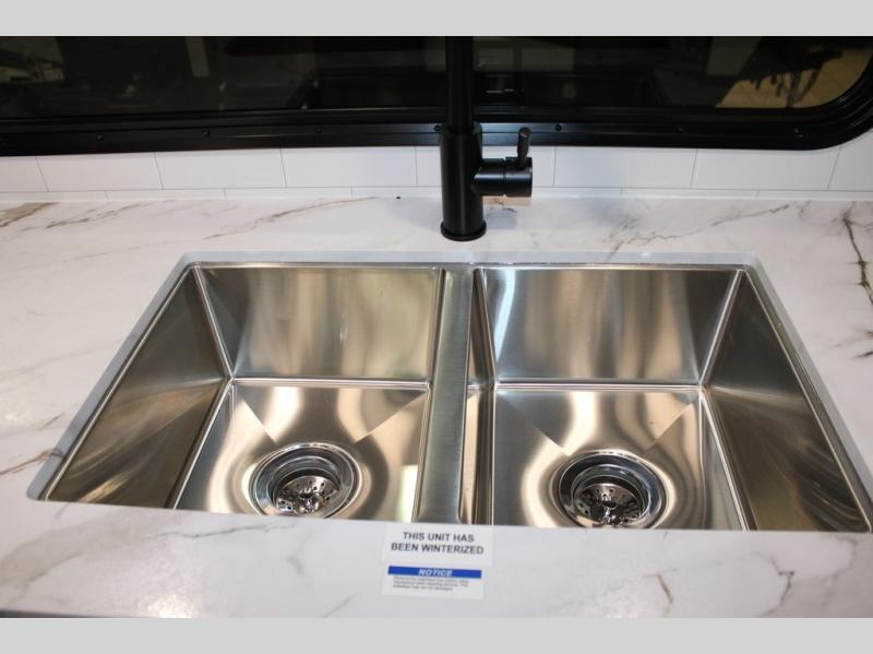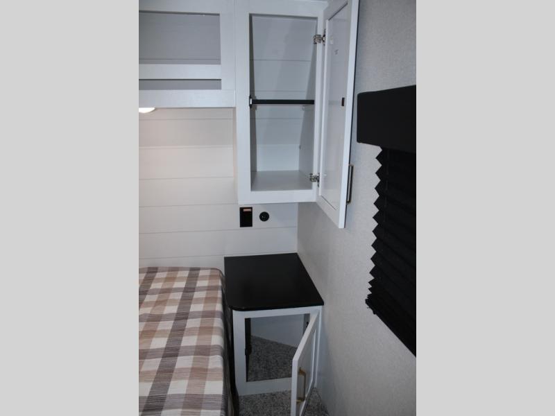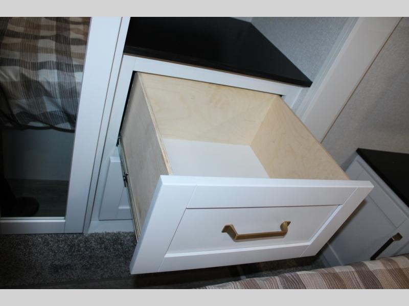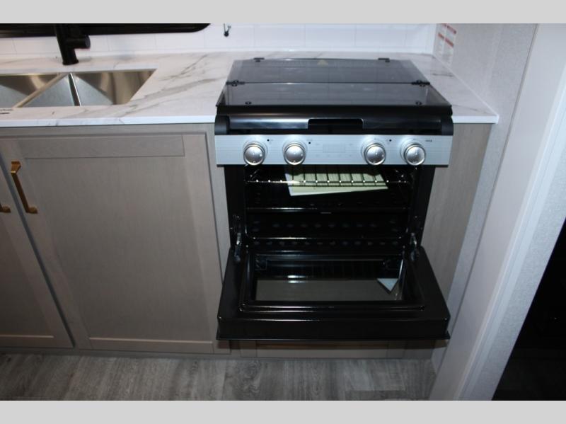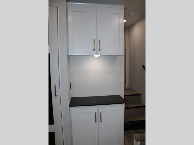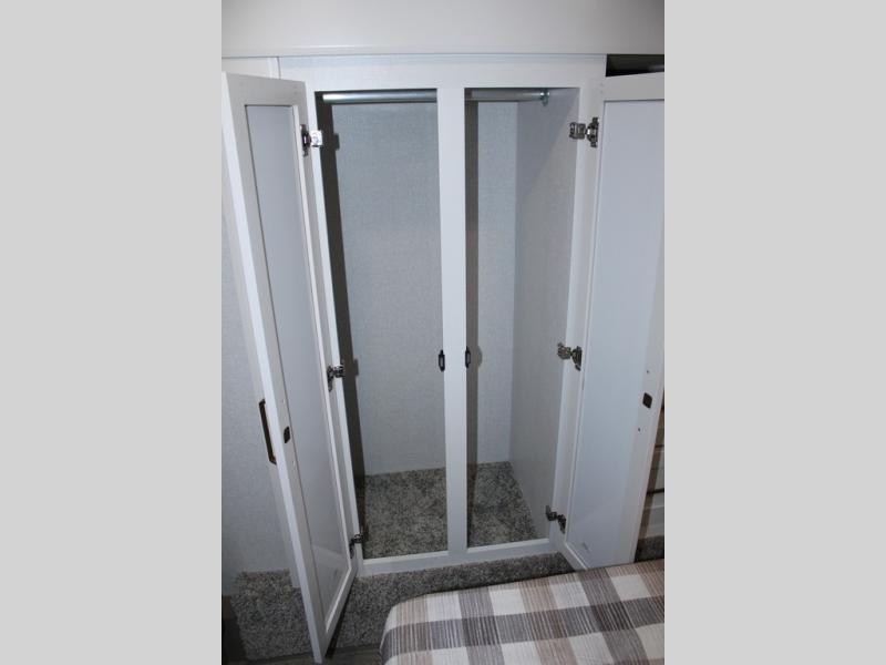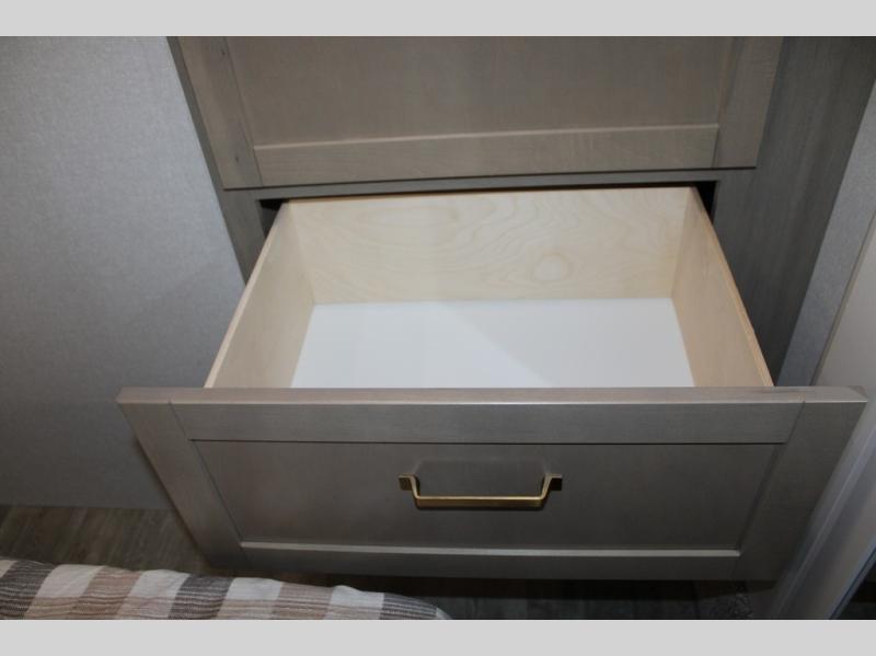 Camping just got a whole lot sweeter in this fifth wheel with double slides, a rear kitchen, and sleeping space for five to six. You'll love waking up each morning in the front private bedroom that includes a queen bed, dual nightstands and overhead cabinets, plus a wardrobe and dresser slide. Your guests who slept on the tri-fold sofa and booth dinette can convert these back to seating space in the morning, and breakfast can be made in the rear kitchen. Here, you'll find ample counter space, a microwave and range, plus a pantry and 12V refrigerator for food storage. Outside, gear can be stored in the pass-thru storage area, and you're sure to enjoy the 16' power awning with LED Lights!