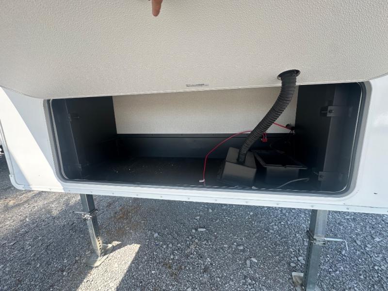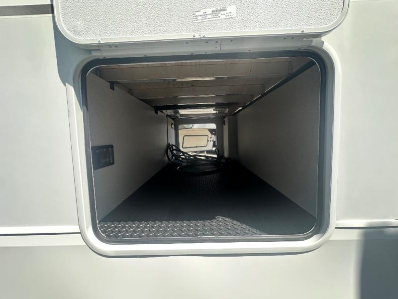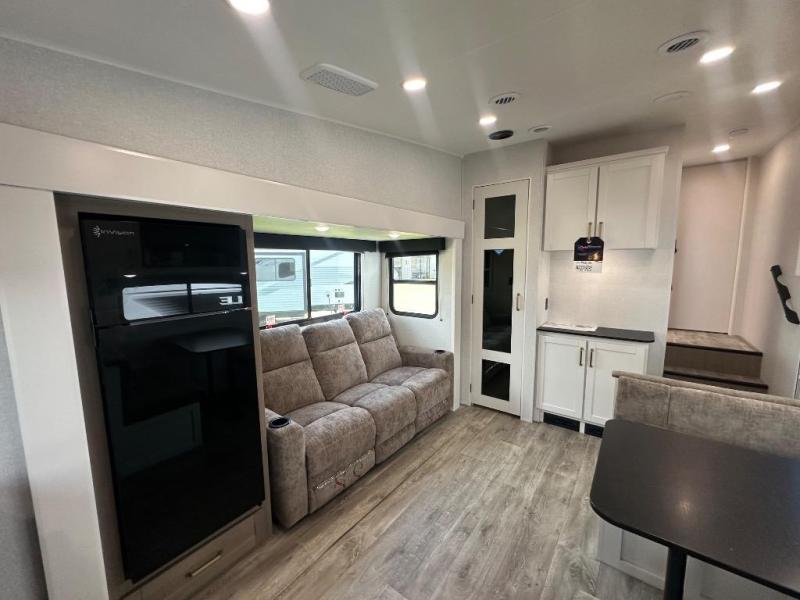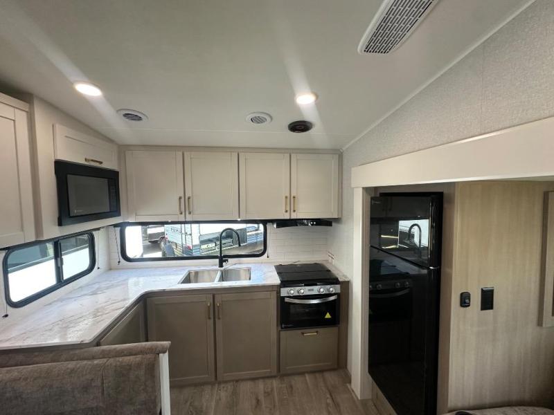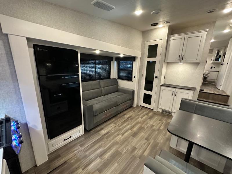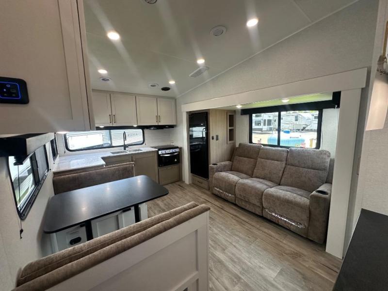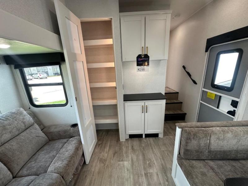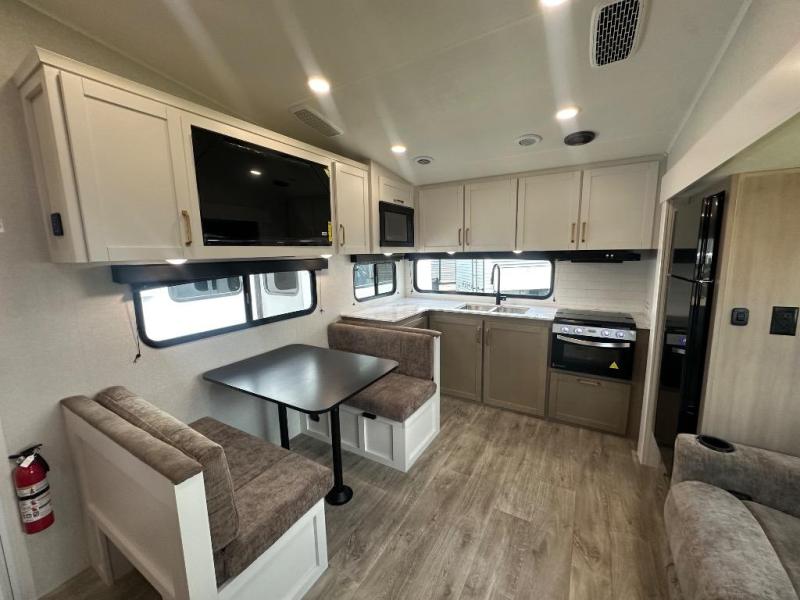 Camping just got a whole lot sweeter in this fifth wheel with double slides, a rear kitchen, and sleeping space for five to six. You'll love waking up each morning in the front private bedroom that includes a queen bed, dual nightstands and overhead cabinets, plus a wardrobe and dresser slide. Your guests who slept on the tri-fold sofa and booth dinette can convert these back to seating space in the morning, and breakfast can be made in the rear kitchen. Here, you'll find ample counter space, a microwave and range, plus a pantry and 12V refrigerator for food storage. Outside, gear can be stored in the pass-thru storage area, and you're sure to enjoy the 16' power awning with LED Lights!