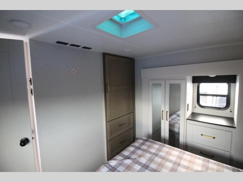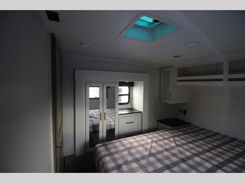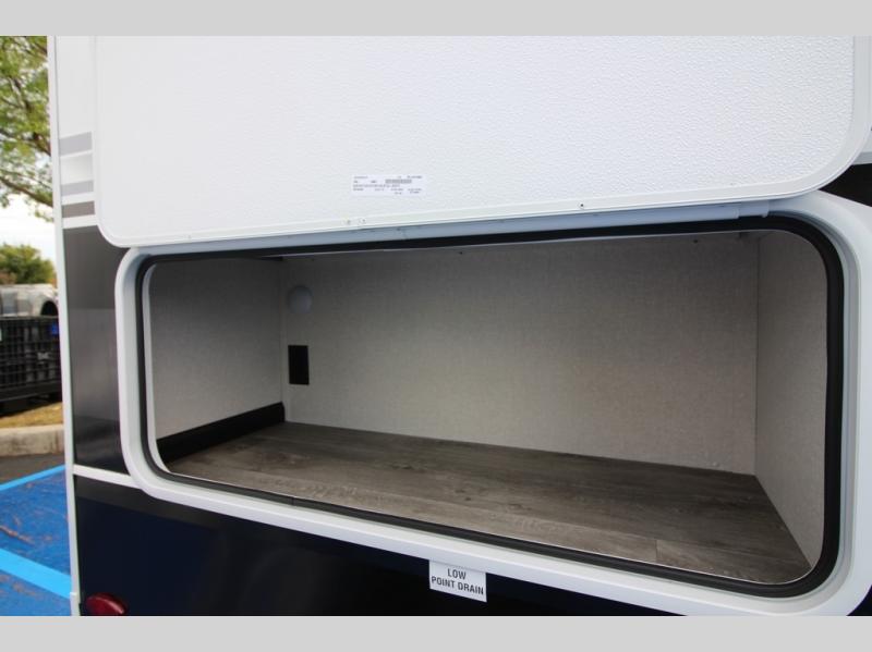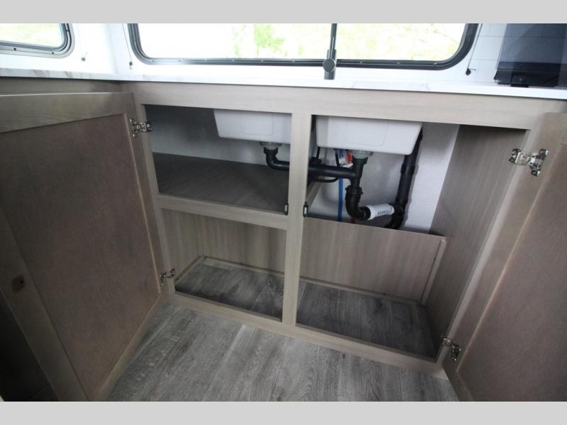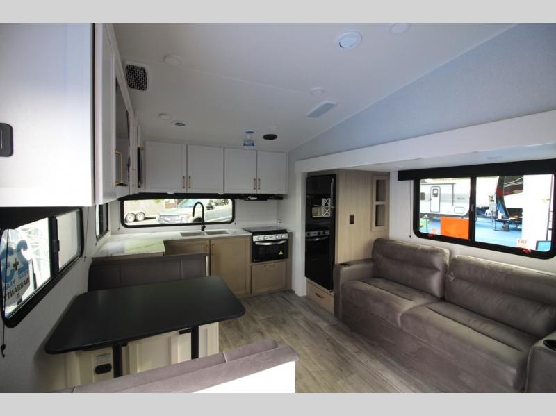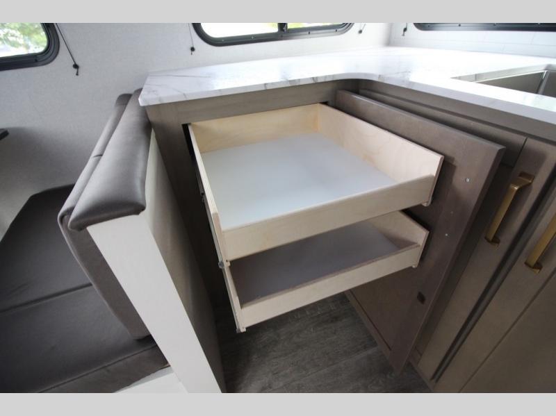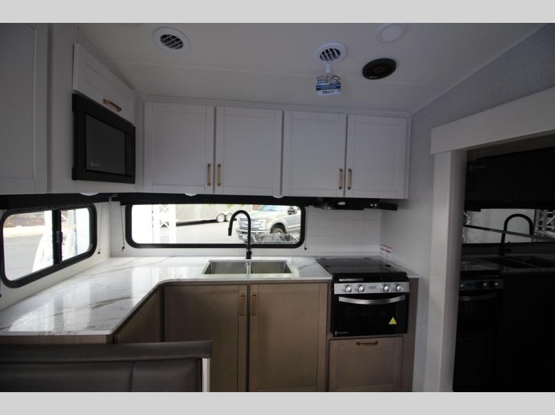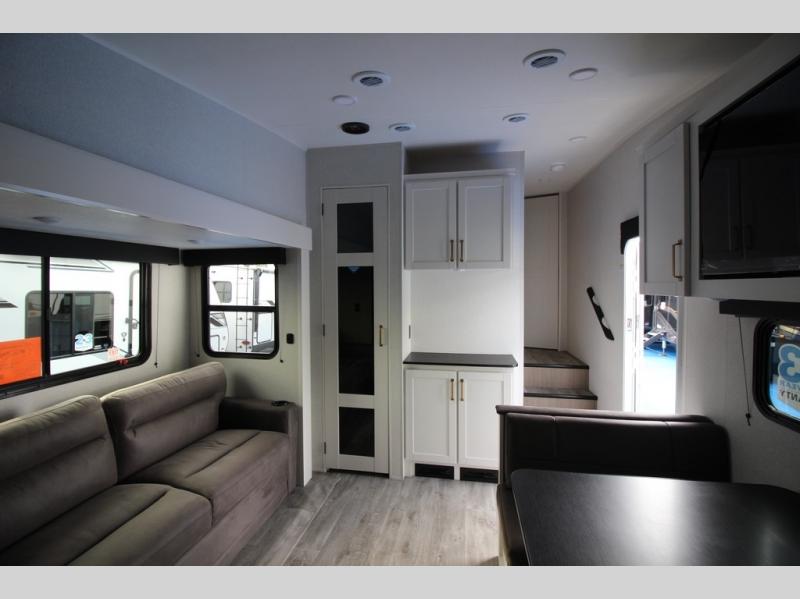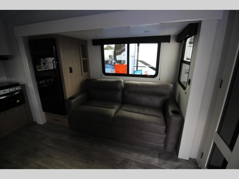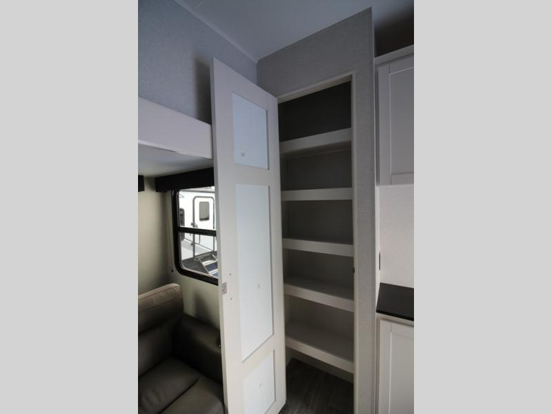 Camping just got a whole lot sweeter in this fifth wheel with double slides, a rear kitchen, and sleeping space for five to six. You'll love waking up each morning in the front private bedroom that includes a queen bed, dual nightstands and overhead cabinets, plus a wardrobe and dresser slide. Your guests who slept on the tri-fold sofa and booth dinette can convert these back to seating space in the morning, and breakfast can be made in the rear kitchen. Here, you'll find ample counter space, a microwave and range, plus a pantry and 12V refrigerator for food storage. Outside, gear can be stored in the pass-thru storage area, and you're sure to enjoy the 16' power awning with LED Lights!