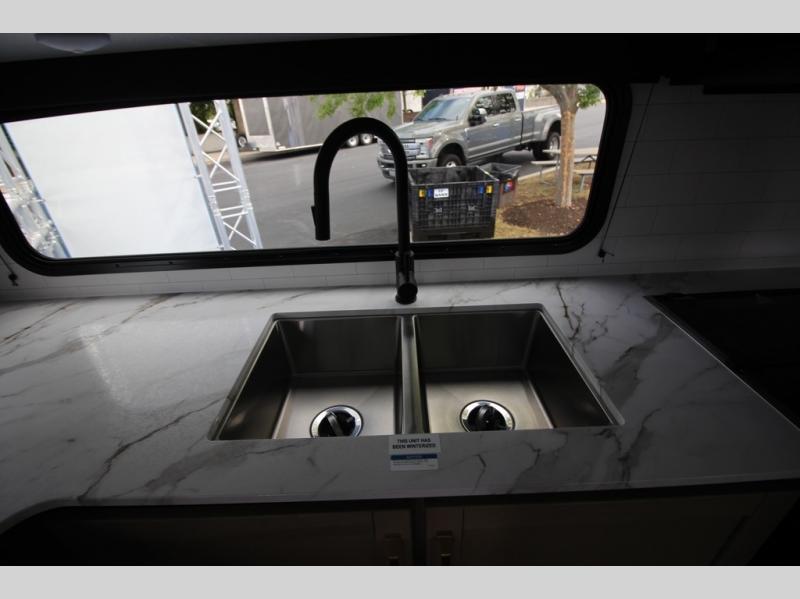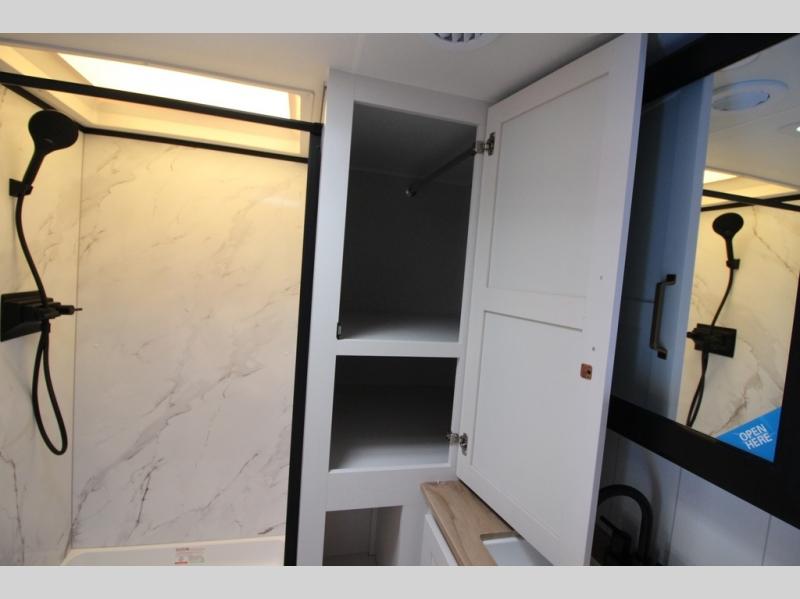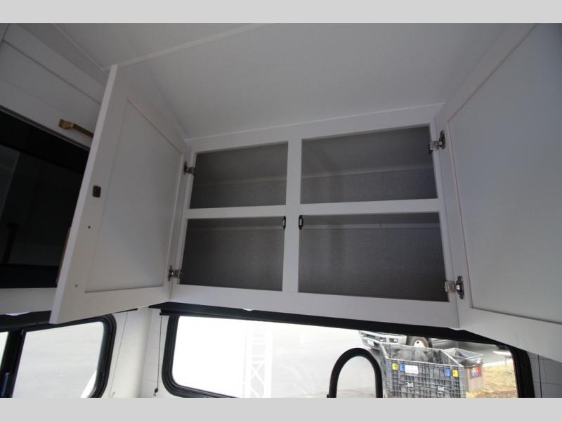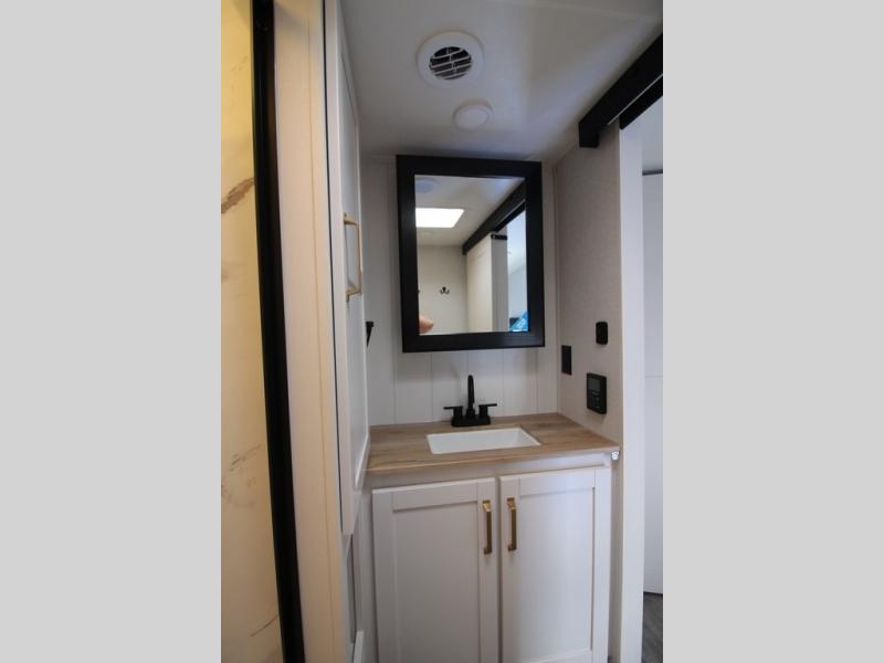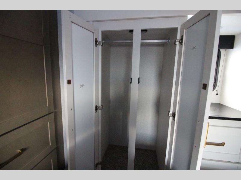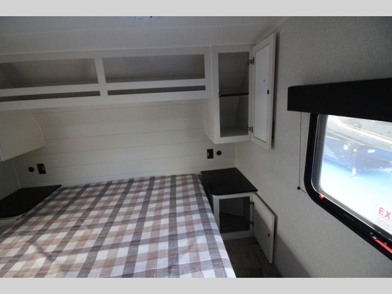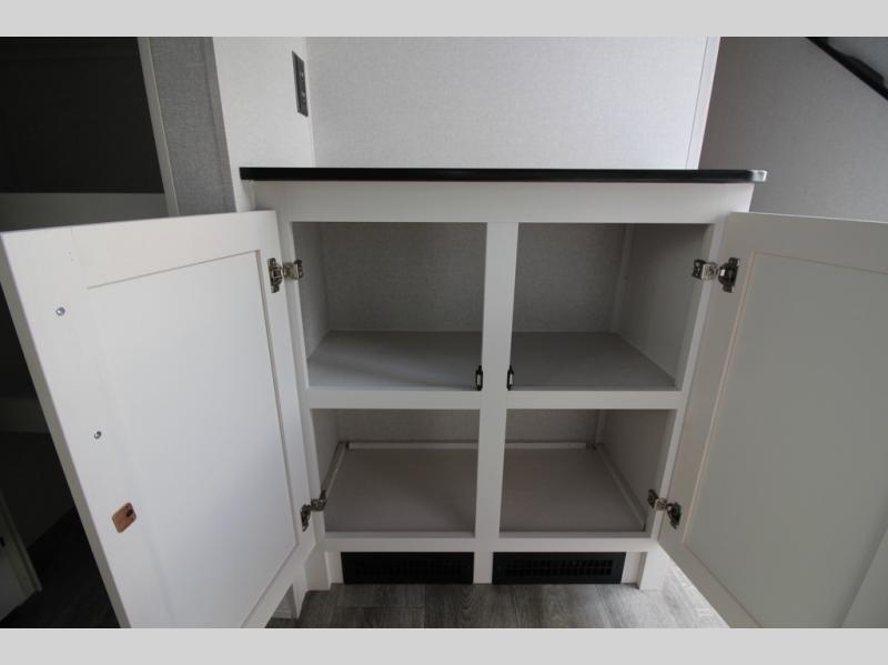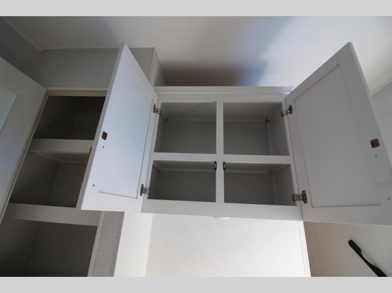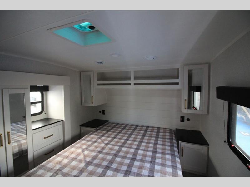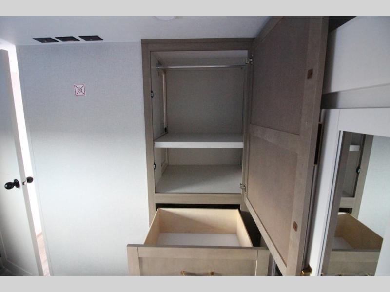 Camping just got a whole lot sweeter in this fifth wheel with double slides, a rear kitchen, and sleeping space for five to six. You'll love waking up each morning in the front private bedroom that includes a queen bed, dual nightstands and overhead cabinets, plus a wardrobe and dresser slide. Your guests who slept on the tri-fold sofa and booth dinette can convert these back to seating space in the morning, and breakfast can be made in the rear kitchen. Here, you'll find ample counter space, a microwave and range, plus a pantry and 12V refrigerator for food storage. Outside, gear can be stored in the pass-thru storage area, and you're sure to enjoy the 16' power awning with LED Lights!