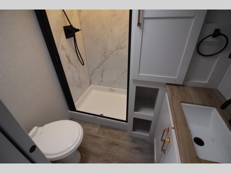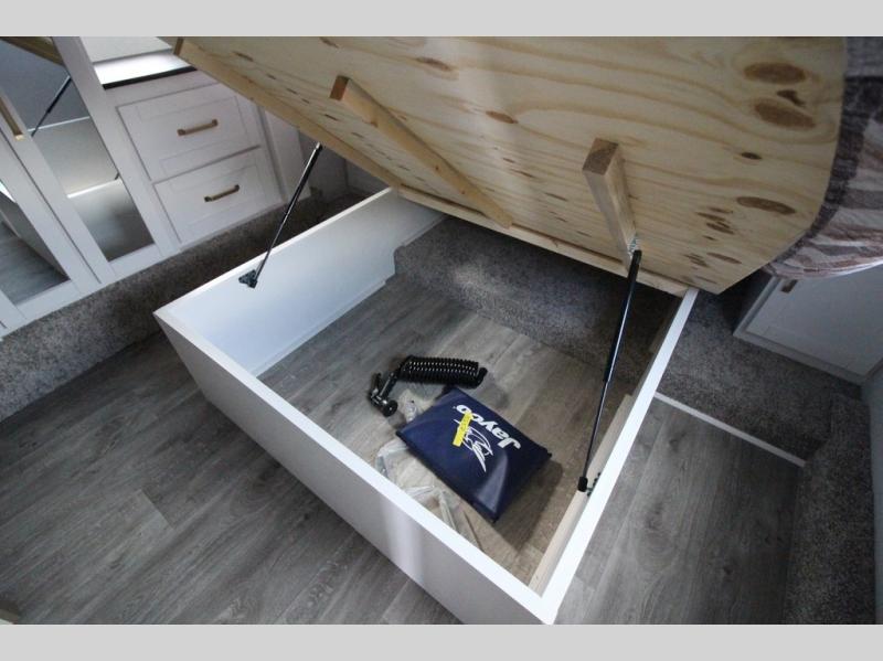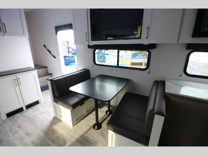With any Eagle SLE fifth wheel by Jayco, you will enjoy a lighter tow weight, high-end finishes, and the same quality construction you've come to expect from Jayco! There is an Alpha Ply TPO roof membrane, a fully enclosed and heated underbelly, plus Stronghold VBL walls for added durability. There is also a rear 2" towing receiver outside, along with metal slam latch baggage doors, MORryde Step Above entry steps, and a Winegard Air 360 antenna with router prep if you want to stay connected as you camp. Once inside you'll enjoy the handcrafted and glazed door/drawer fronts, blackout pleated shades throughout, and residential vinyl flooring throughout with no carpet for an easier clean. The on-demand water heater, 30K BTU furnace, and 15K BTU "Whisper Quiet" A/C will ensure your comfort year around, and the optional Overland 1 Solar Package can be added if you need off-grid capabilities!
