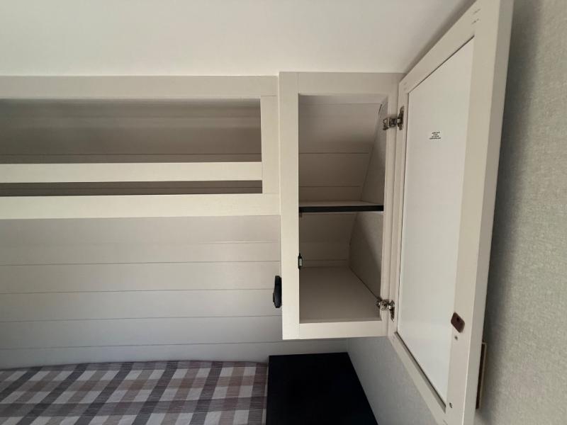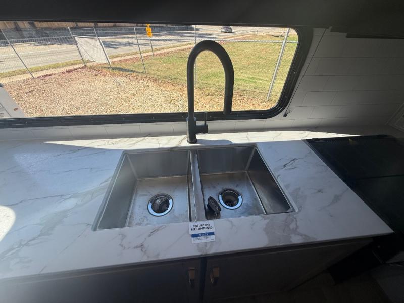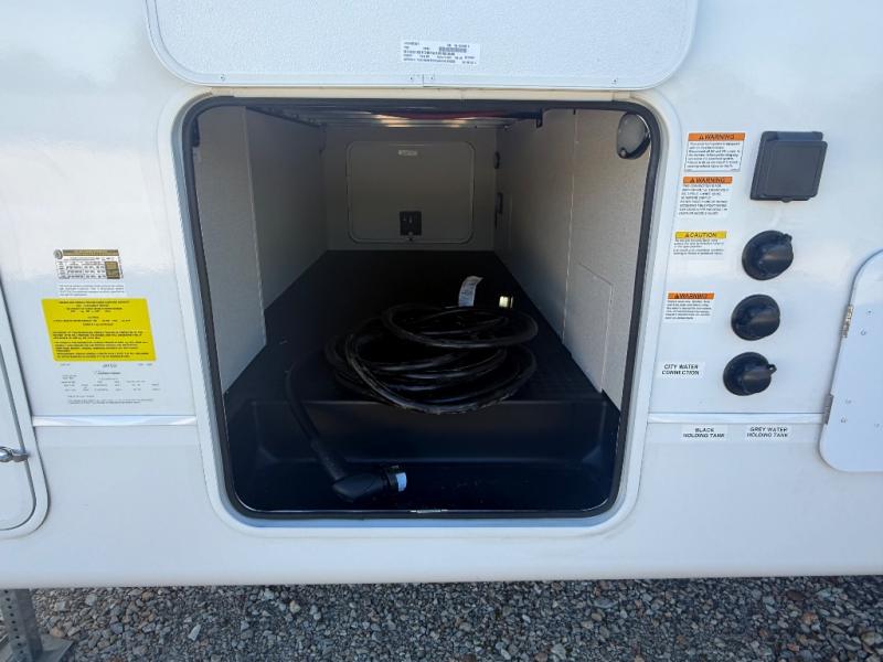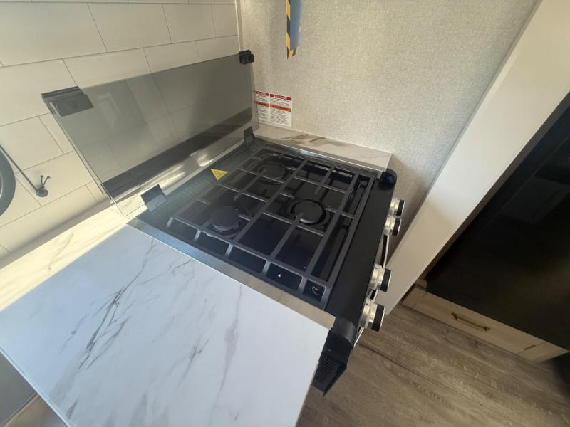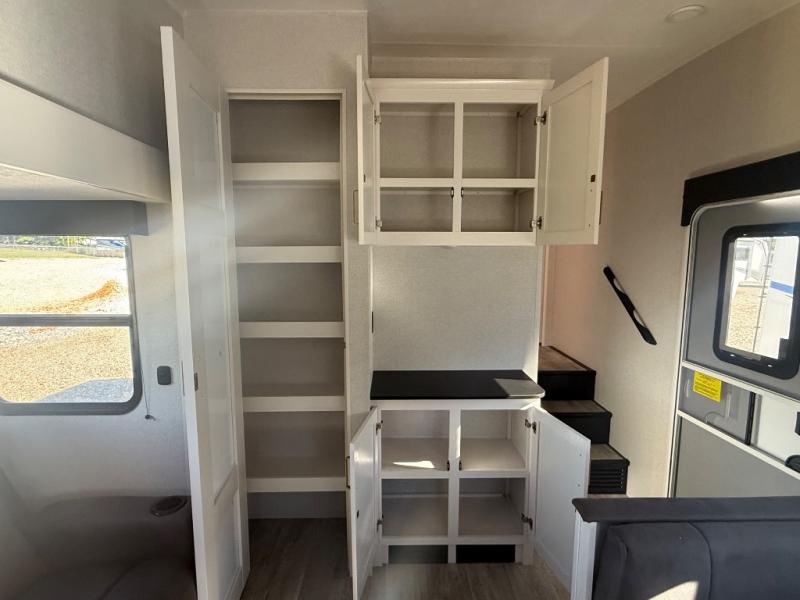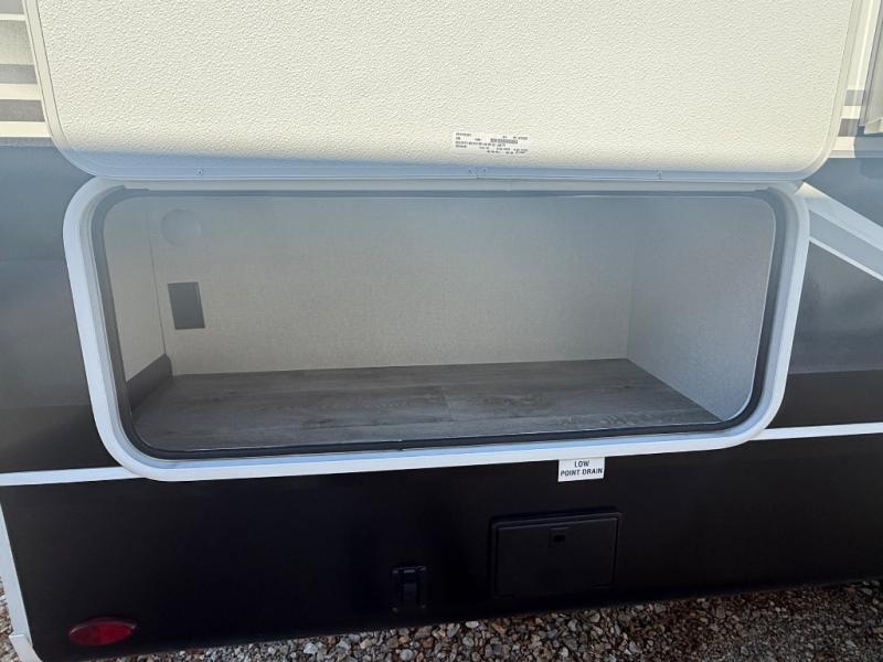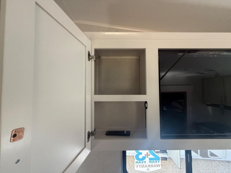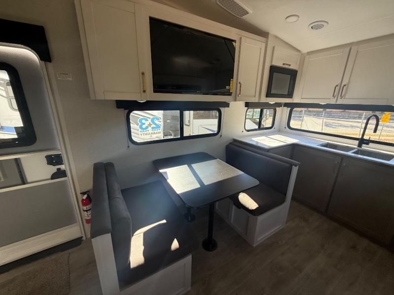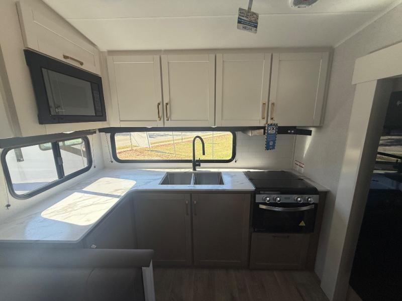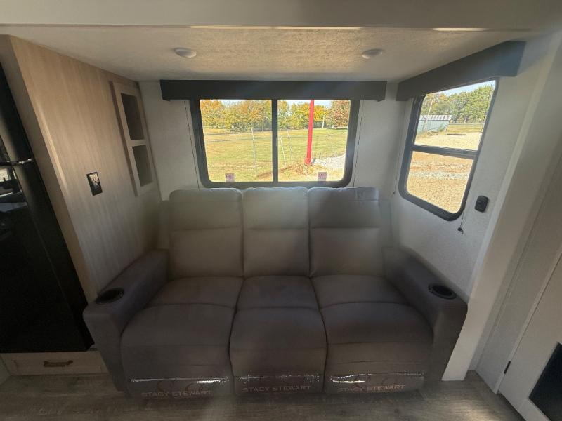 Camping just got a whole lot sweeter in this fifth wheel with double slides, a rear kitchen, and sleeping space for five to six. You'll love waking up each morning in the front private bedroom that includes a queen bed, dual nightstands and overhead cabinets, plus a wardrobe and dresser slide. Your guests who slept on the tri-fold sofa and booth dinette can convert these back to seating space in the morning, and breakfast can be made in the rear kitchen. Here, you'll find ample counter space, a microwave and range, plus a pantry and 12V refrigerator for food storage. Outside, gear can be stored in the pass-thru storage area, and you're sure to enjoy the 16' power awning with LED Lights!