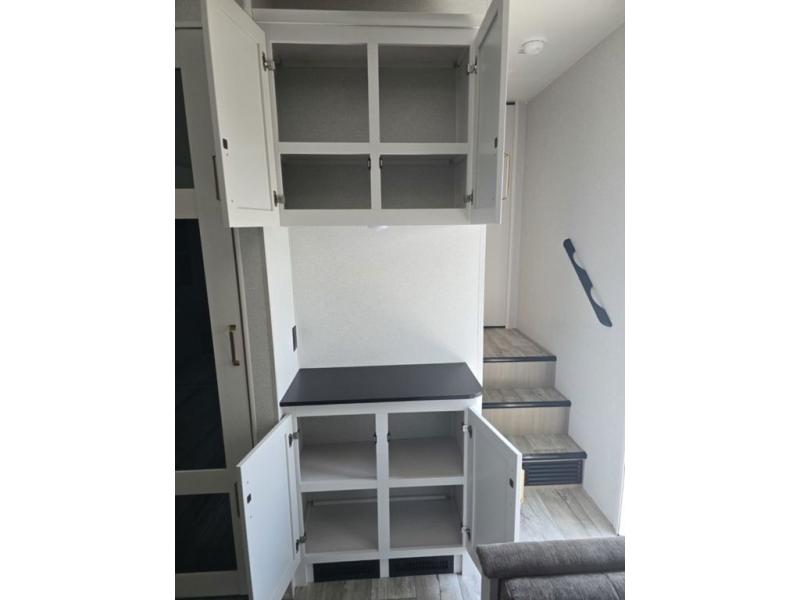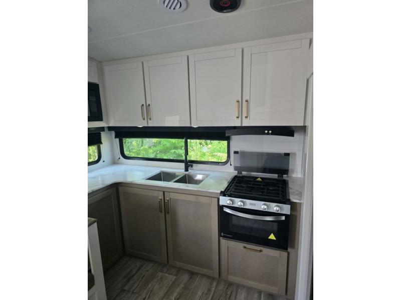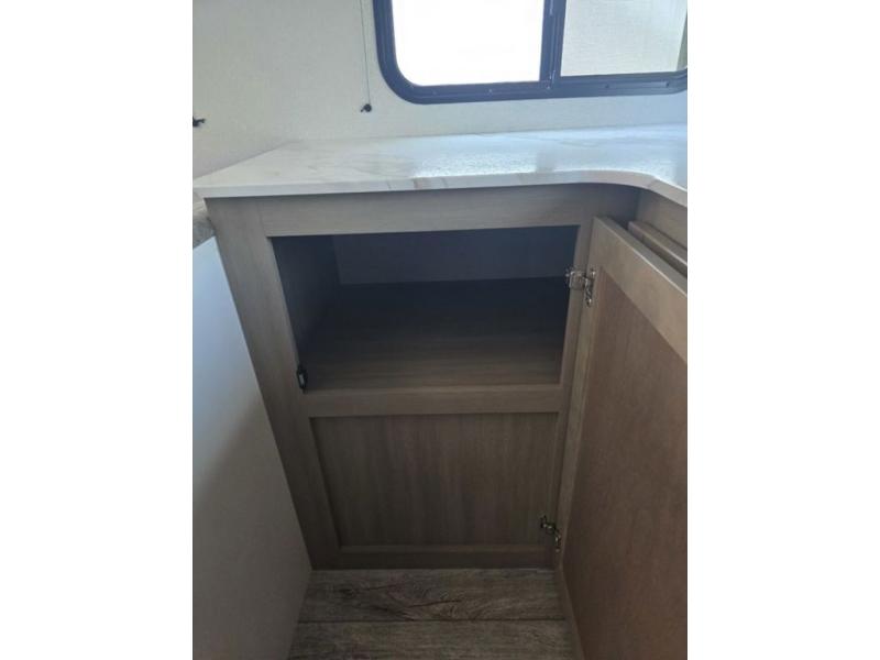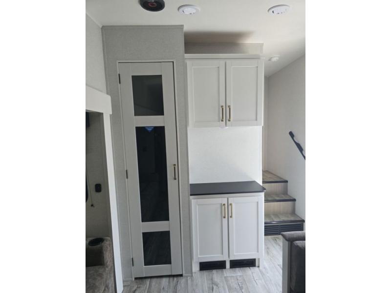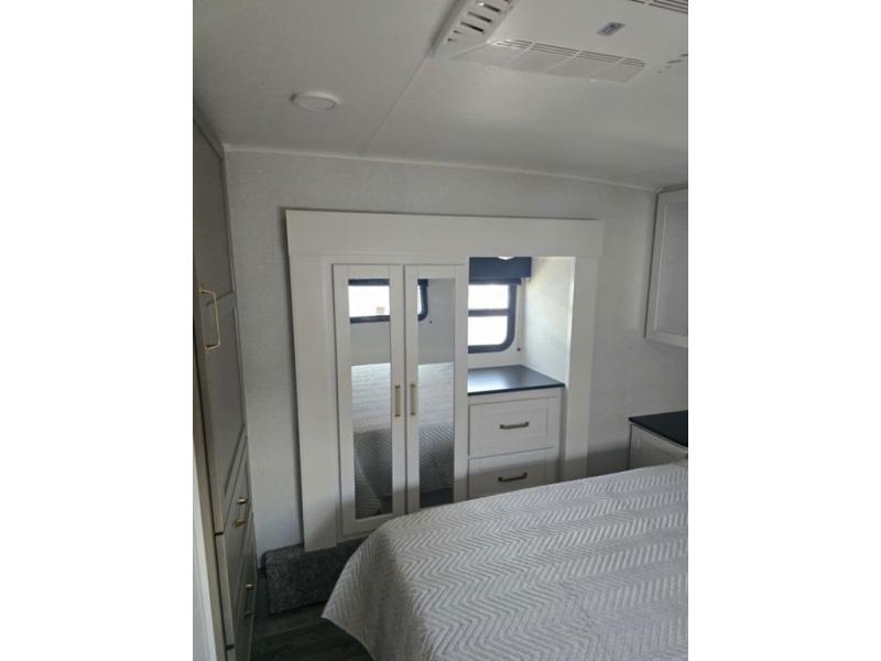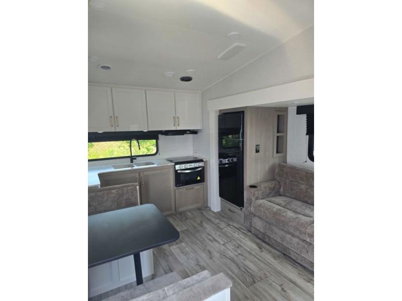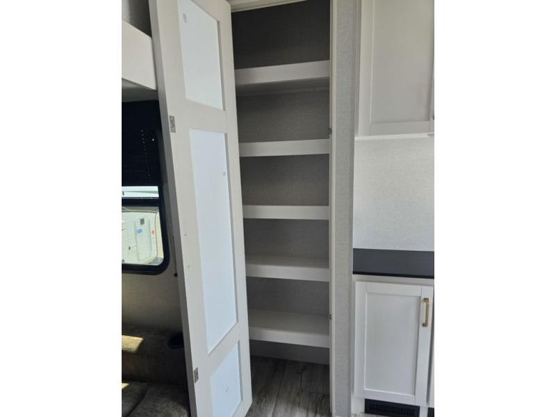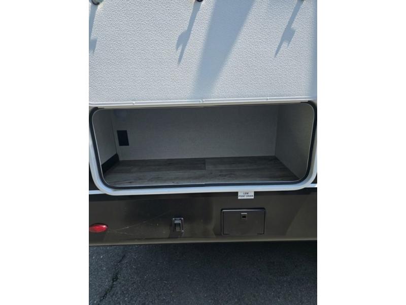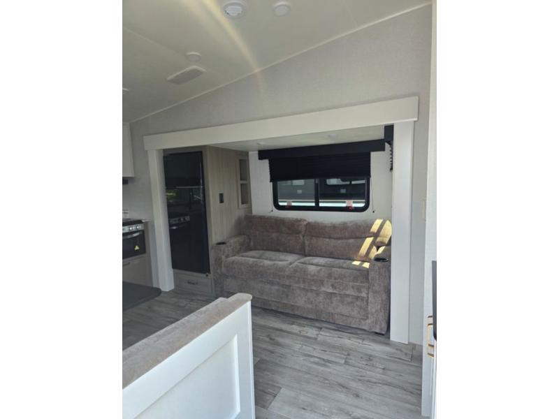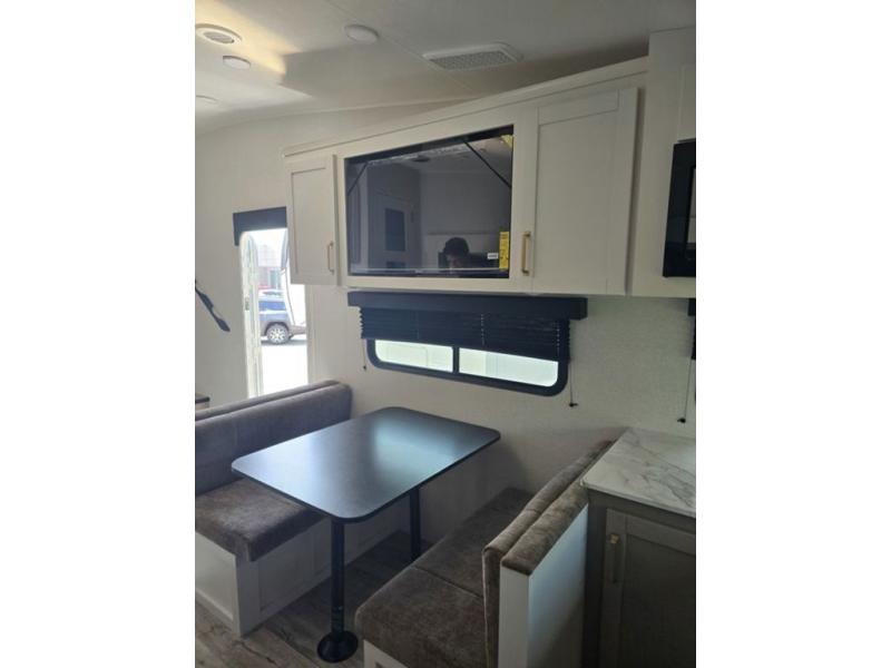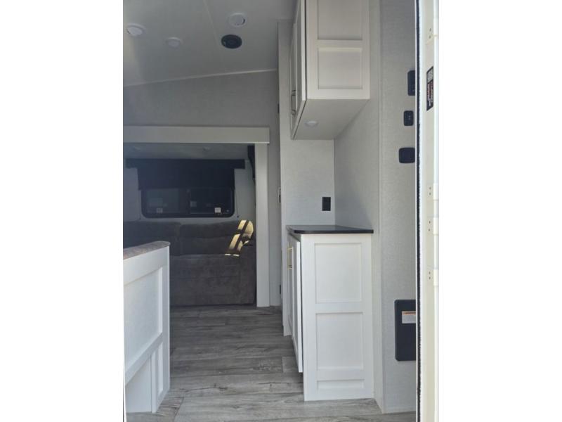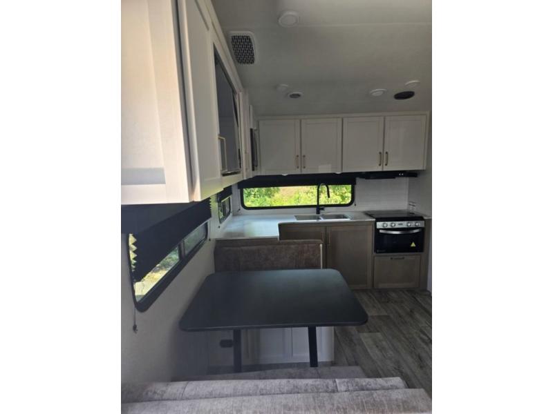 Camping just got a whole lot sweeter in this fifth wheel with double slides, a rear kitchen, and sleeping space for five to six. You'll love waking up each morning in the front private bedroom that includes a queen bed, dual nightstands and overhead cabinets, plus a wardrobe and dresser slide. Your guests who slept on the tri-fold sofa and booth dinette can convert these back to seating space in the morning, and breakfast can be made in the rear kitchen. Here, you'll find ample counter space, a microwave and range, plus a pantry and 12V refrigerator for food storage. Outside, gear can be stored in the pass-thru storage area, and you're sure to enjoy the 16' power awning with LED Lights!