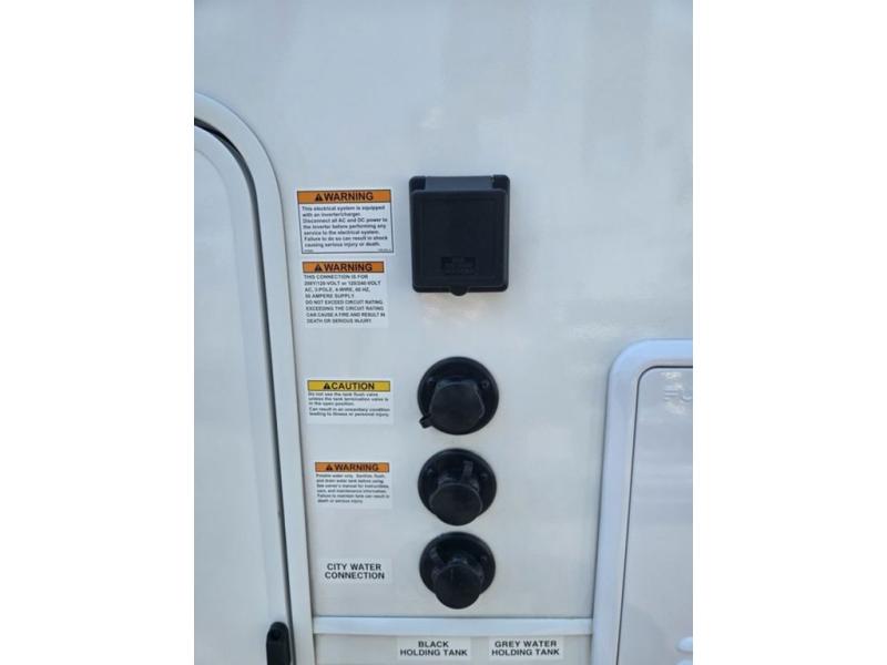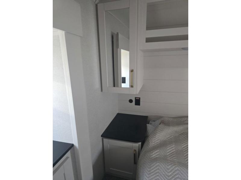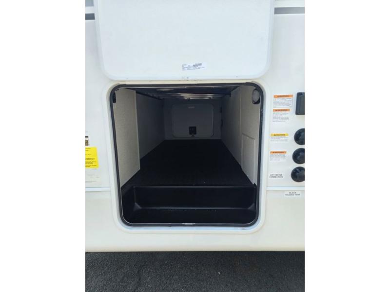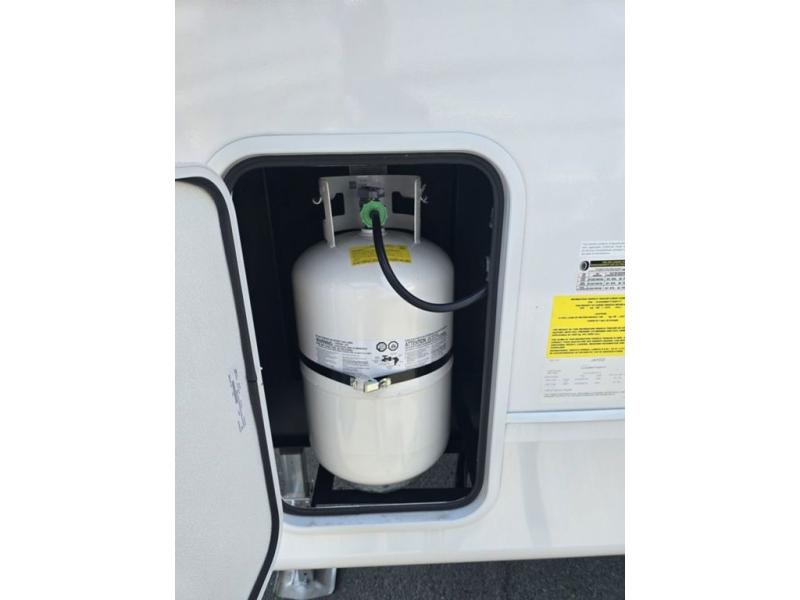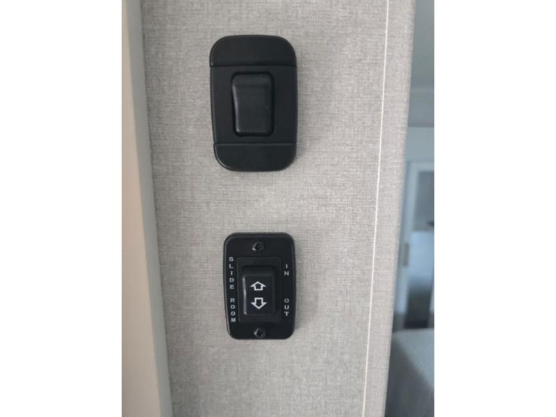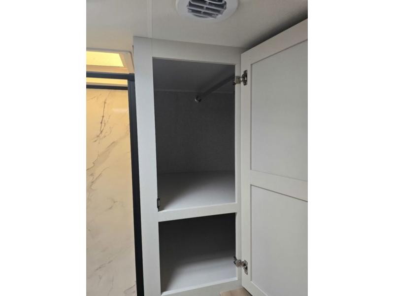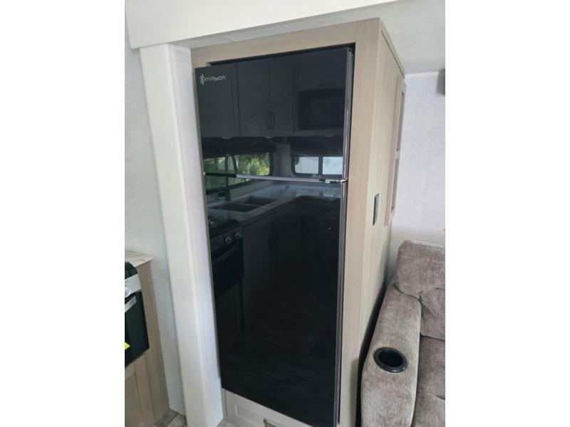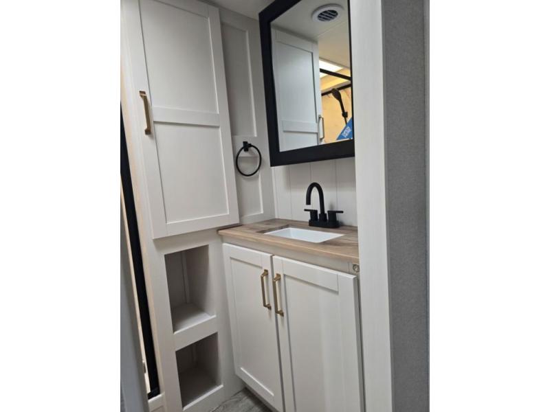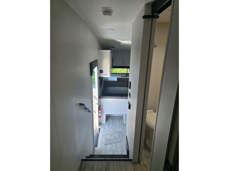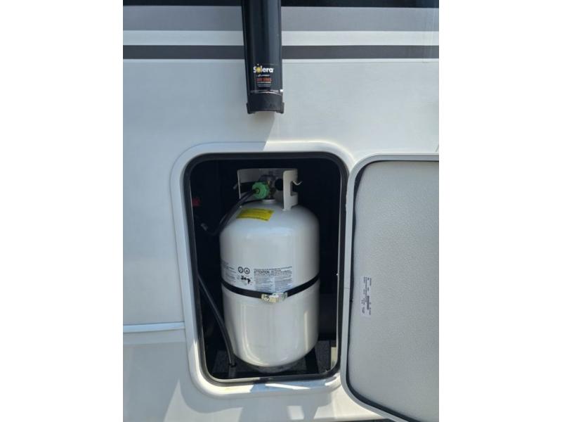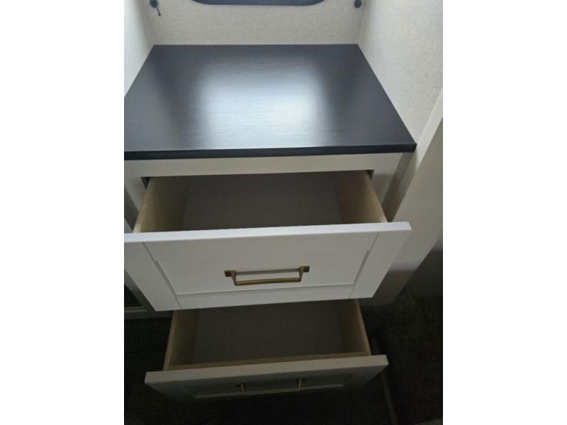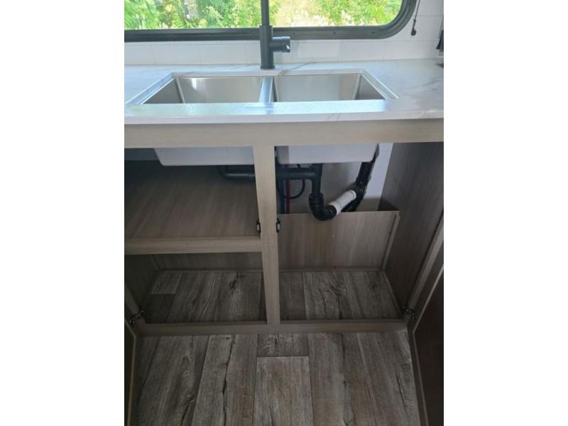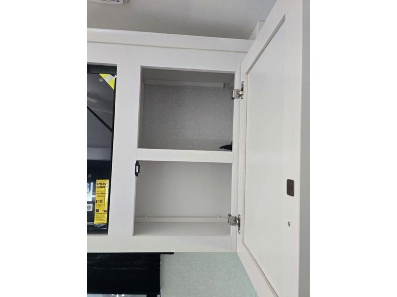 Camping just got a whole lot sweeter in this fifth wheel with double slides, a rear kitchen, and sleeping space for five to six. You'll love waking up each morning in the front private bedroom that includes a queen bed, dual nightstands and overhead cabinets, plus a wardrobe and dresser slide. Your guests who slept on the tri-fold sofa and booth dinette can convert these back to seating space in the morning, and breakfast can be made in the rear kitchen. Here, you'll find ample counter space, a microwave and range, plus a pantry and 12V refrigerator for food storage. Outside, gear can be stored in the pass-thru storage area, and you're sure to enjoy the 16' power awning with LED Lights!