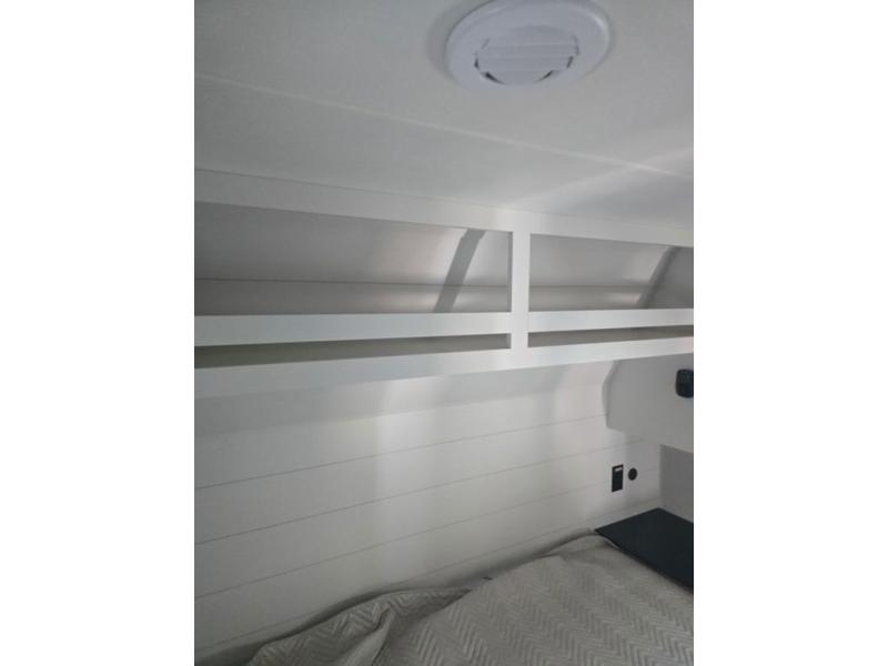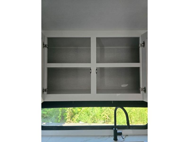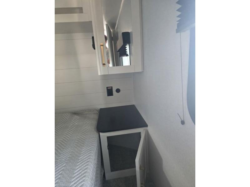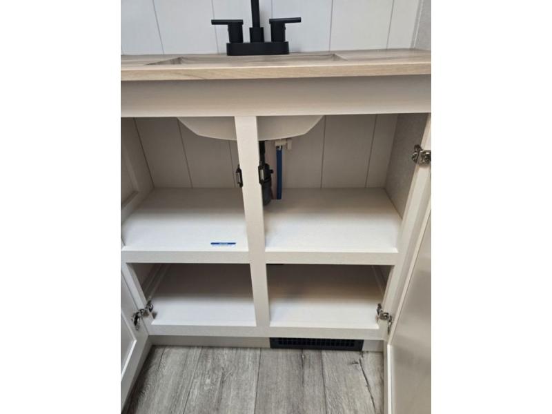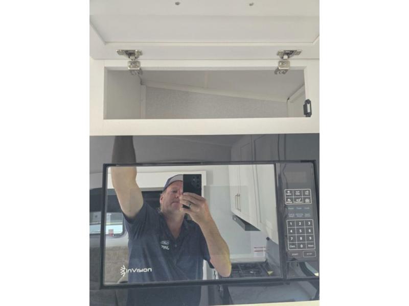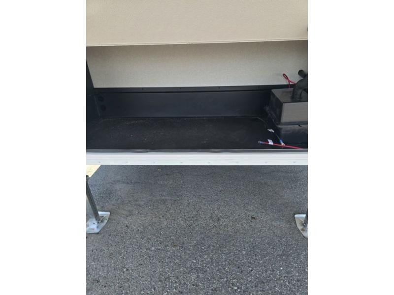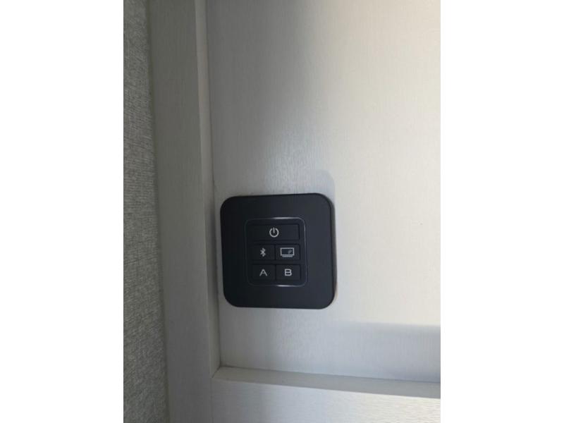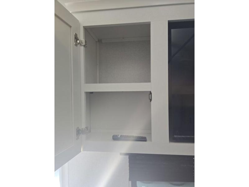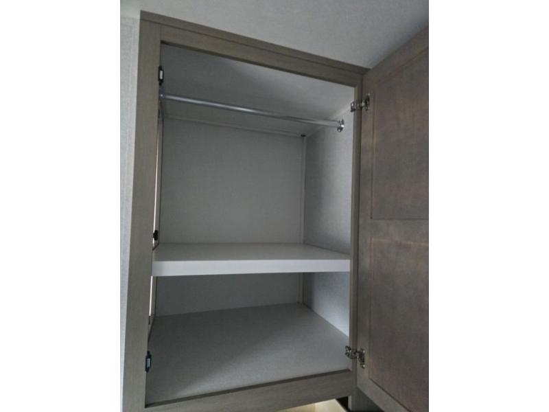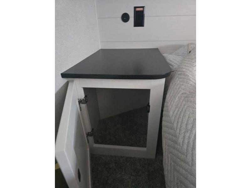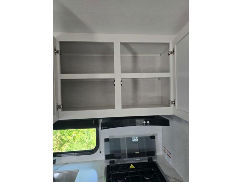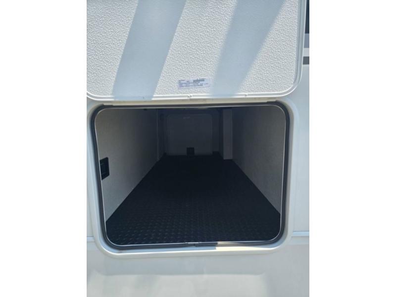 Camping just got a whole lot sweeter in this fifth wheel with double slides, a rear kitchen, and sleeping space for five to six. You'll love waking up each morning in the front private bedroom that includes a queen bed, dual nightstands and overhead cabinets, plus a wardrobe and dresser slide. Your guests who slept on the tri-fold sofa and booth dinette can convert these back to seating space in the morning, and breakfast can be made in the rear kitchen. Here, you'll find ample counter space, a microwave and range, plus a pantry and 12V refrigerator for food storage. Outside, gear can be stored in the pass-thru storage area, and you're sure to enjoy the 16' power awning with LED Lights!