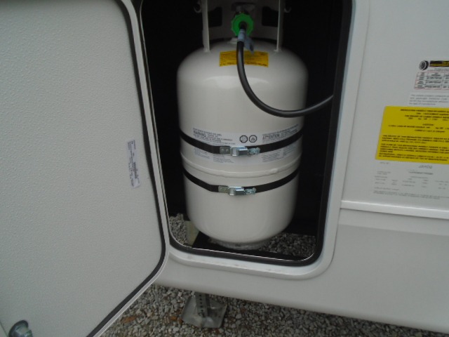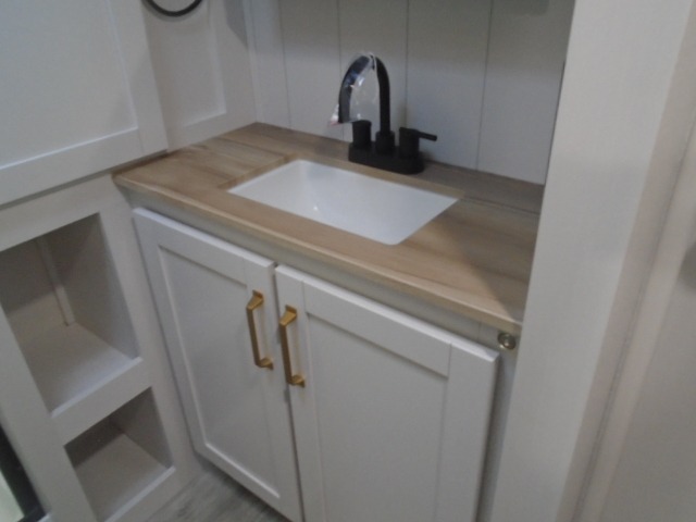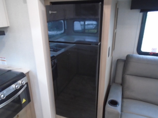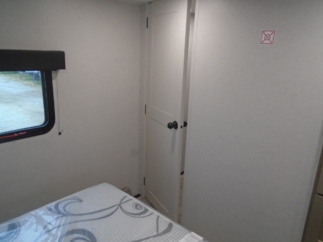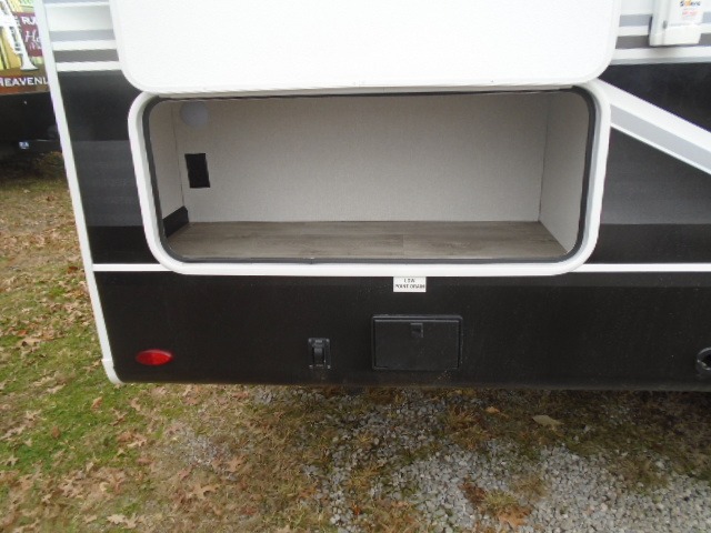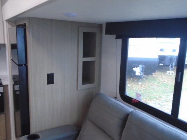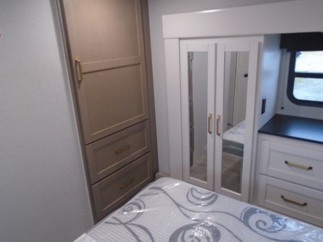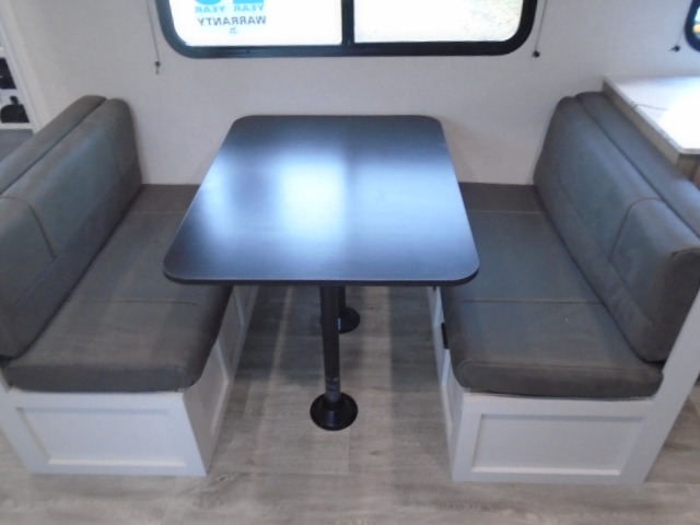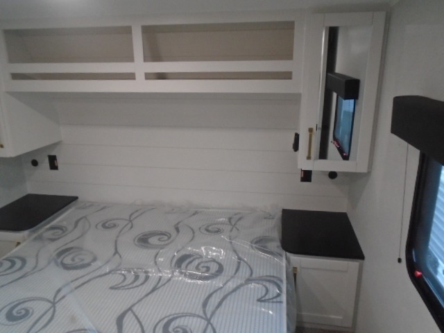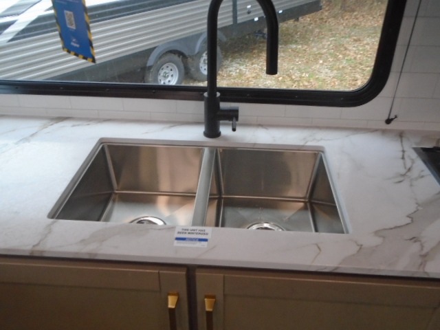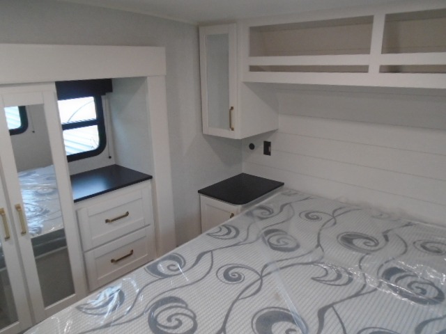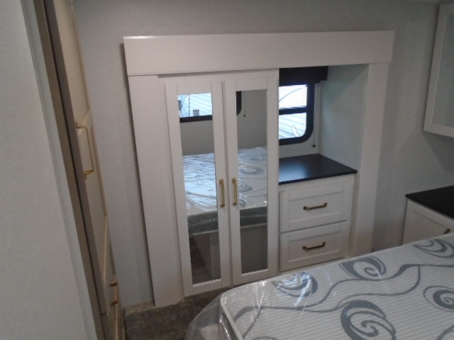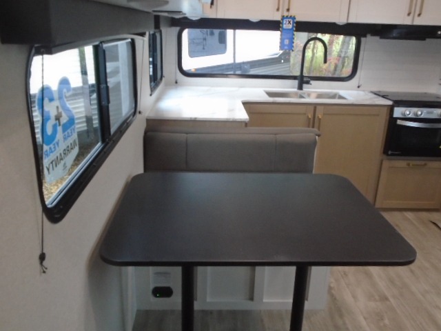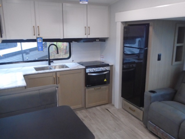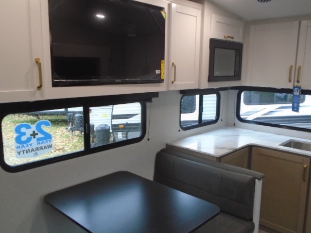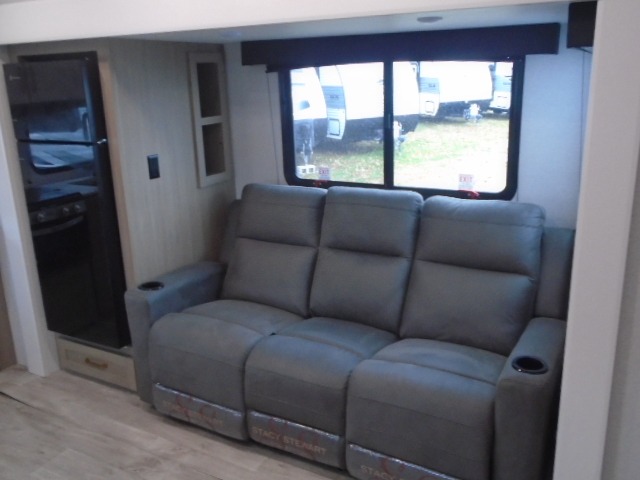 Camping just got a whole lot sweeter in this fifth wheel with double slides, a rear kitchen, and sleeping space for five to six. You'll love waking up each morning in the front private bedroom that includes a queen bed, dual nightstands and overhead cabinets, plus a wardrobe and dresser slide. Your guests who slept on the tri-fold sofa and booth dinette can convert these back to seating space in the morning, and breakfast can be made in the rear kitchen. Here, you'll find ample counter space, a microwave and range, plus a pantry and 12V refrigerator for food storage. Outside, gear can be stored in the pass-thru storage area, and you're sure to enjoy the 16' power awning with LED Lights!
