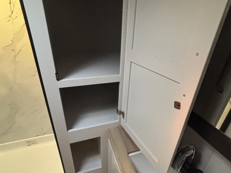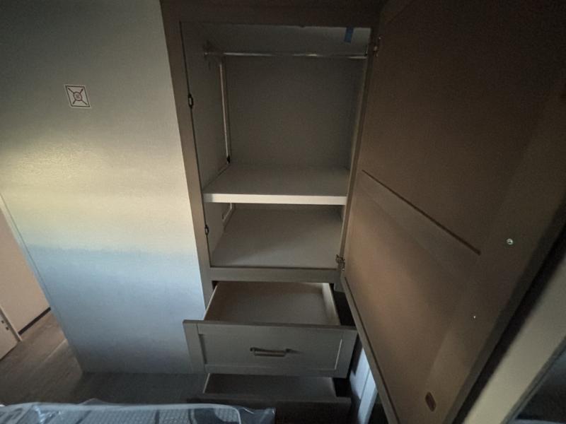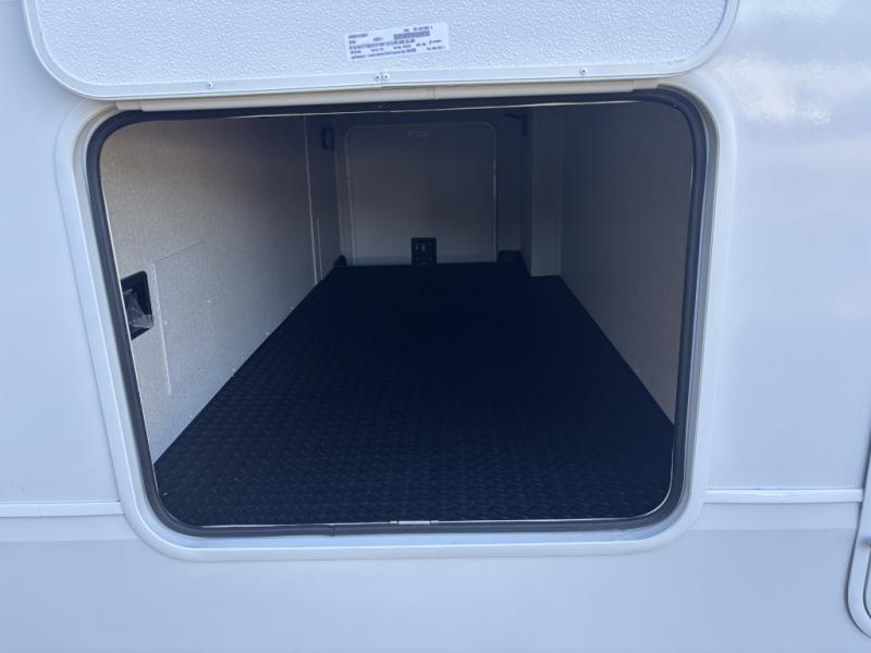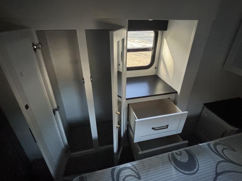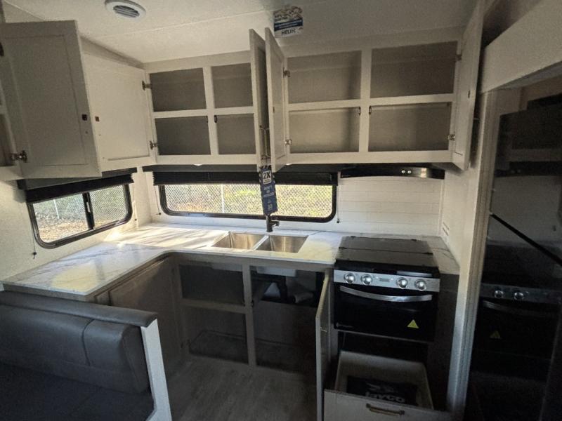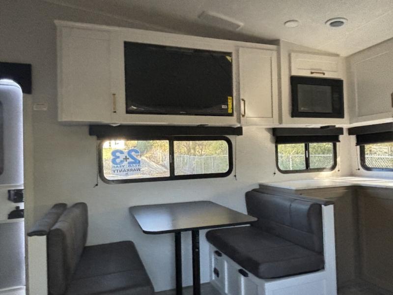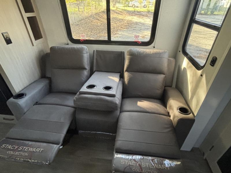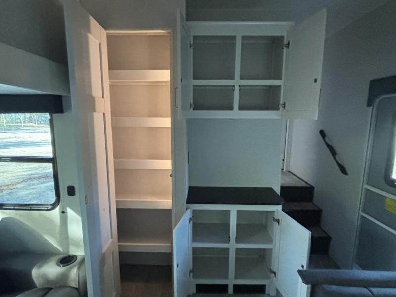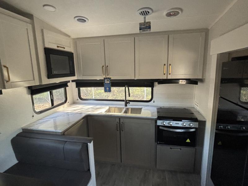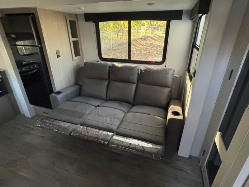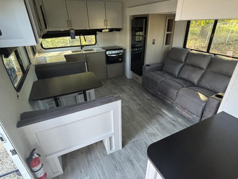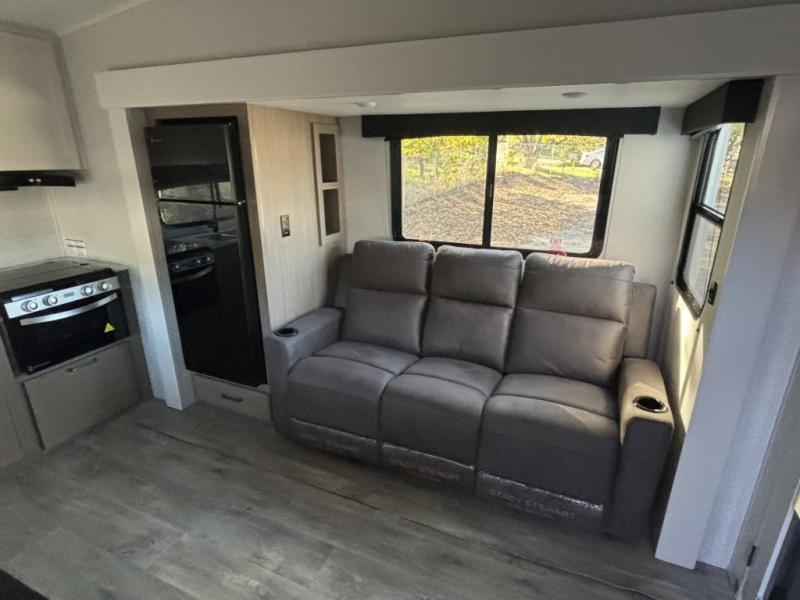 Camping just got a whole lot sweeter in this fifth wheel with double slides, a rear kitchen, and sleeping space for five to six. You'll love waking up each morning in the front private bedroom that includes a queen bed, dual nightstands and overhead cabinets, plus a wardrobe and dresser slide. Your guests who slept on the tri-fold sofa and booth dinette can convert these back to seating space in the morning, and breakfast can be made in the rear kitchen. Here, you'll find ample counter space, a microwave and range, plus a pantry and 12V refrigerator for food storage. Outside, gear can be stored in the pass-thru storage area, and you're sure to enjoy the 16' power awning with LED Lights!