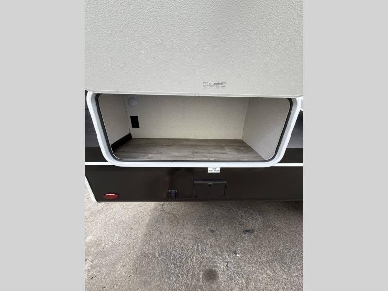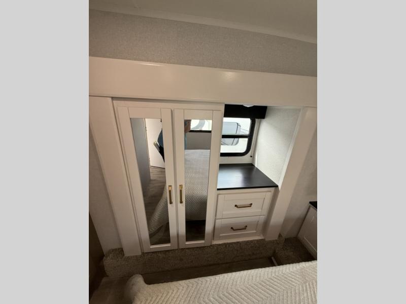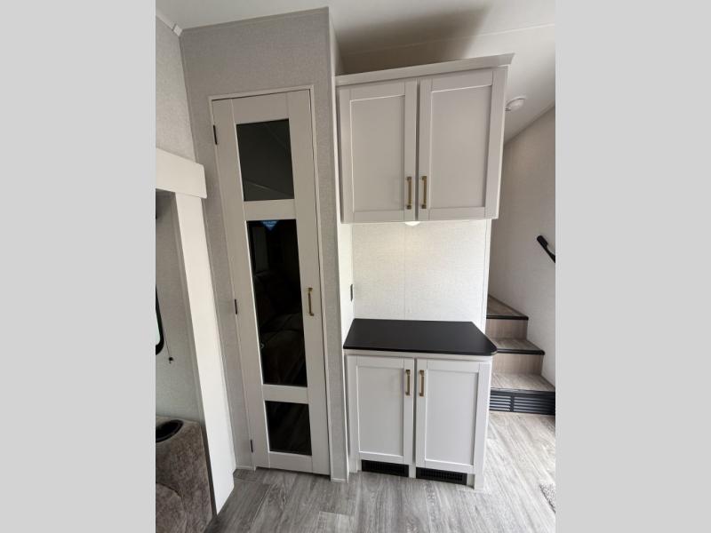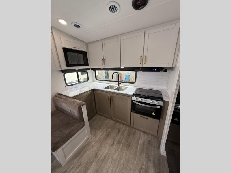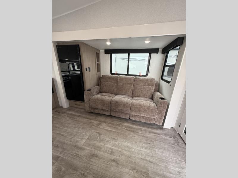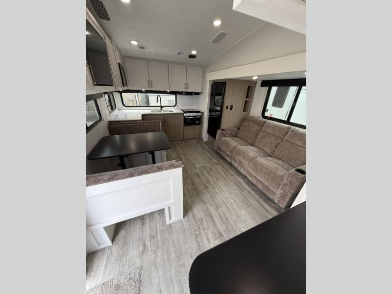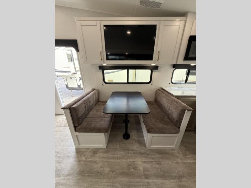 Camping just got a whole lot sweeter in this fifth wheel with double slides, a rear kitchen, and sleeping space for five to six. You'll love waking up each morning in the front private bedroom that includes a queen bed, dual nightstands and overhead cabinets, plus a wardrobe and dresser slide. Your guests who slept on the tri-fold sofa and booth dinette can convert these back to seating space in the morning, and breakfast can be made in the rear kitchen. Here, you'll find ample counter space, a microwave and range, plus a pantry and 12V refrigerator for food storage. Outside, gear can be stored in the pass-thru storage area, and you're sure to enjoy the 16' power awning with LED Lights!