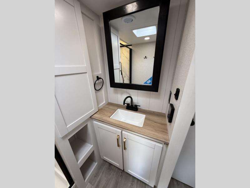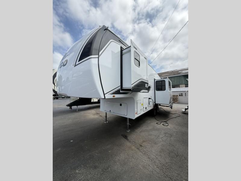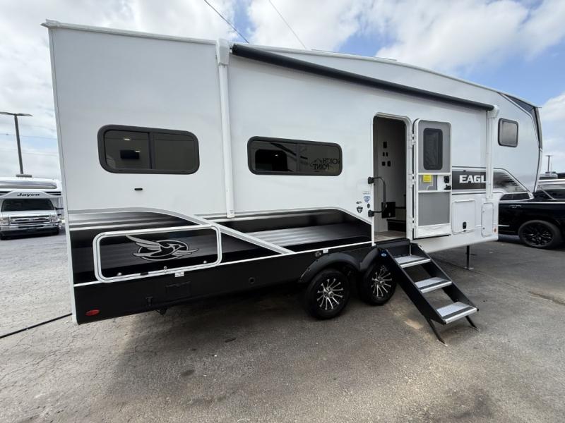 With any Eagle SLE fifth wheel by Jayco, you will enjoy a lighter tow weight, high-end finishes, and the same quality construction you've come to expect from Jayco! There is an Alpha Ply TPO roof membrane, a fully enclosed and heated underbelly, plus Stronghold VBL walls for added durability. There is also a rear 2" towing receiver outside, along with metal slam latch baggage doors, MORryde Step Above entry steps, and a Winegard Air 360 antenna with router prep if you want to stay connected as you camp. Once inside you'll enjoy the handcrafted and glazed door/drawer fronts, blackout pleated shades throughout, and residential vinyl flooring throughout with no carpet for an easier clean. The on-demand water heater, 30K BTU furnace, and 15K BTU "Whisper Quiet" A/C will ensure your comfort year around, and the optional Overland 1 Solar Package can be added if you need off-grid capabilities!