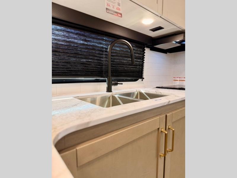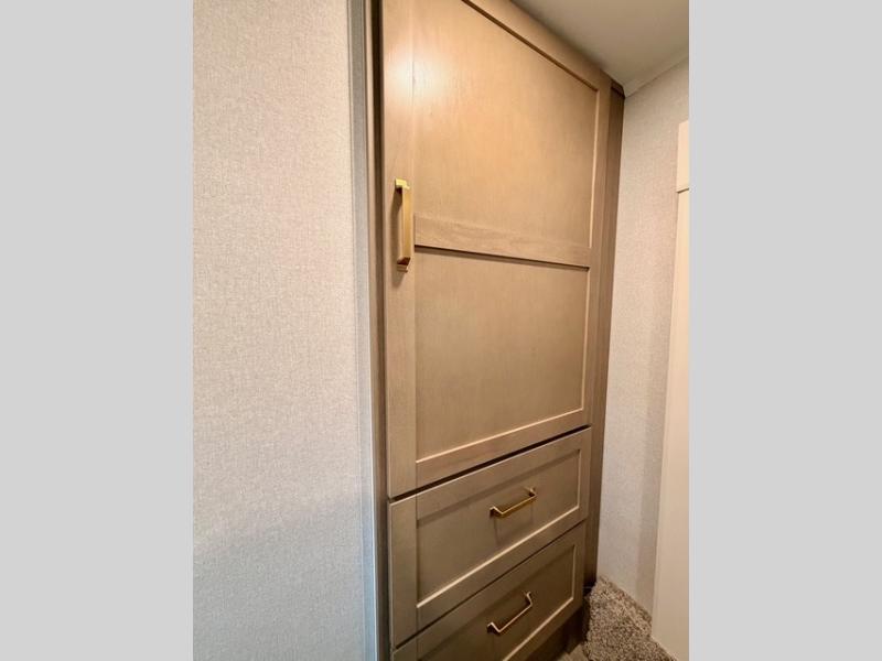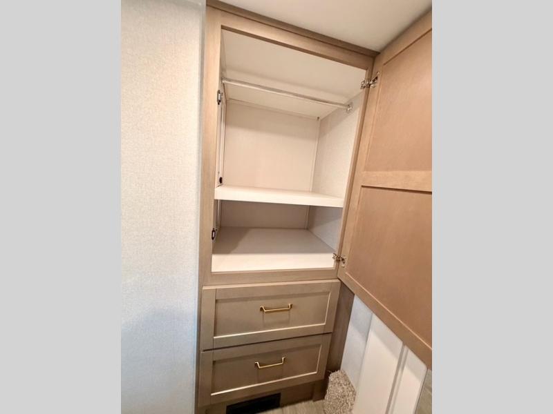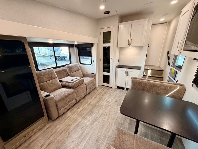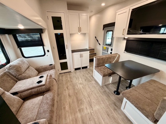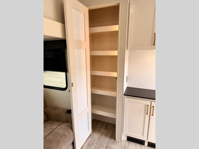 Camping just got a whole lot sweeter in this fifth wheel with double slides, a rear kitchen, and sleeping space for five to six. You'll love waking up each morning in the front private bedroom that includes a queen bed, dual nightstands and overhead cabinets, plus a wardrobe and dresser slide. Your guests who slept on the tri-fold sofa and booth dinette can convert these back to seating space in the morning, and breakfast can be made in the rear kitchen. Here, you'll find ample counter space, a microwave and range, plus a pantry and 12V refrigerator for food storage. Outside, gear can be stored in the pass-thru storage area, and you're sure to enjoy the 16' power awning with LED Lights!