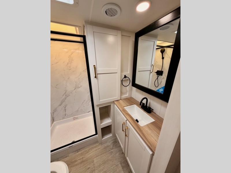 With any Eagle SLE fifth wheel by Jayco, you will enjoy a lighter tow weight, high-end finishes, and the same quality construction you've come to expect from Jayco! There is an Alpha Ply TPO roof membrane, a fully enclosed and heated underbelly, plus Stronghold VBL walls for added durability. There is also a rear 2" towing receiver outside, along with metal slam latch baggage doors, MORryde Step Above entry steps, and a Winegard Air 360 antenna with router prep if you want to stay connected as you camp. Once inside you'll enjoy the handcrafted door/drawer fronts, shower skylight, and residential vinyl flooring throughout with no carpet for an easier clean. The on-demand water heater, 30K BTU furnace, and 15K BTU "Whisper Quiet" A/C will ensure your comfort, and the Overland 1 Solar Package will provide off-grid capabilities!