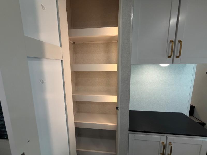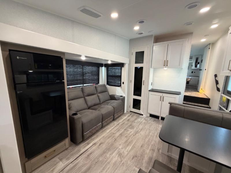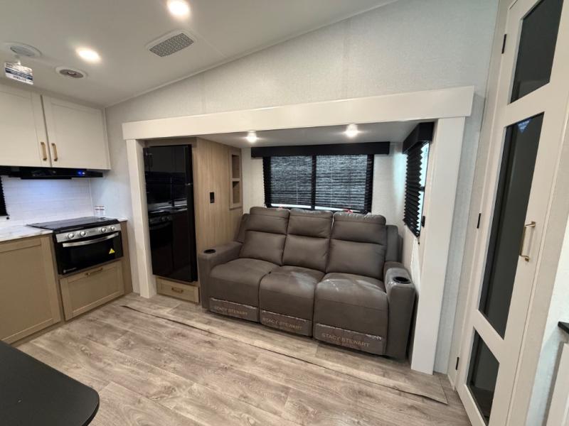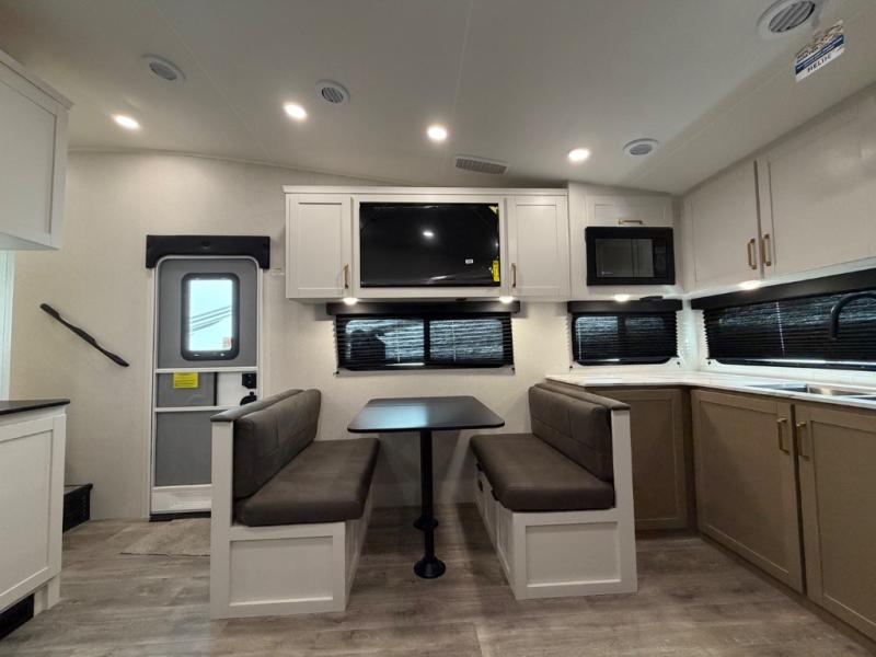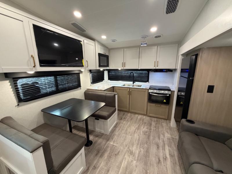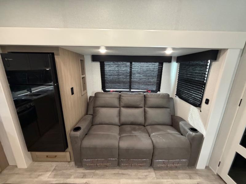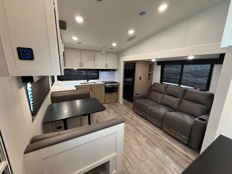 Camping just got a whole lot sweeter in this fifth wheel with double slides, a rear kitchen, and sleeping space for five to six. You'll love waking up each morning in the front private bedroom that includes a queen bed, dual nightstands and overhead cabinets, plus a wardrobe and dresser slide. Your guests who slept on the tri-fold sofa and booth dinette can convert these back to seating space in the morning, and breakfast can be made in the rear kitchen. Here, you'll find ample counter space, a microwave and range, plus a pantry and 12V refrigerator for food storage. Outside, gear can be stored in the pass-thru storage area, and you're sure to enjoy the 16' power awning with LED Lights!