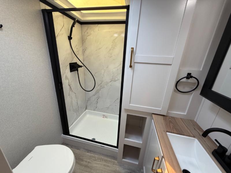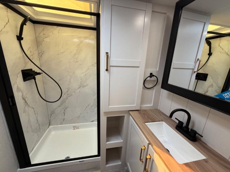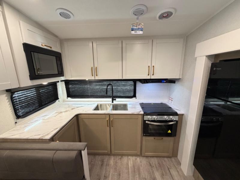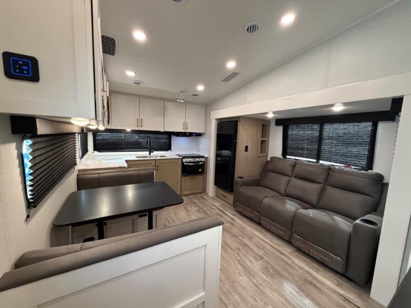 With any Eagle SLE fifth wheel by Jayco, you will enjoy a lighter tow weight, high-end finishes, and the same quality construction you've come to expect from Jayco! There is an Alpha Ply TPO roof membrane, a fully enclosed and heated underbelly, plus Stronghold VBL walls for added durability. There is also a rear 2" towing receiver outside, along with metal slam latch baggage doors, MORryde Step Above entry steps, and a Winegard Air 360 antenna with router prep if you want to stay connected as you camp. Once inside you'll enjoy the handcrafted door/drawer fronts, shower skylight, and residential vinyl flooring throughout with no carpet for an easier clean. The on-demand water heater, 30K BTU furnace, and 15K BTU "Whisper Quiet" A/C will ensure your comfort, and the Overland 1 Solar Package will provide off-grid capabilities!