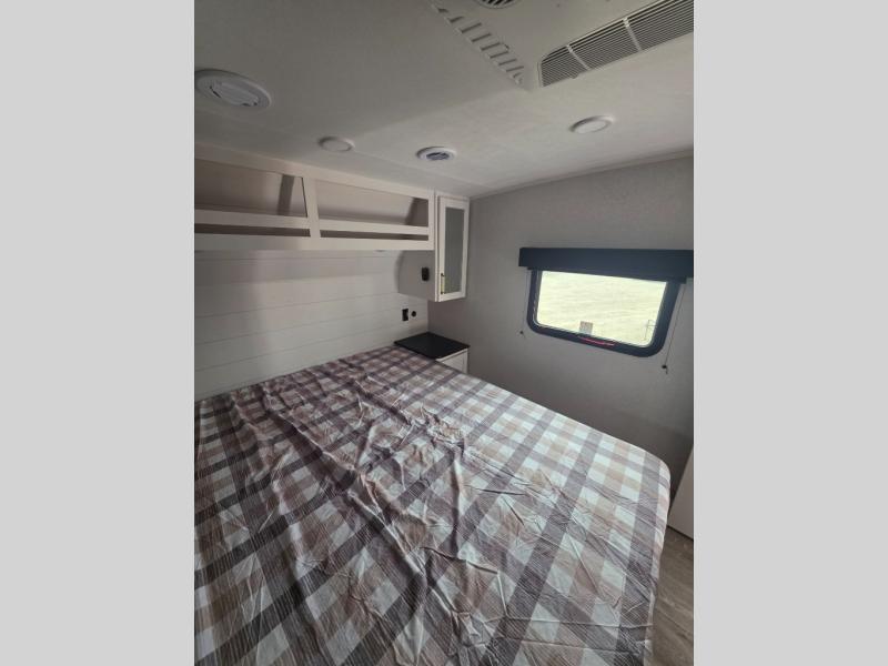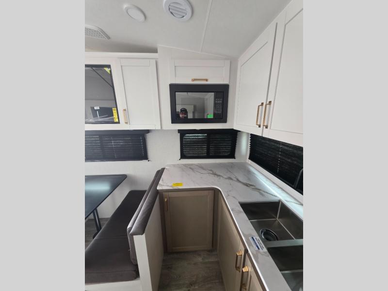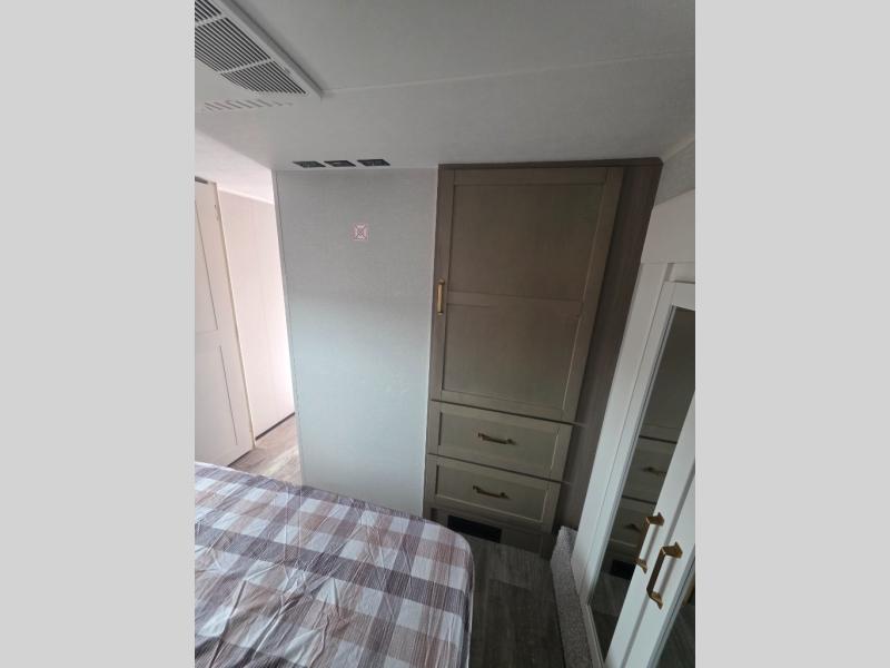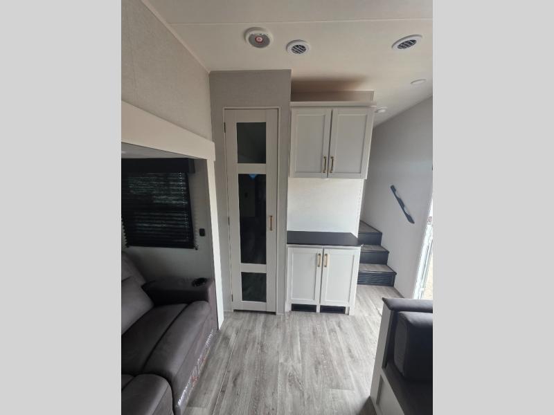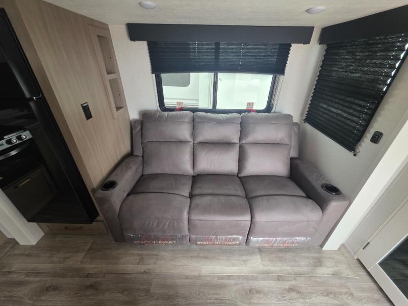 Camping just got a whole lot sweeter in this fifth wheel with double slides, a rear kitchen, and sleeping space for five to six. You'll love waking up each morning in the front private bedroom that includes a queen bed, dual nightstands and overhead cabinets, plus a wardrobe and dresser slide. Your guests who slept on the tri-fold sofa and booth dinette can convert these back to seating space in the morning, and breakfast can be made in the rear kitchen. Here, you'll find ample counter space, a microwave and range, plus a pantry and 12V refrigerator for food storage. Outside, gear can be stored in the pass-thru storage area, and you're sure to enjoy the 16' power awning with LED Lights!