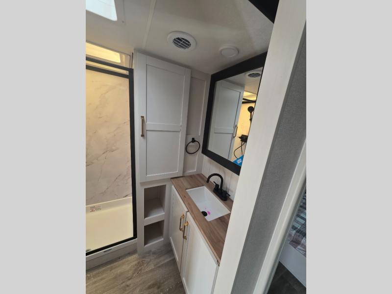 With any Eagle SLE fifth wheel by Jayco, you will enjoy a lighter tow weight, high-end finishes, and the same quality construction you've come to expect from Jayco! There is an Alpha Ply TPO roof membrane, a fully enclosed and heated underbelly, plus Stronghold VBL walls for added durability. There is also a rear 2" towing receiver outside, along with metal slam latch baggage doors, MORryde Step Above entry steps, and a Winegard Air 360 antenna with router prep if you want to stay connected as you camp. Once inside you'll enjoy the handcrafted door/drawer fronts, shower skylight, and residential vinyl flooring throughout with no carpet for an easier clean. The on-demand water heater, 30K BTU furnace, and 15K BTU "Whisper Quiet" A/C will ensure your comfort, and the Overland 1 Solar Package will provide off-grid capabilities!