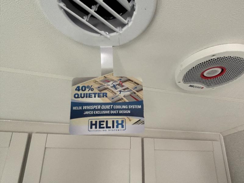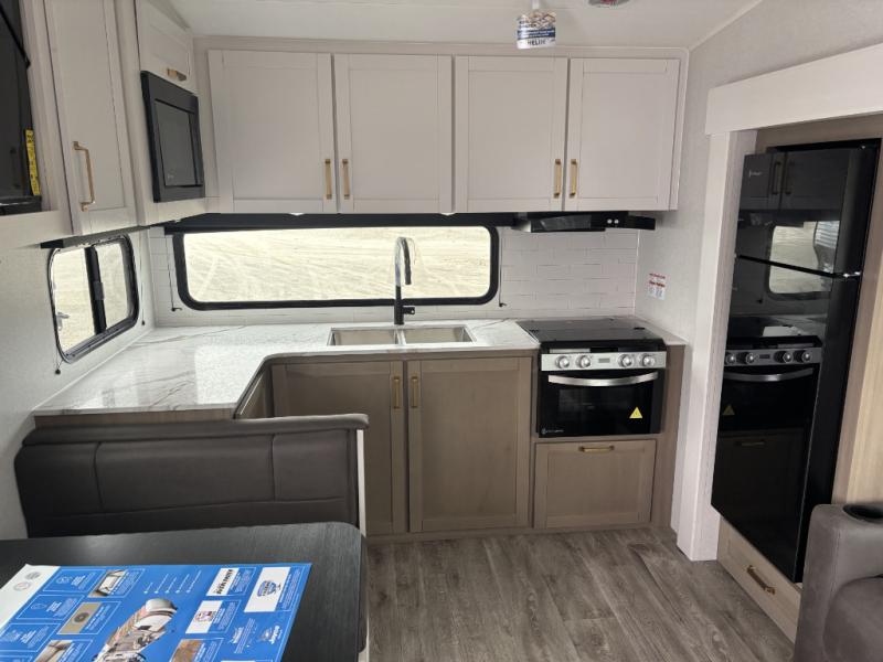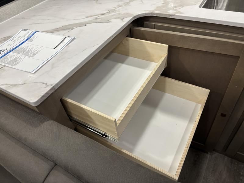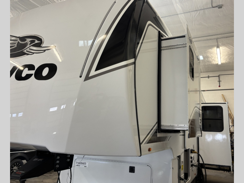With any Eagle SLE fifth wheel by Jayco, you will enjoy a lighter tow weight, high-end finishes, and the same quality construction you've come to expect from Jayco! There is an Alpha Ply TPO roof membrane, a fully enclosed and heated underbelly, plus Stronghold VBL walls for added durability. There is also a rear 2" towing receiver outside, along with metal slam latch baggage doors, MORryde Step Above entry steps, and a Winegard Air 360 antenna with router prep if you want to stay connected as you camp. Once inside you'll enjoy the handcrafted door/drawer fronts, shower skylight, and residential vinyl flooring throughout with no carpet for an easier clean. The on-demand water heater, 30K BTU furnace, and 15K BTU "Whisper Quiet" A/C will ensure your comfort, and the Overland 1 Solar Package will provide off-grid capabilities!