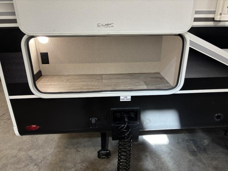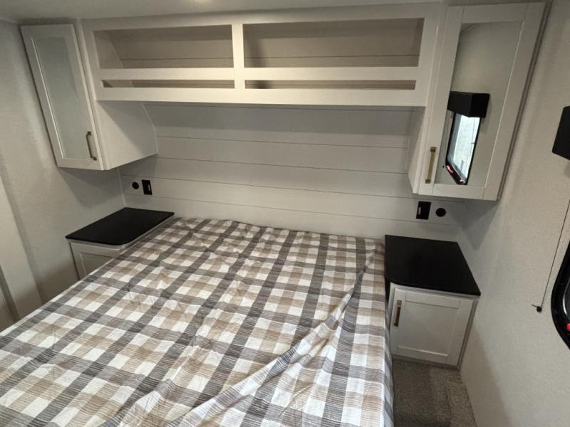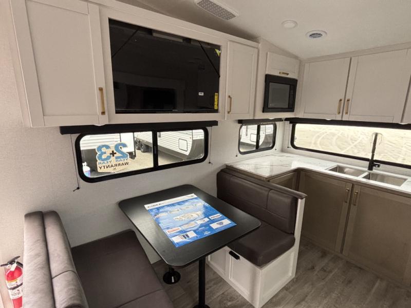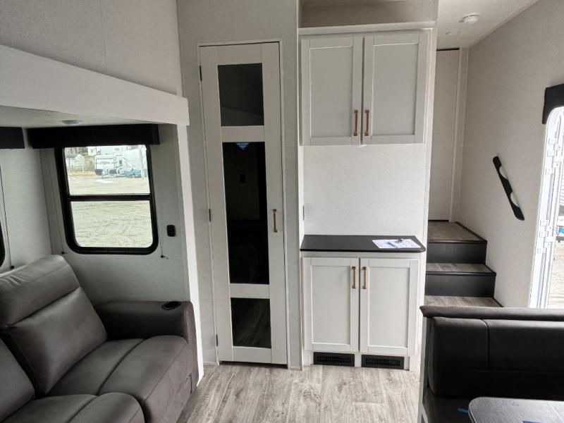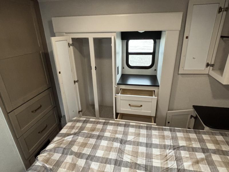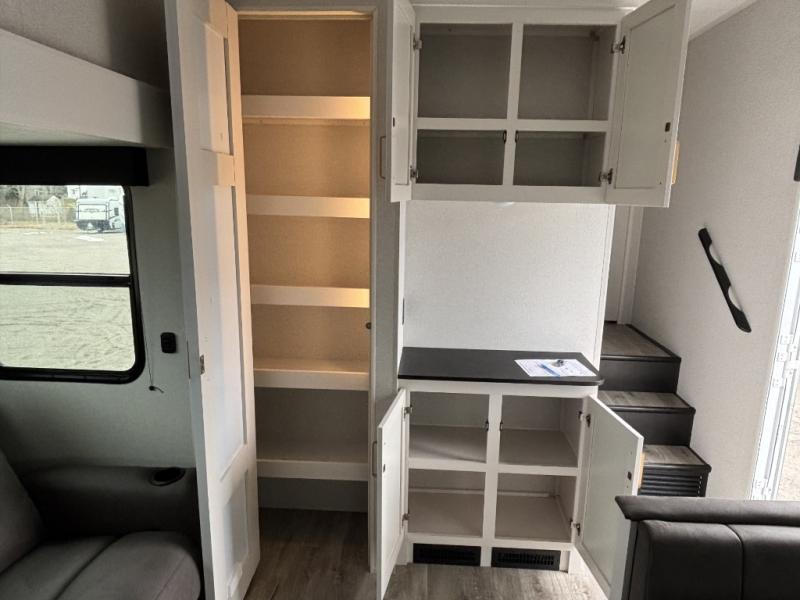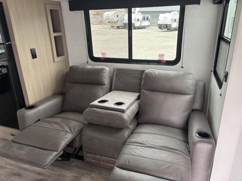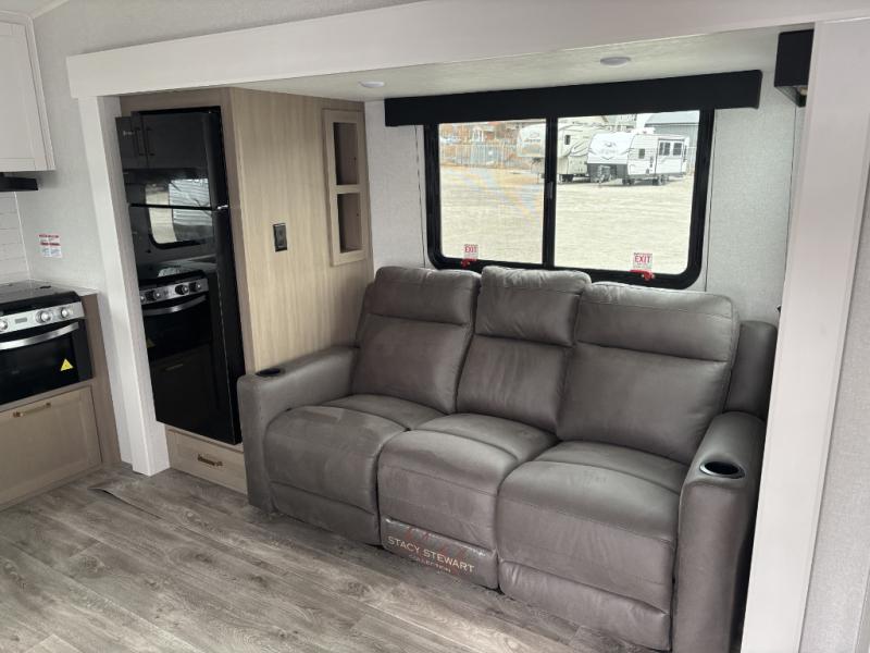 Camping just got a whole lot sweeter in this fifth wheel with double slides, a rear kitchen, and sleeping space for five to six. You'll love waking up each morning in the front private bedroom that includes a queen bed, dual nightstands and overhead cabinets, plus a wardrobe and dresser slide. Your guests who slept on the tri-fold sofa and booth dinette can convert these back to seating space in the morning, and breakfast can be made in the rear kitchen. Here, you'll find ample counter space, a microwave and range, plus a pantry and 12V refrigerator for food storage. Outside, gear can be stored in the pass-thru storage area, and you're sure to enjoy the 16' power awning with LED Lights!