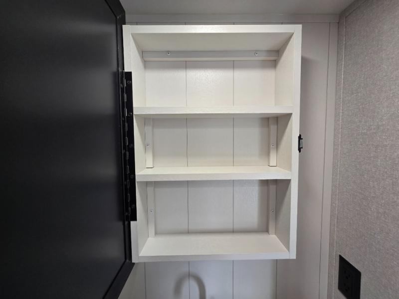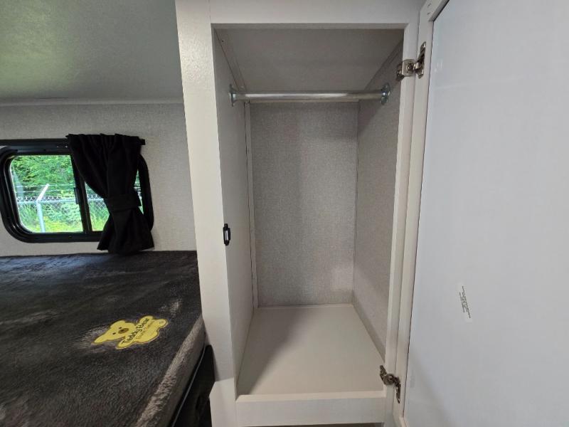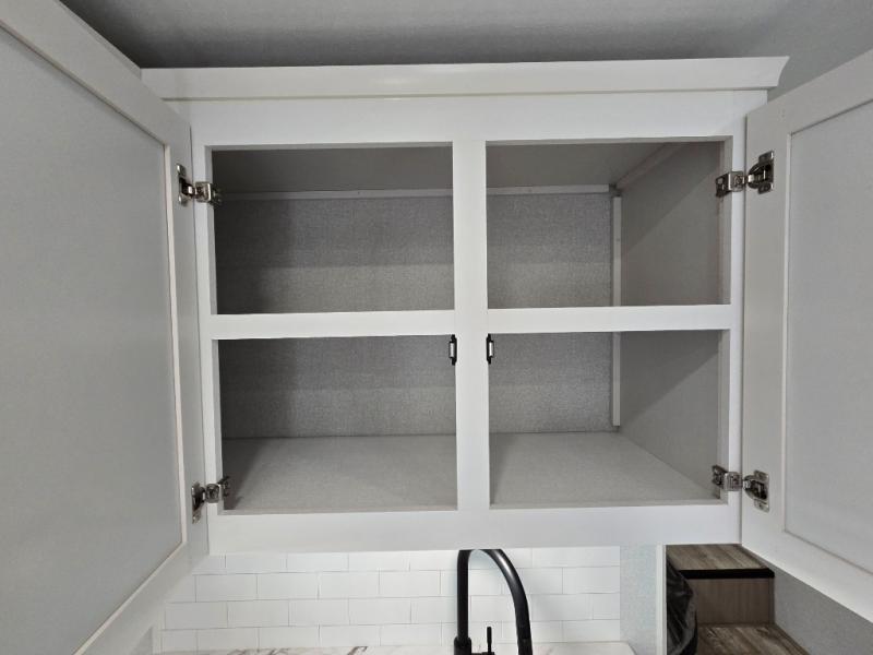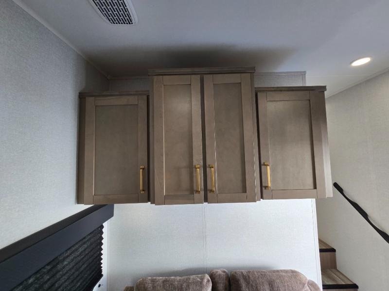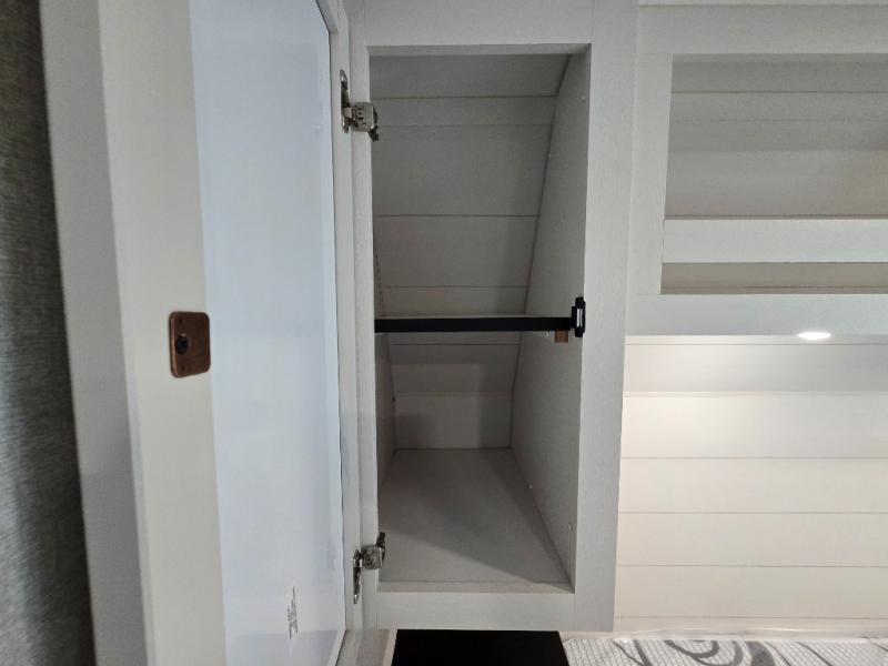 Efficient storage with overhead cabinets and bunkhouse wardrobe.