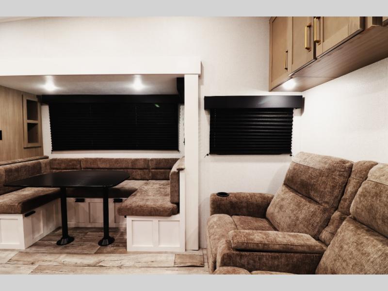 Optional Add-ons: ducted bedroom A/C, LED fireplace, electric rear stabilizers, theater seating, free-standing table & bench – perfect to personalize your experience.